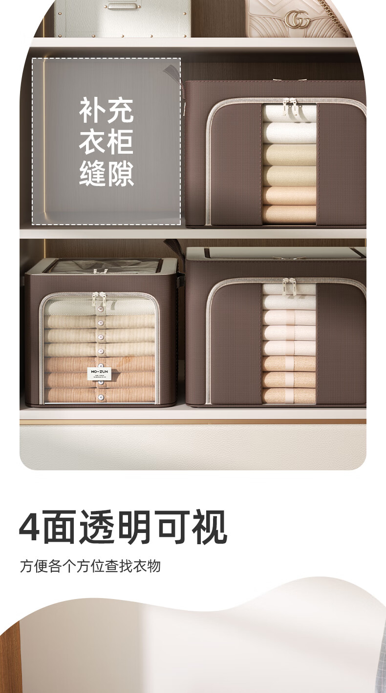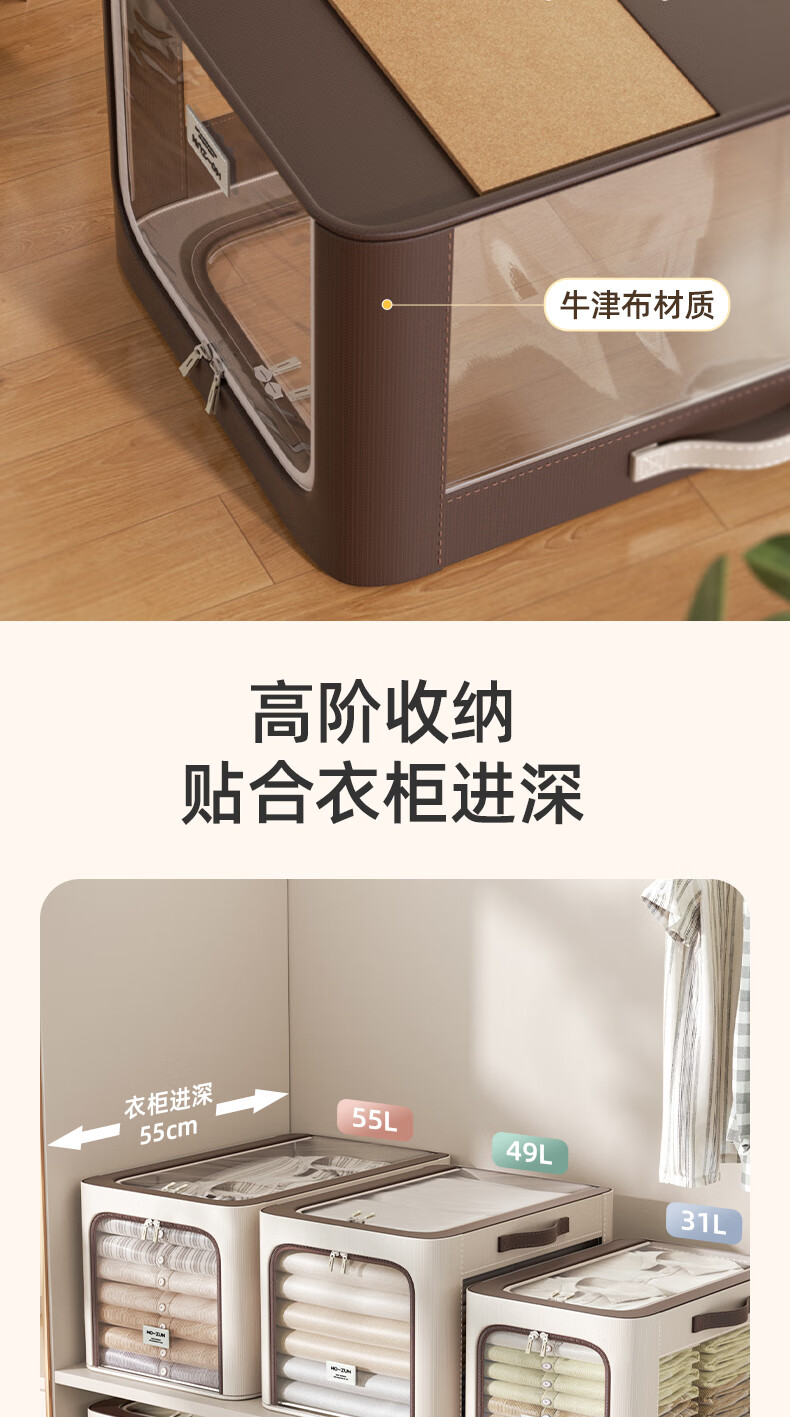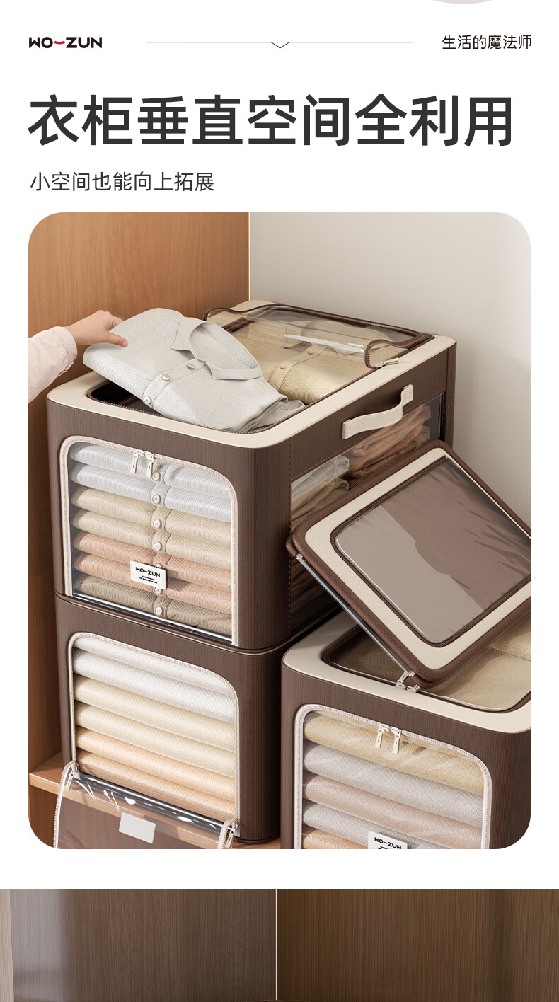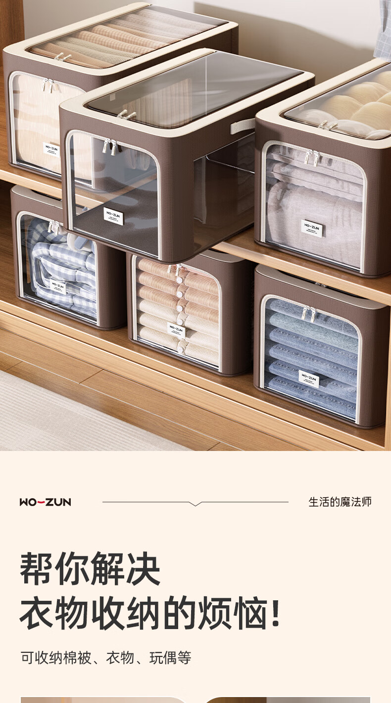 沃尊衣柜衣服收纳箱收纳盒牛津布整理箱透明升级窄长型夹缝衣物储物盒 米色特大号55L【加粗钢架】55*35*30cm