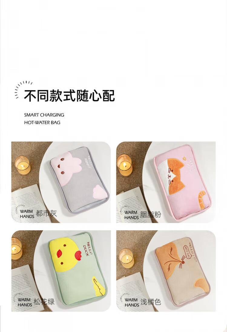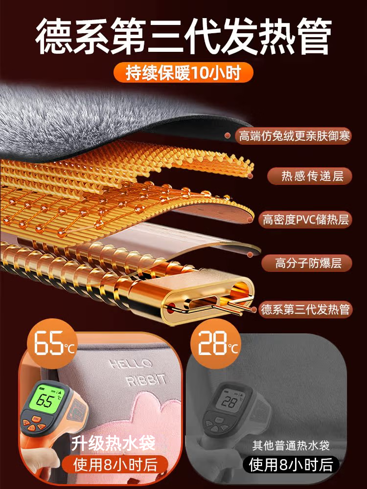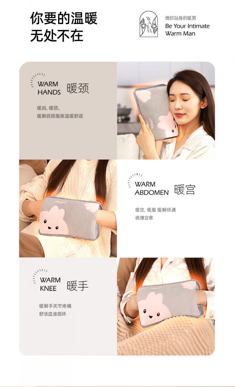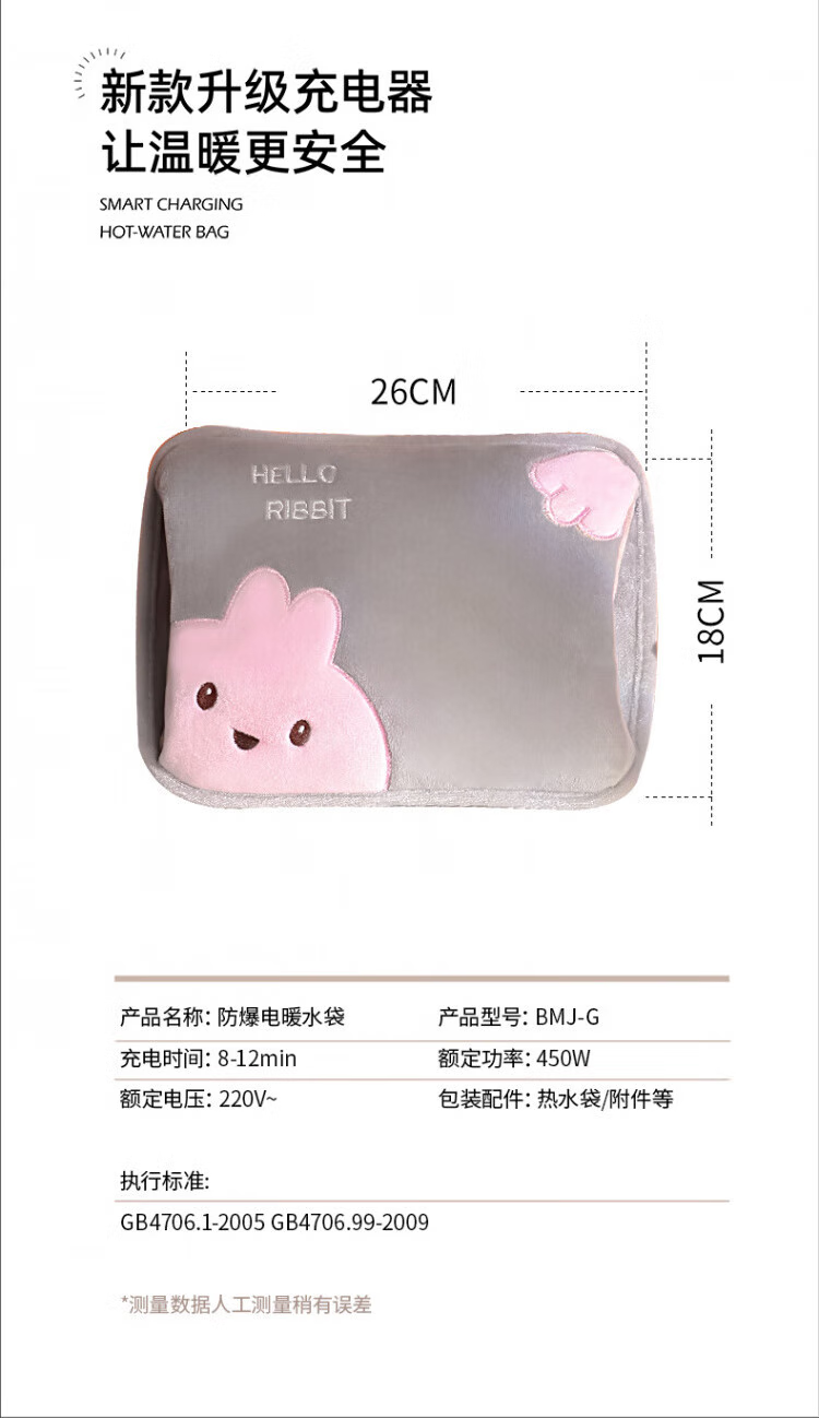WCZ德国热水袋充电暖手袋可爱暖手宝煖宝宝电暖宝2025新款热敷电热宝 【保暖双插手/灰】小乖兔-兔毛暖绒-智能防爆