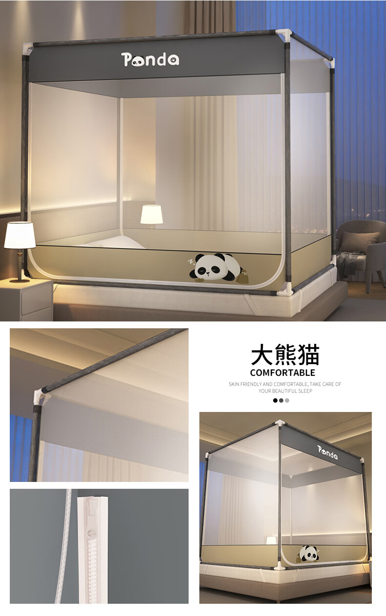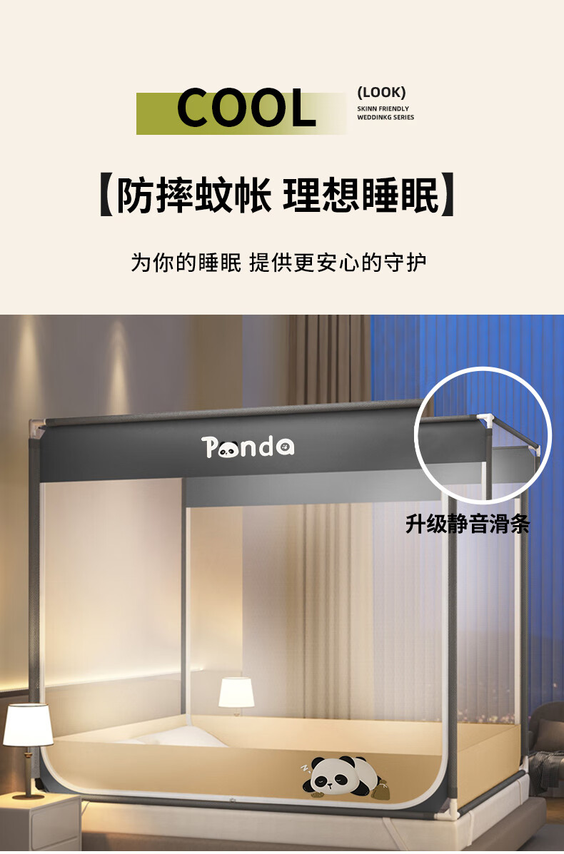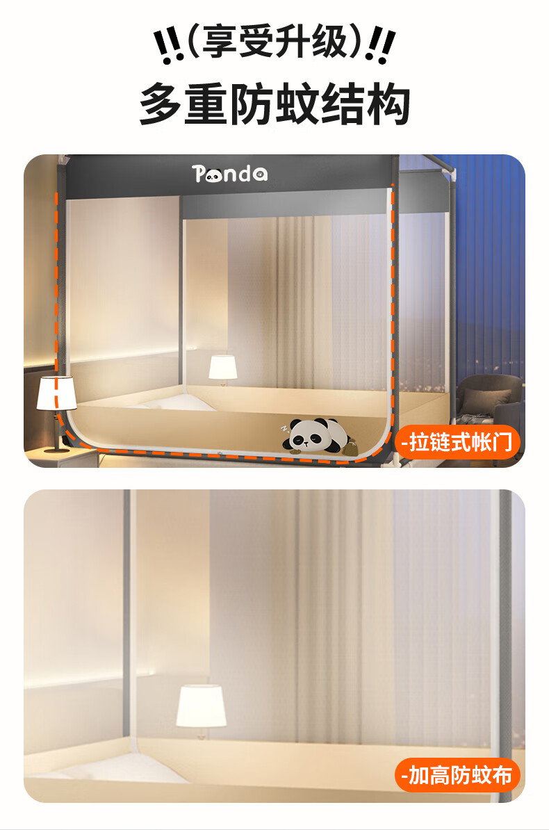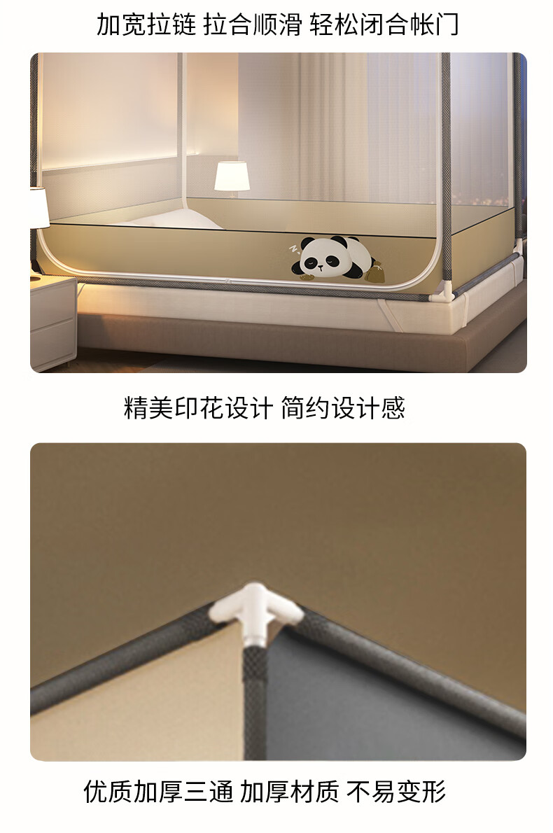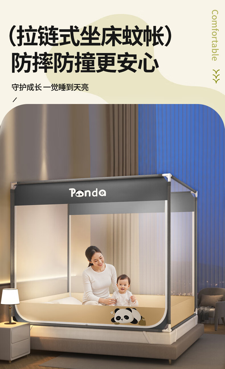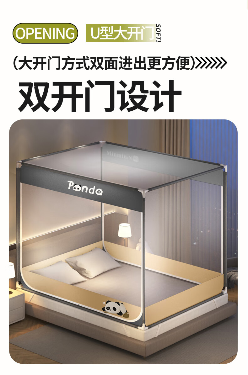 澳乐防摔蚊帐儿童婴儿床蚊帐家用一体防掉拉链式回底单双开门蚊帐 双门半底熊猫图案【1.5mx2m】