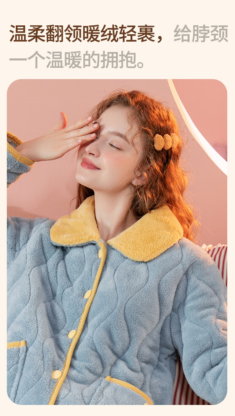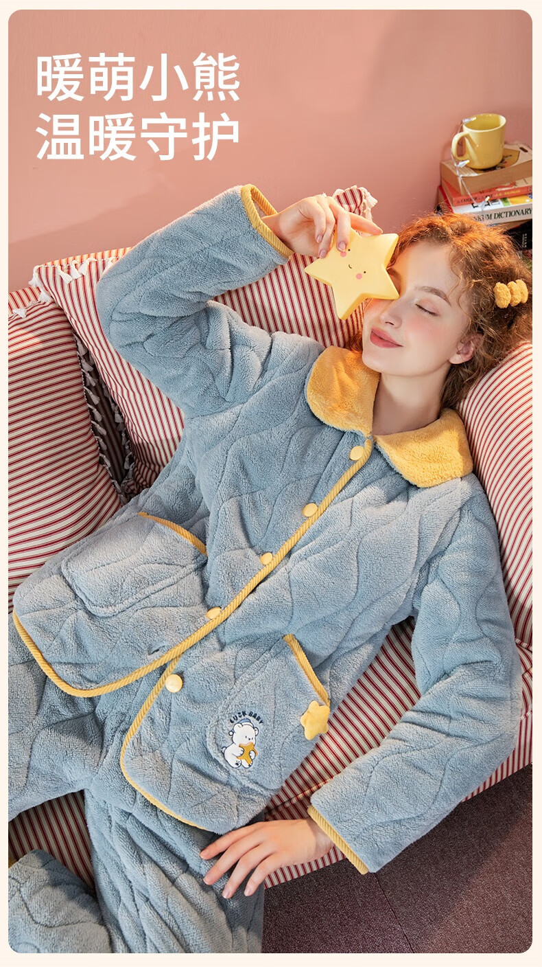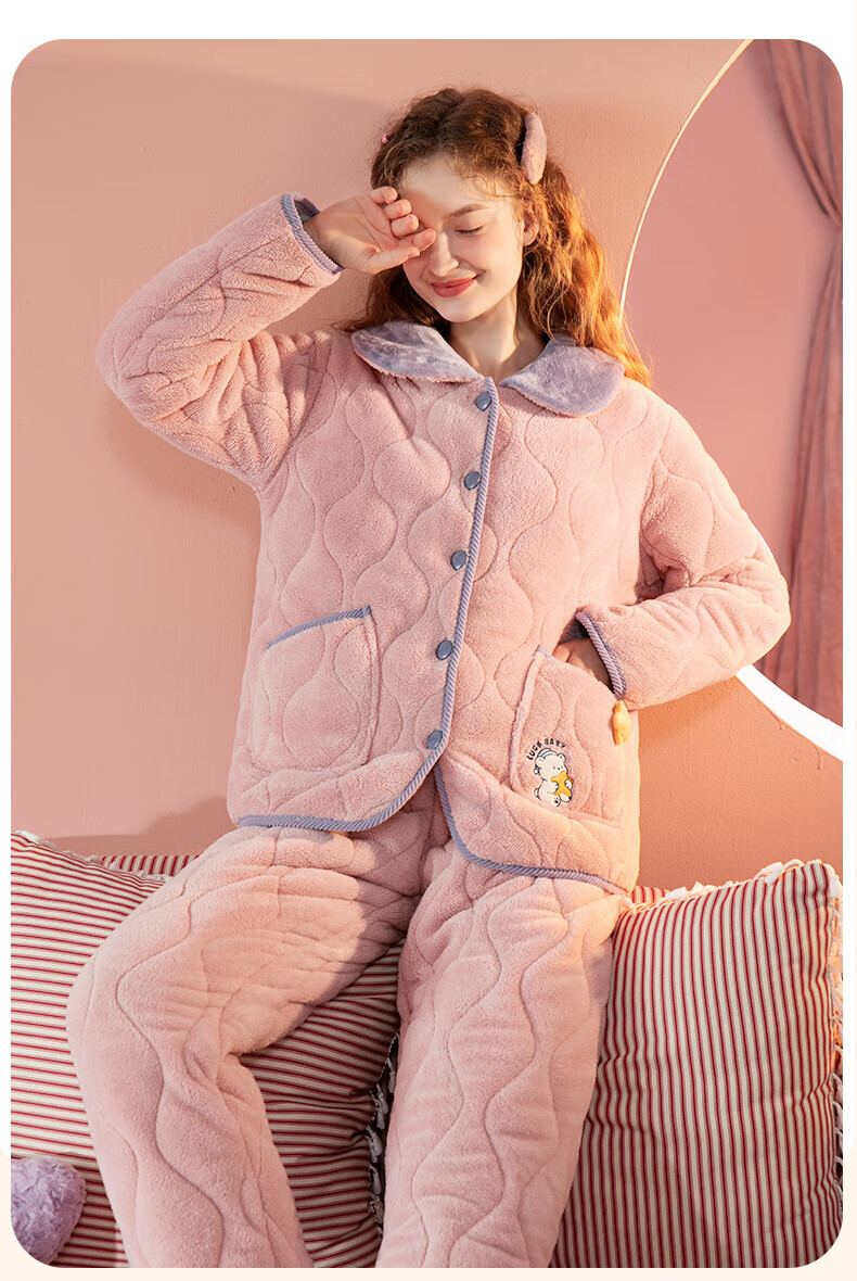 芬腾睡衣女【三层夹棉】秋冬暖绒翻领星星小熊保暖长袖家居服套装 暖粉 XL