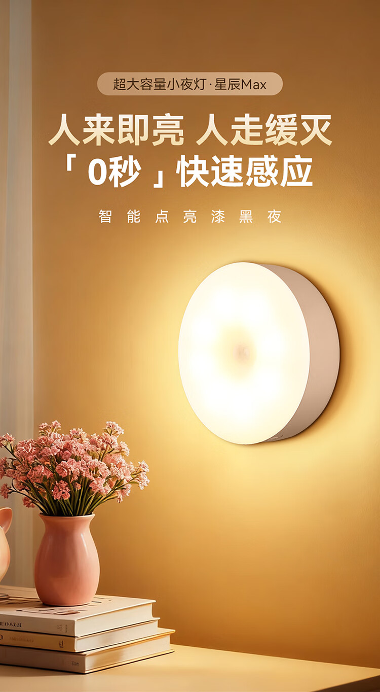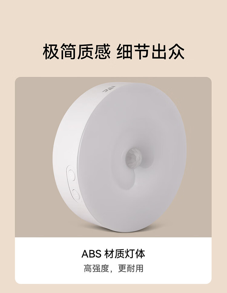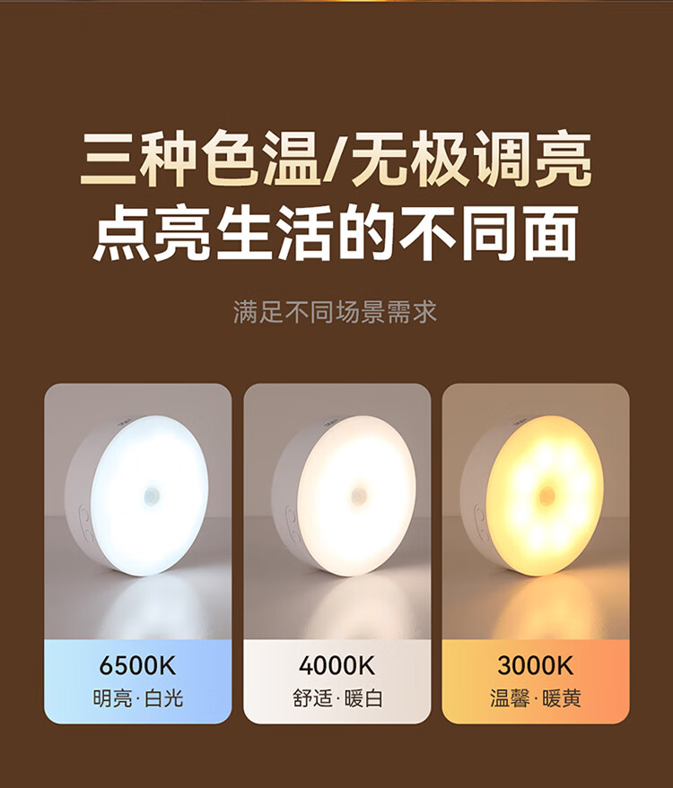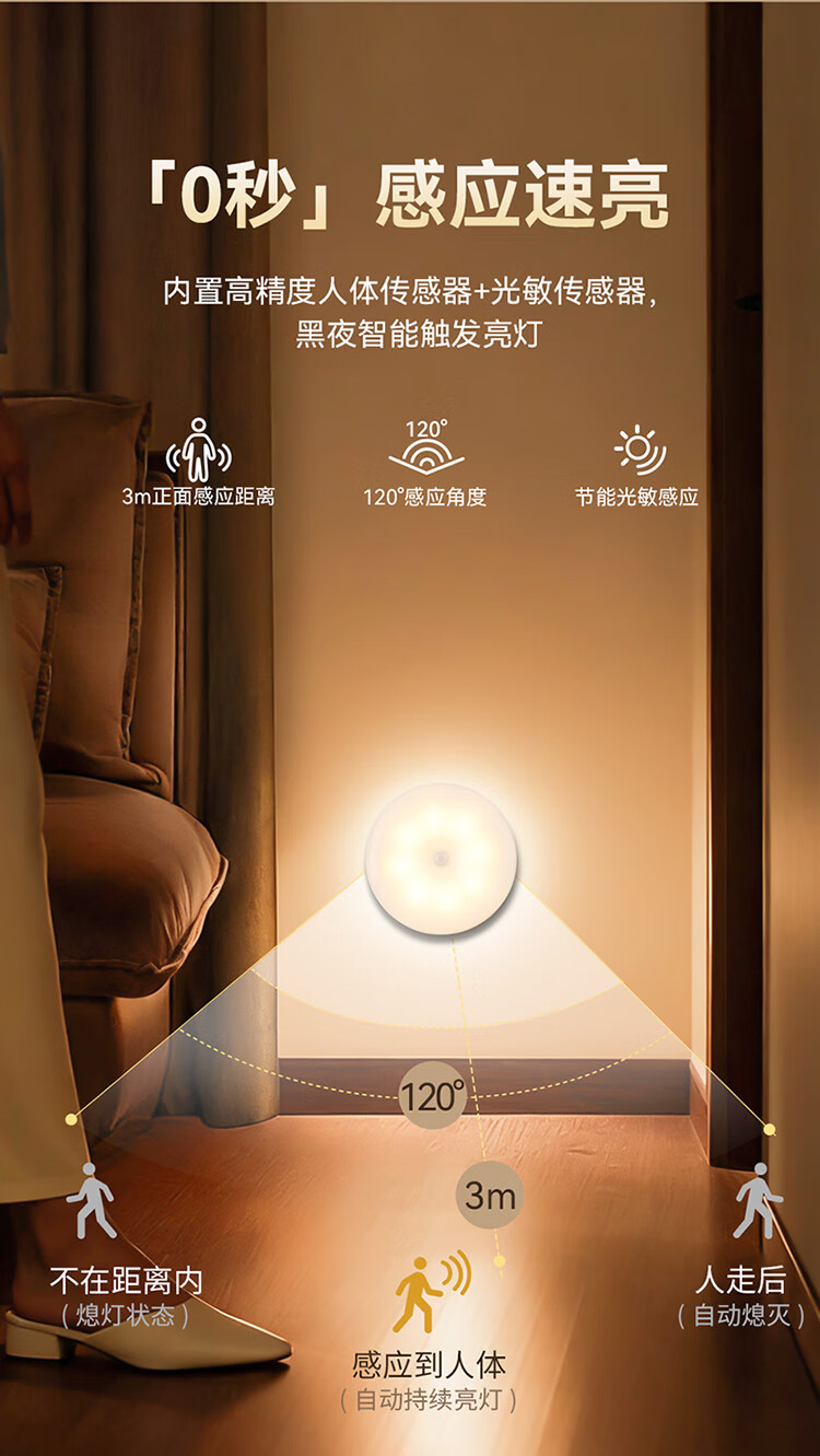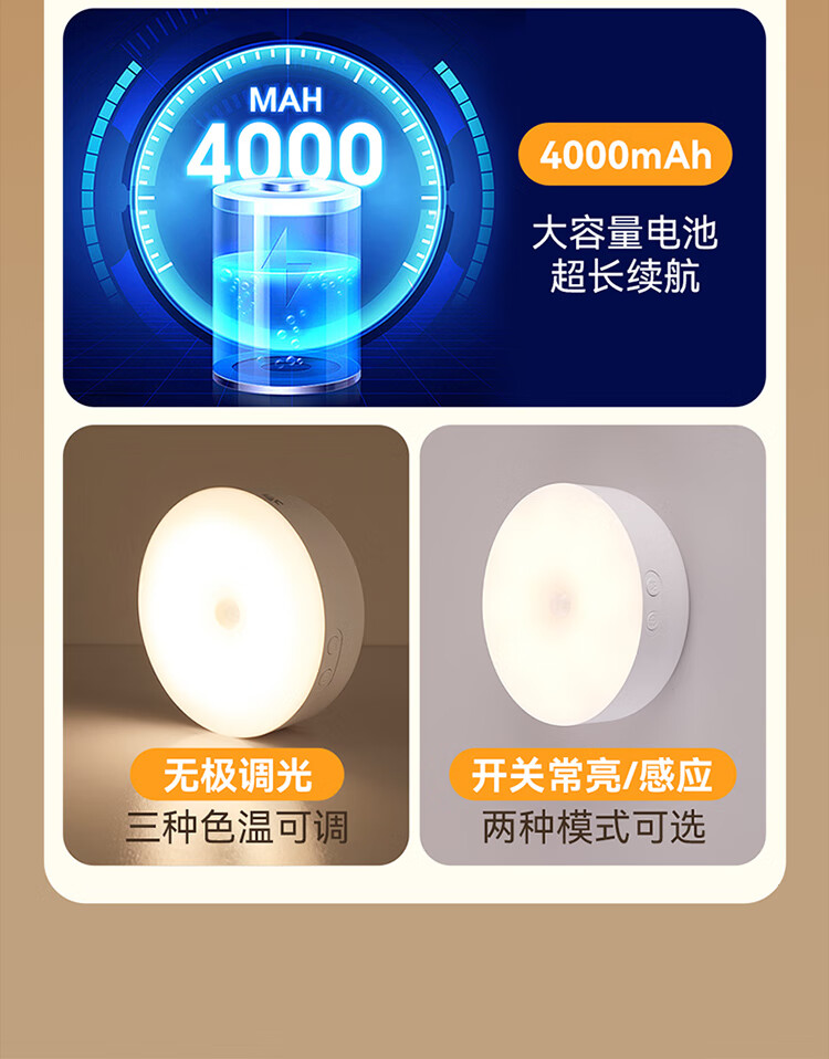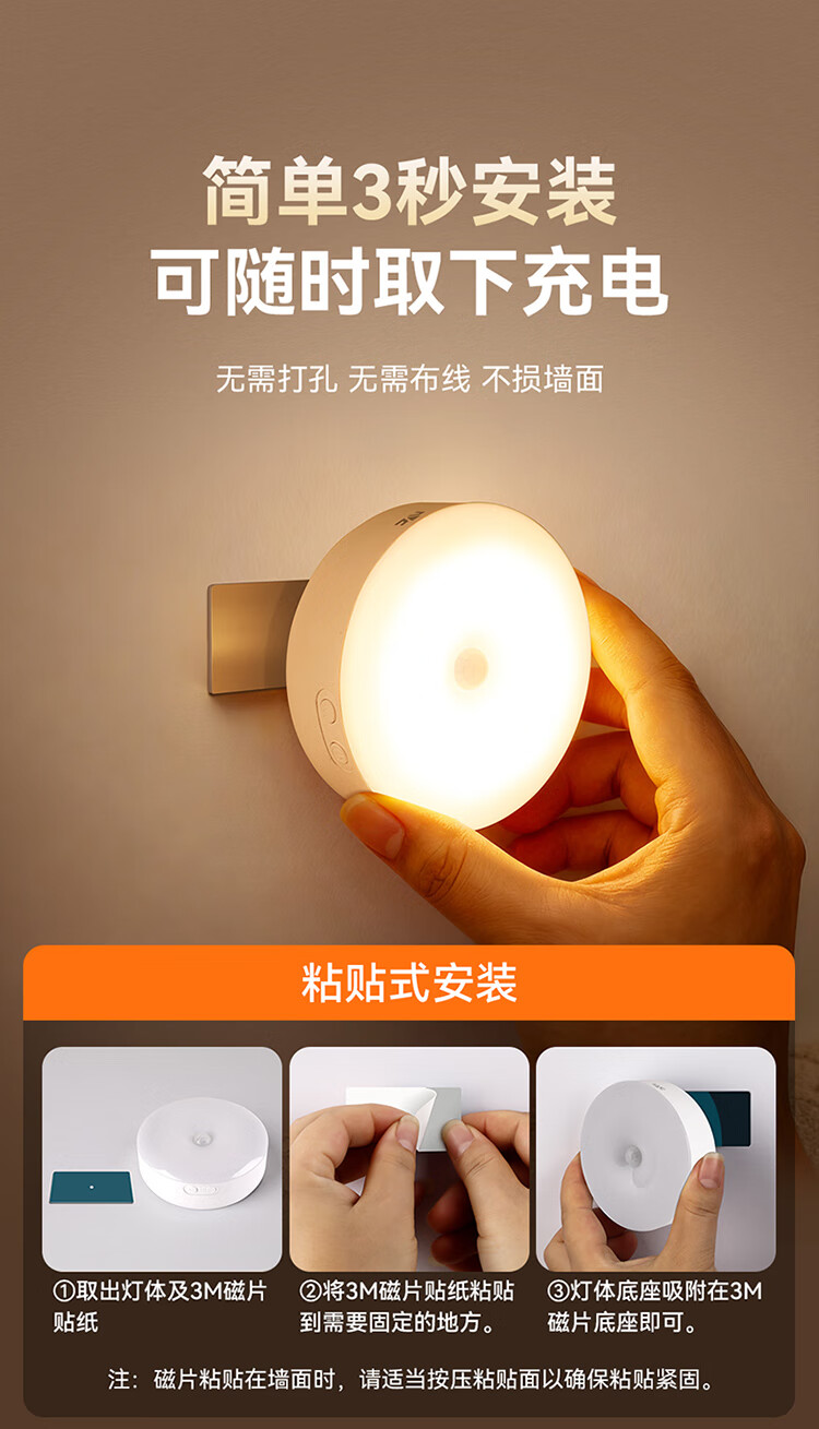 雷士照明无线人体感应小夜灯人来即亮家用过道走廊卧室睡眠充电灯大容量 4000毫安电池+三色光|无极调光