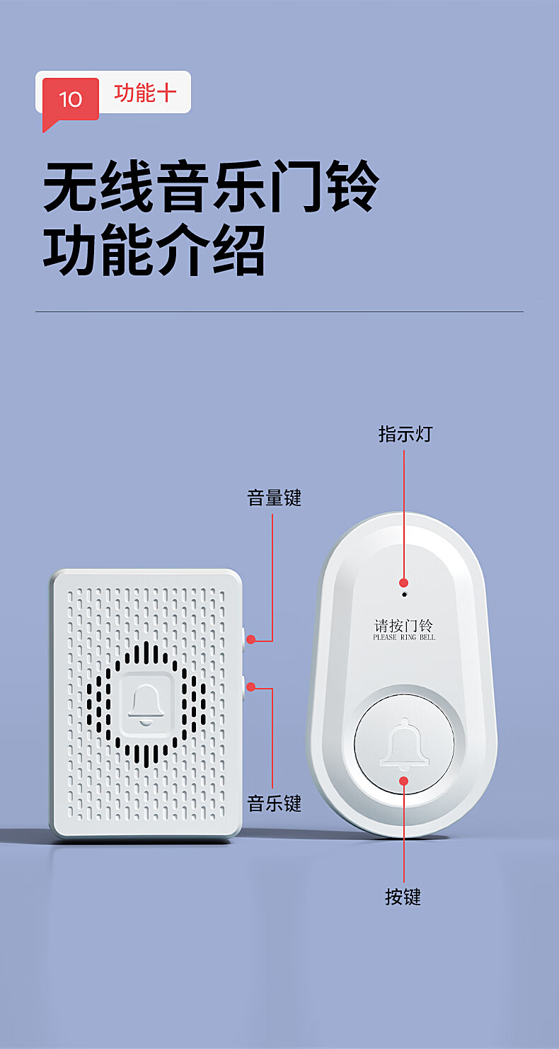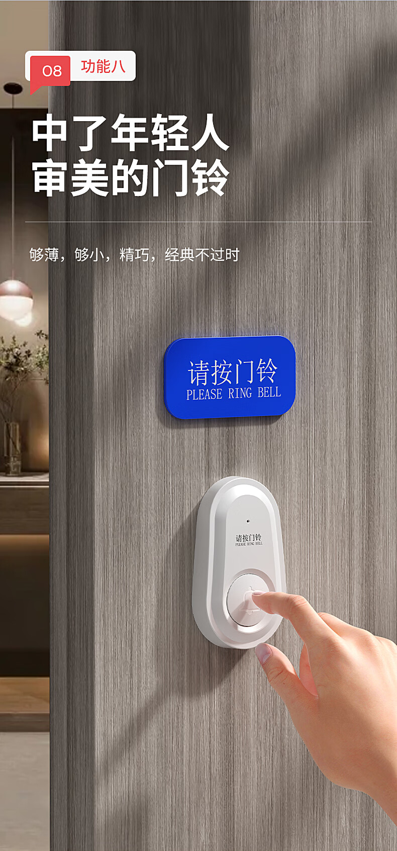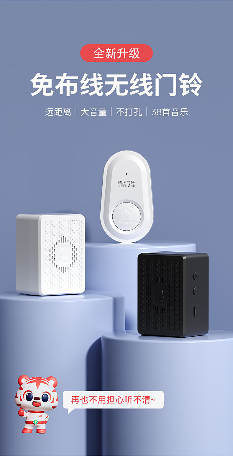 FDD国际电工无线门铃家用距离远声音大黏贴即用免插电穿透力强老人紧急呼叫器 充电款白色【一个按键+一个响铃】
