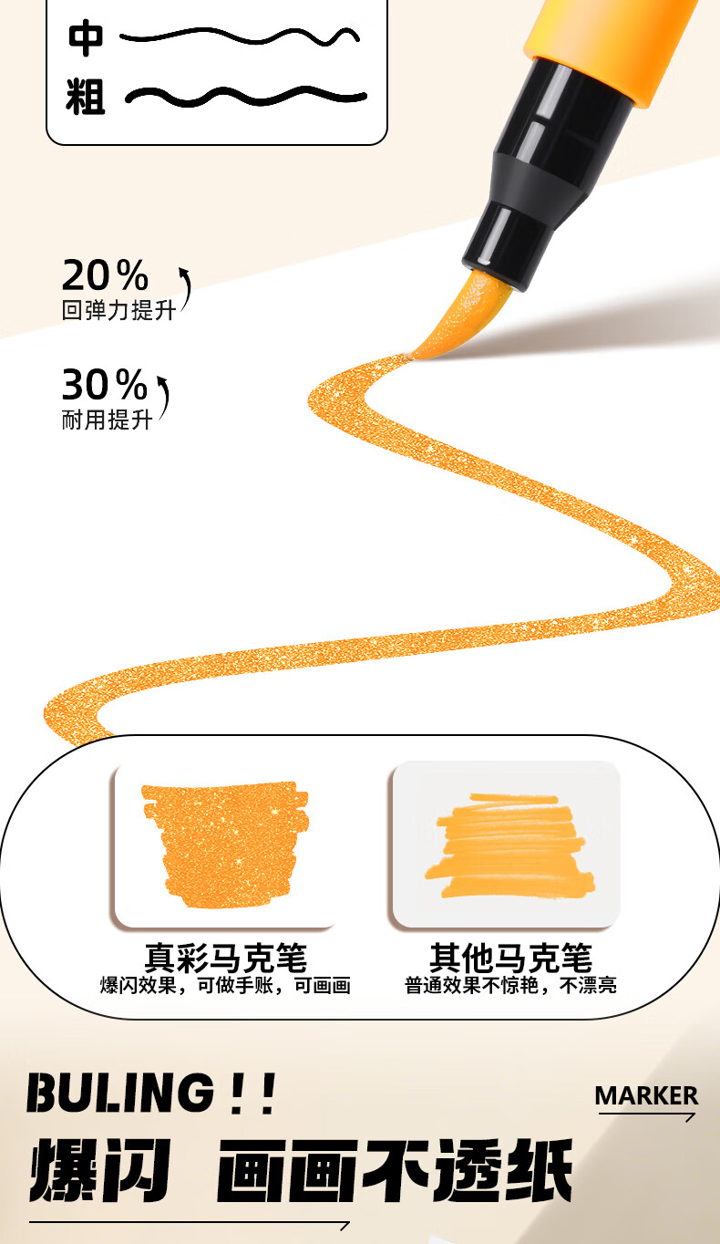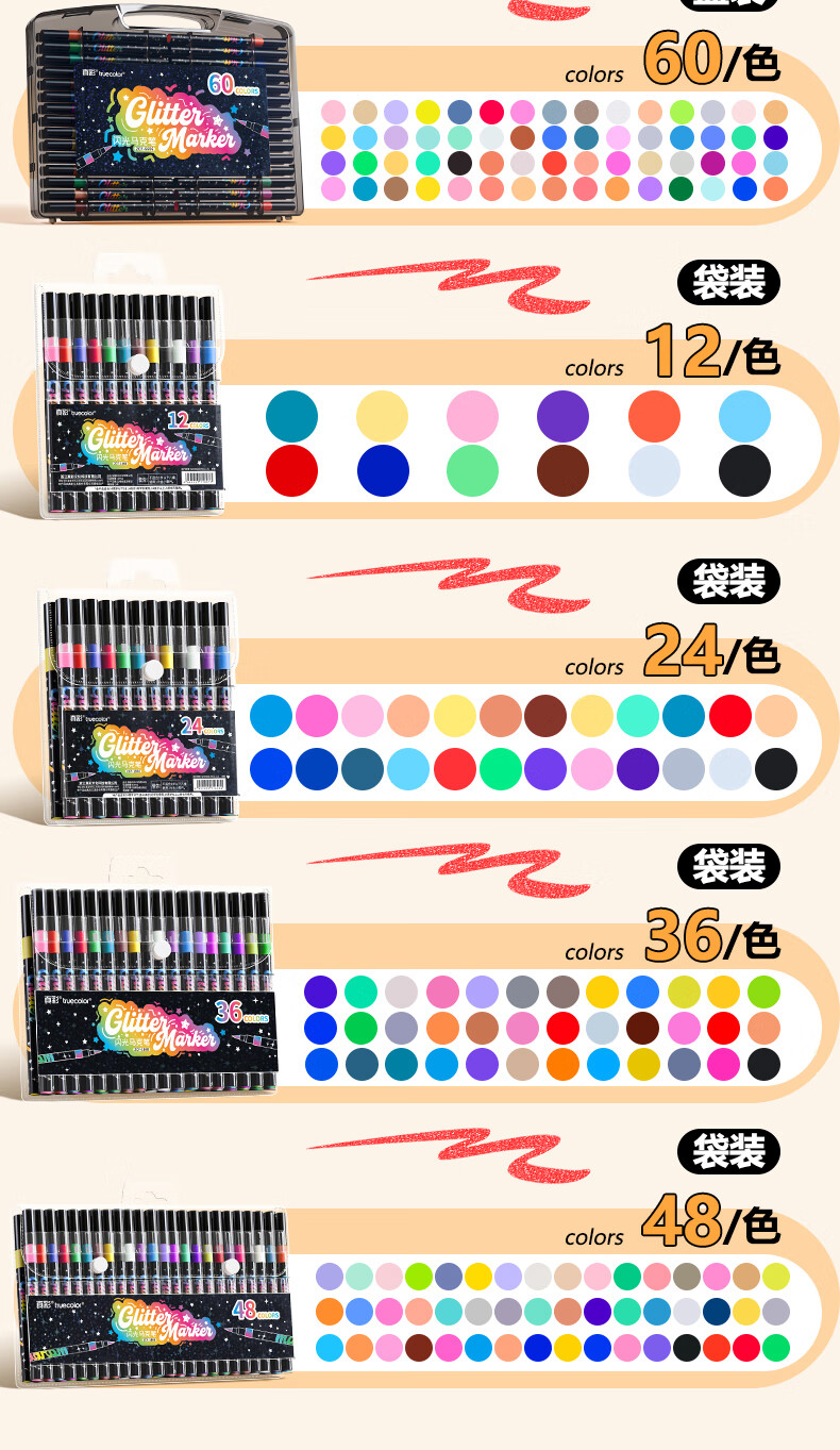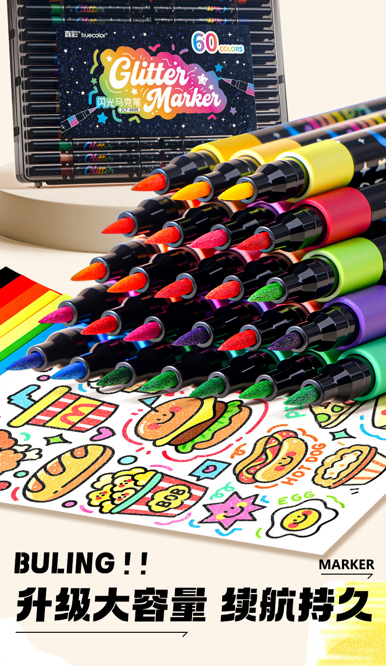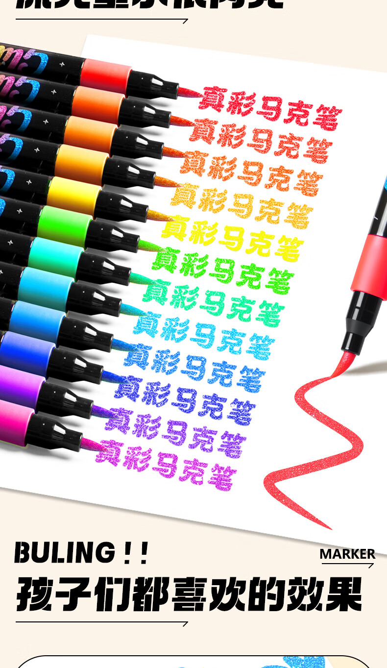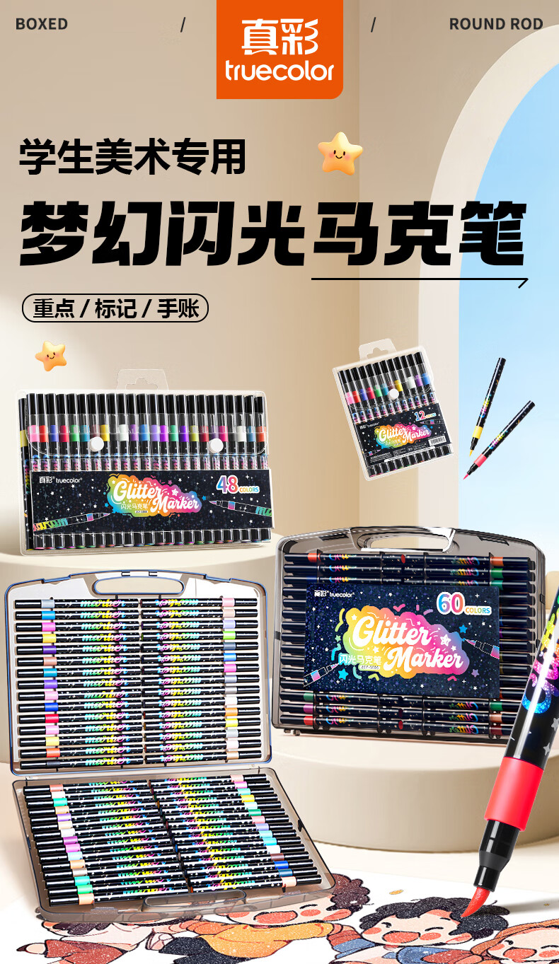 真彩(TRUECOLOR)12色闪光软头马克笔小学生美术专用幼儿园画画不透色可叠色爆闪水性彩色笔儿童无毒款珠光流沙6606