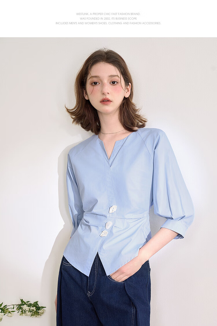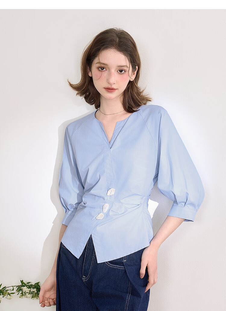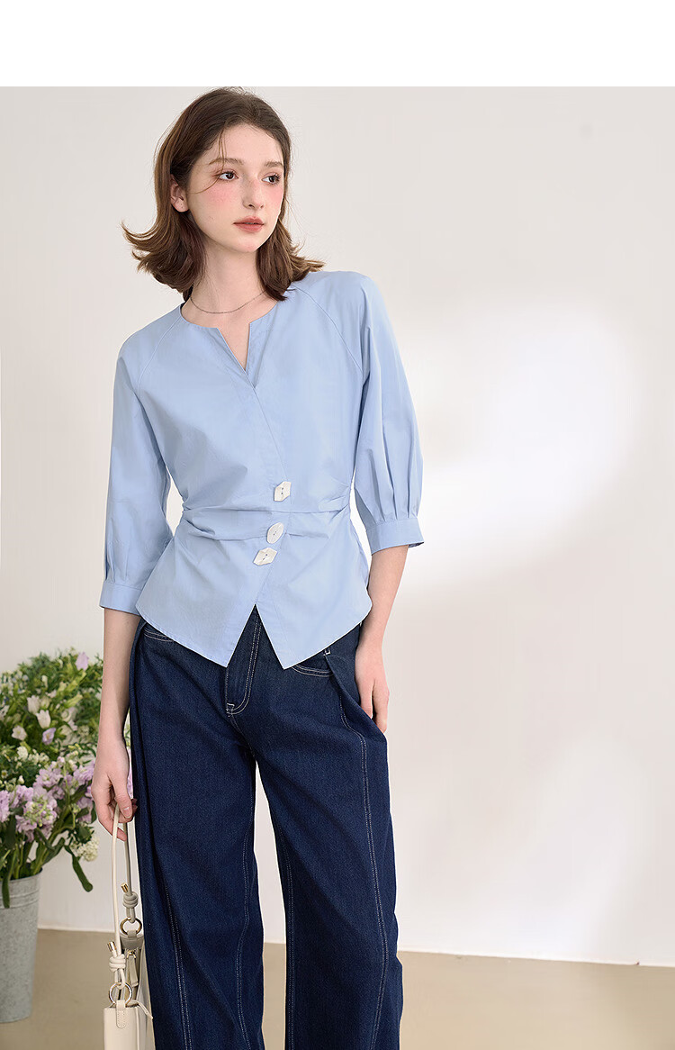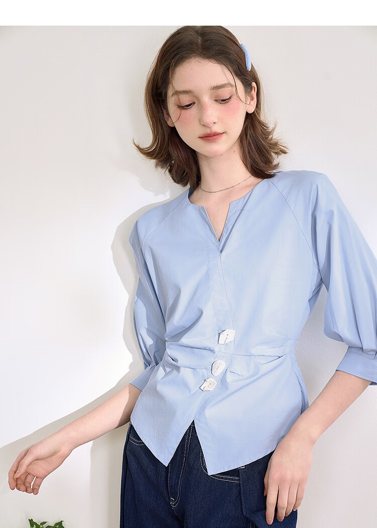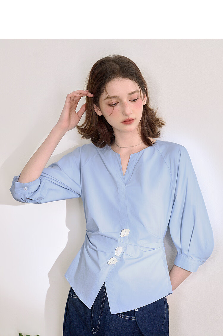 西遇【不规则扣子】设计感V领插肩袖衬衫女捏褶收腰衬衣 蓝色 S (155)
