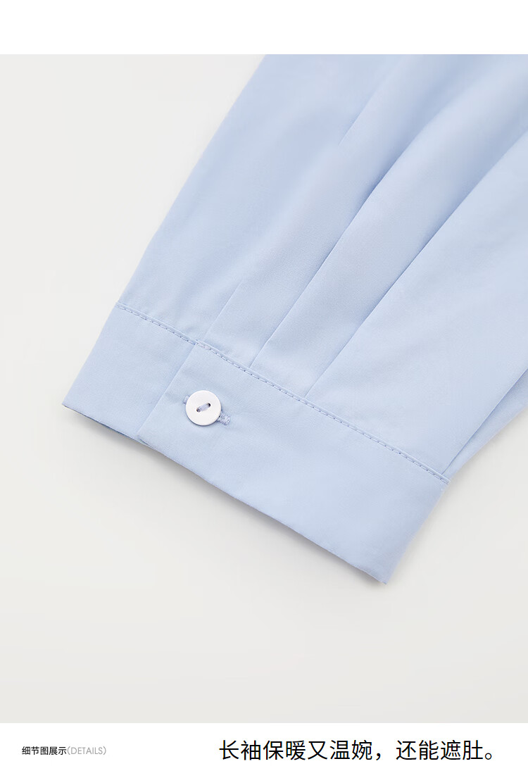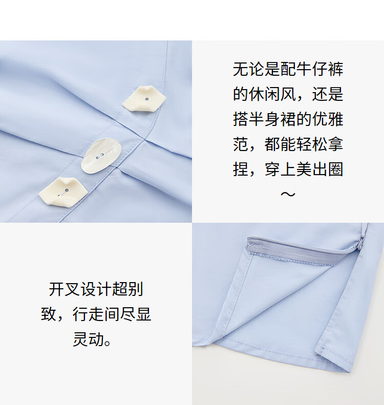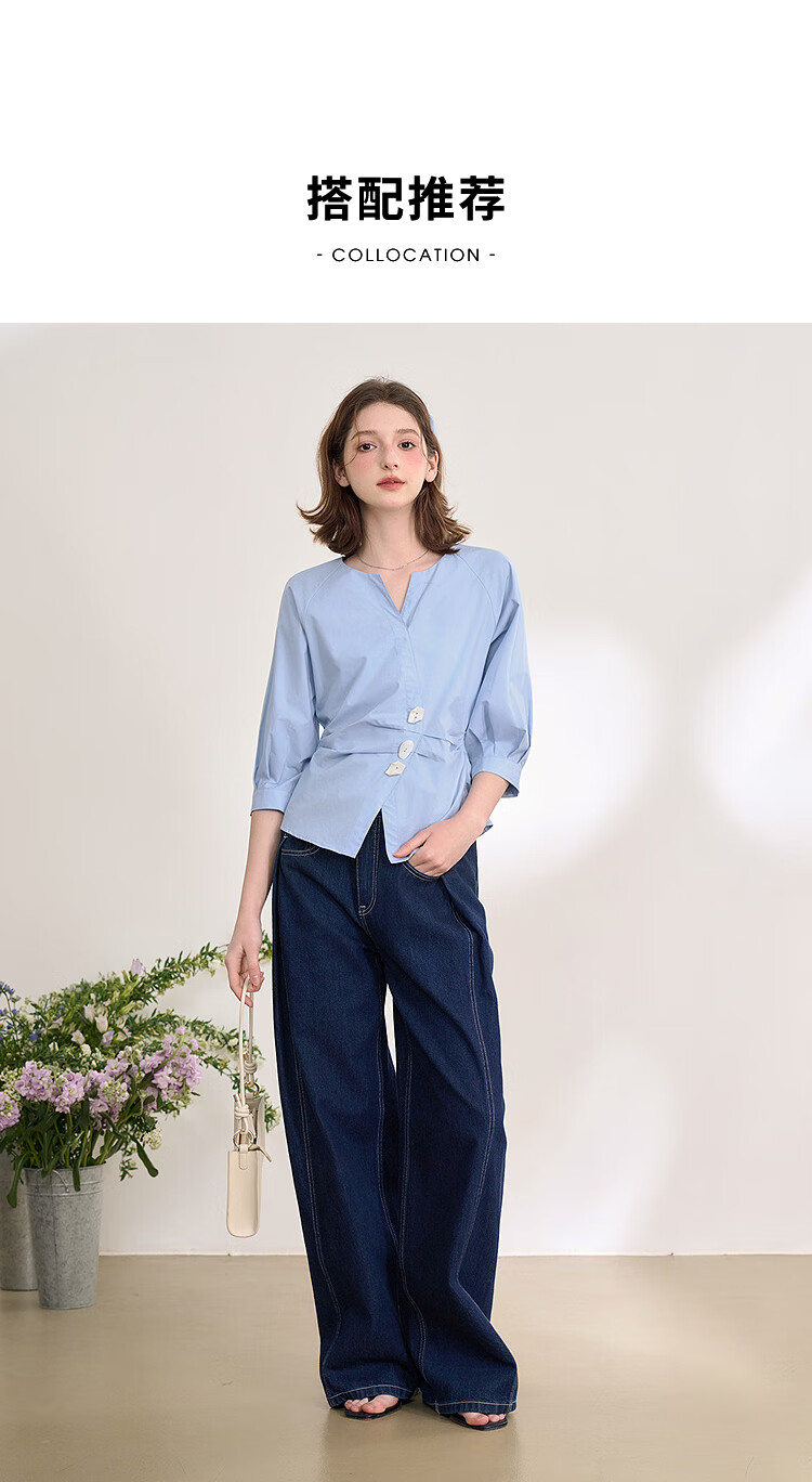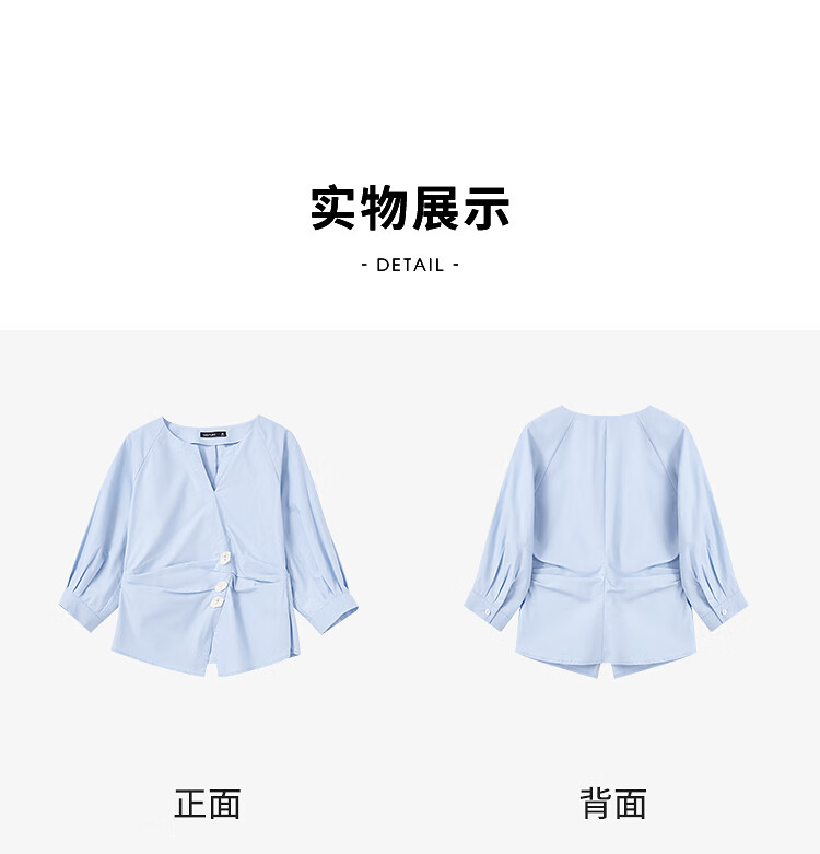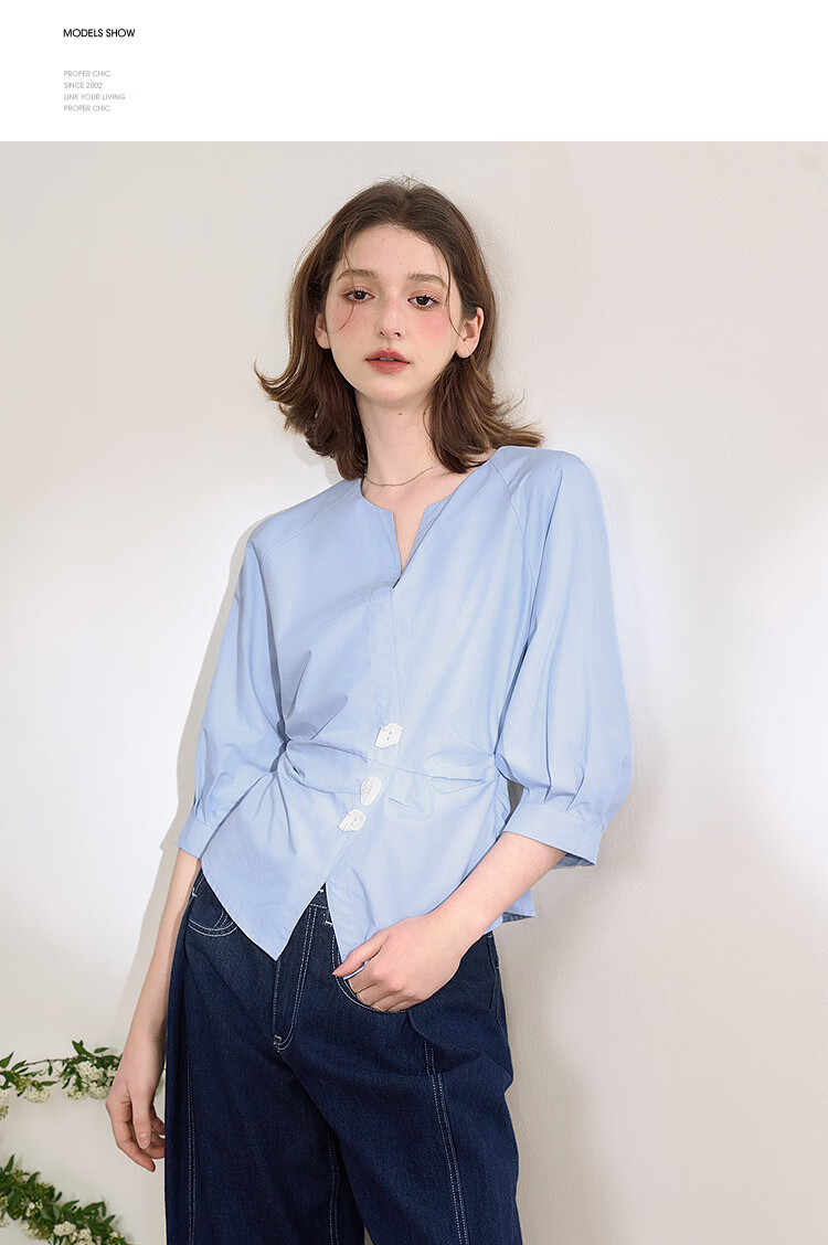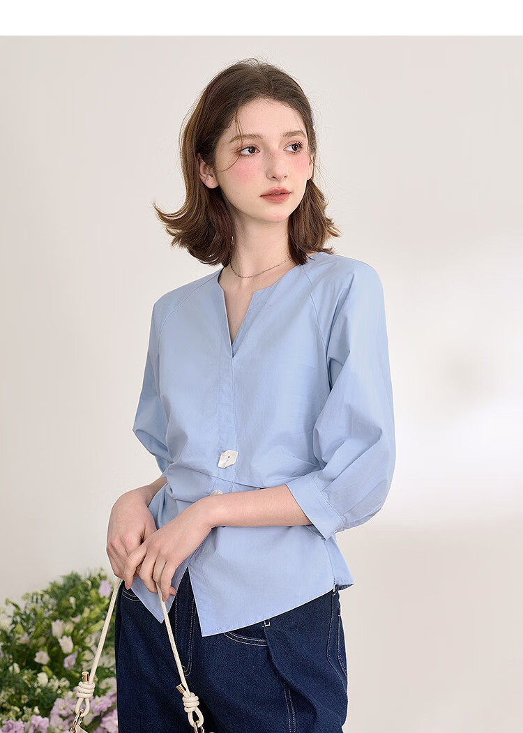 西遇【不规则扣子】设计感V领插肩袖衬衫女捏褶收腰衬衣 蓝色 S (155)