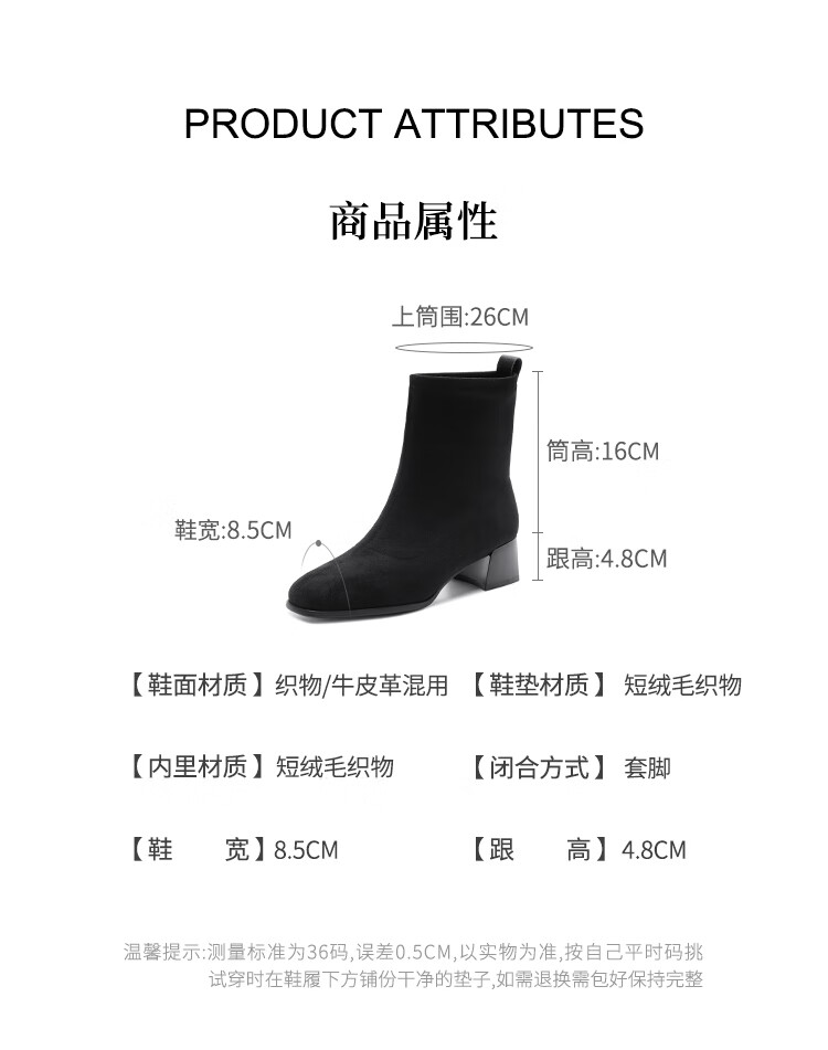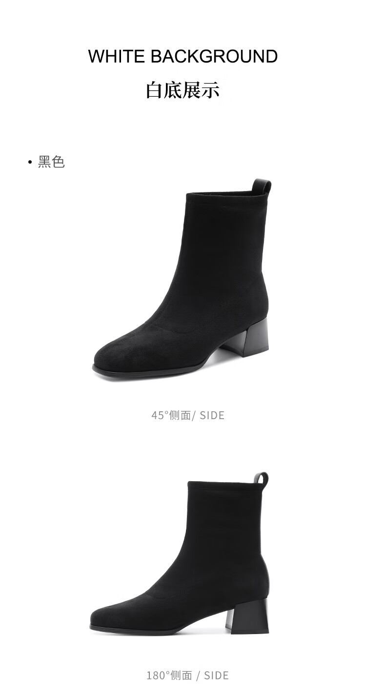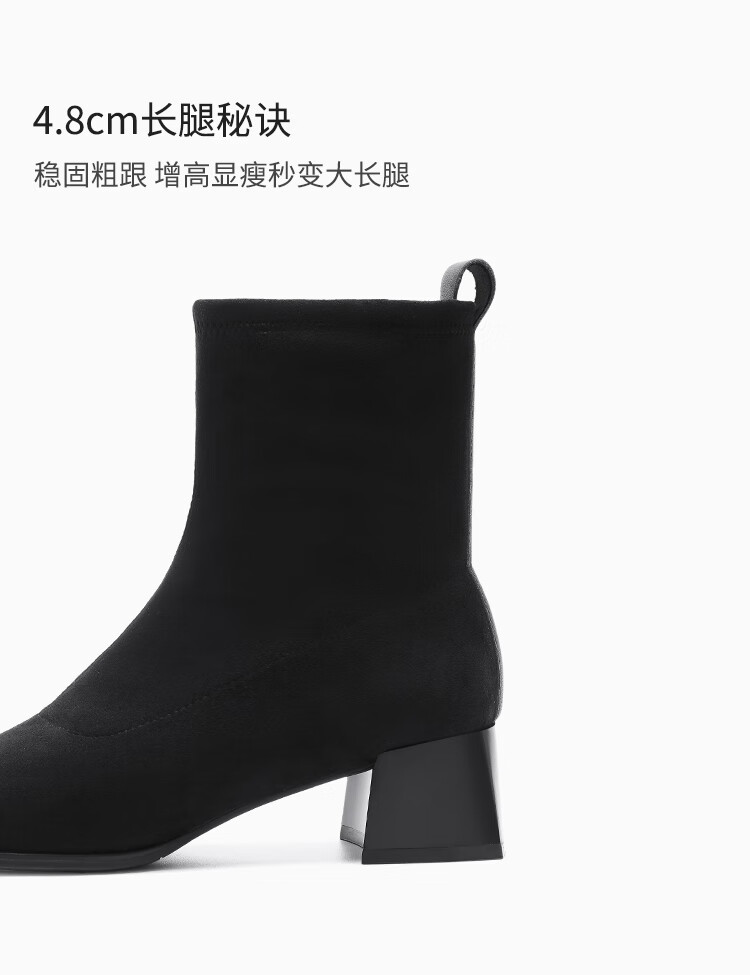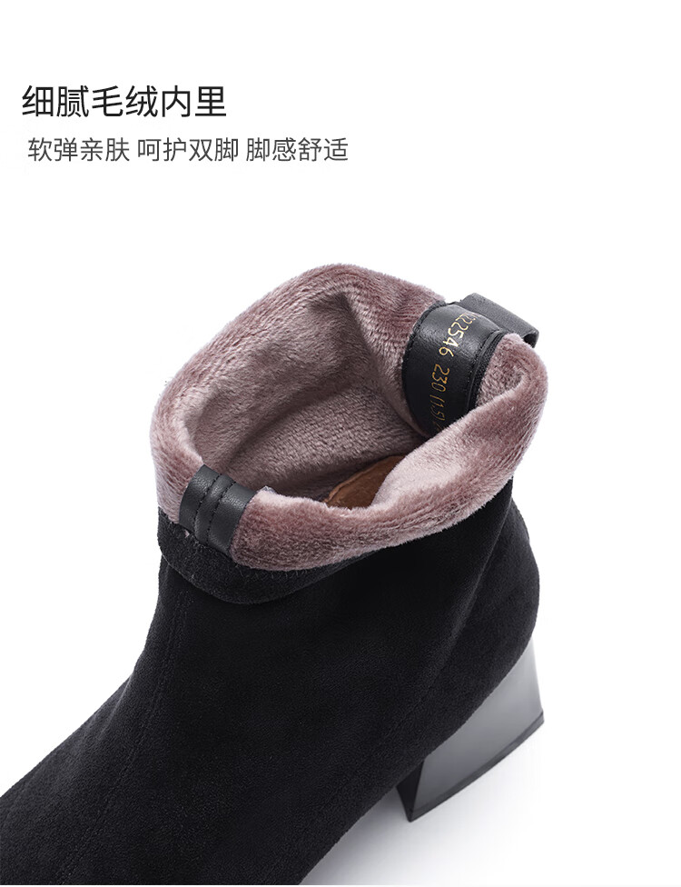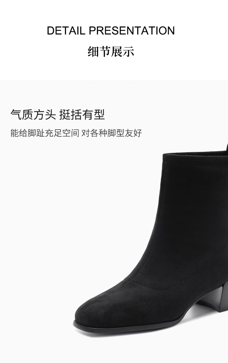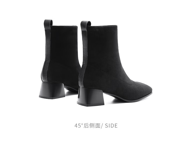 哈森冬季女短靴通勤粗跟赫本风方头弹力靴百搭纯色袜靴女HA259010 黑色 织物/牛皮革混用 39