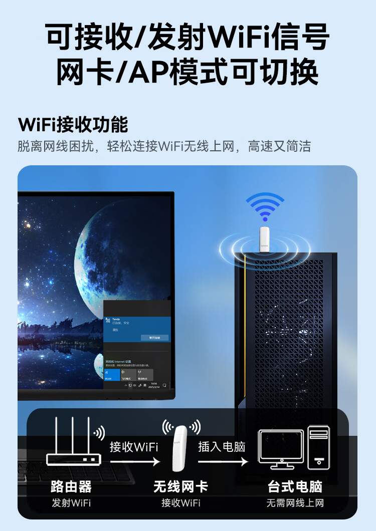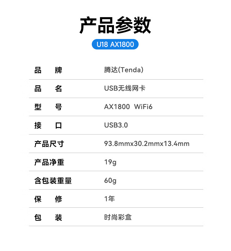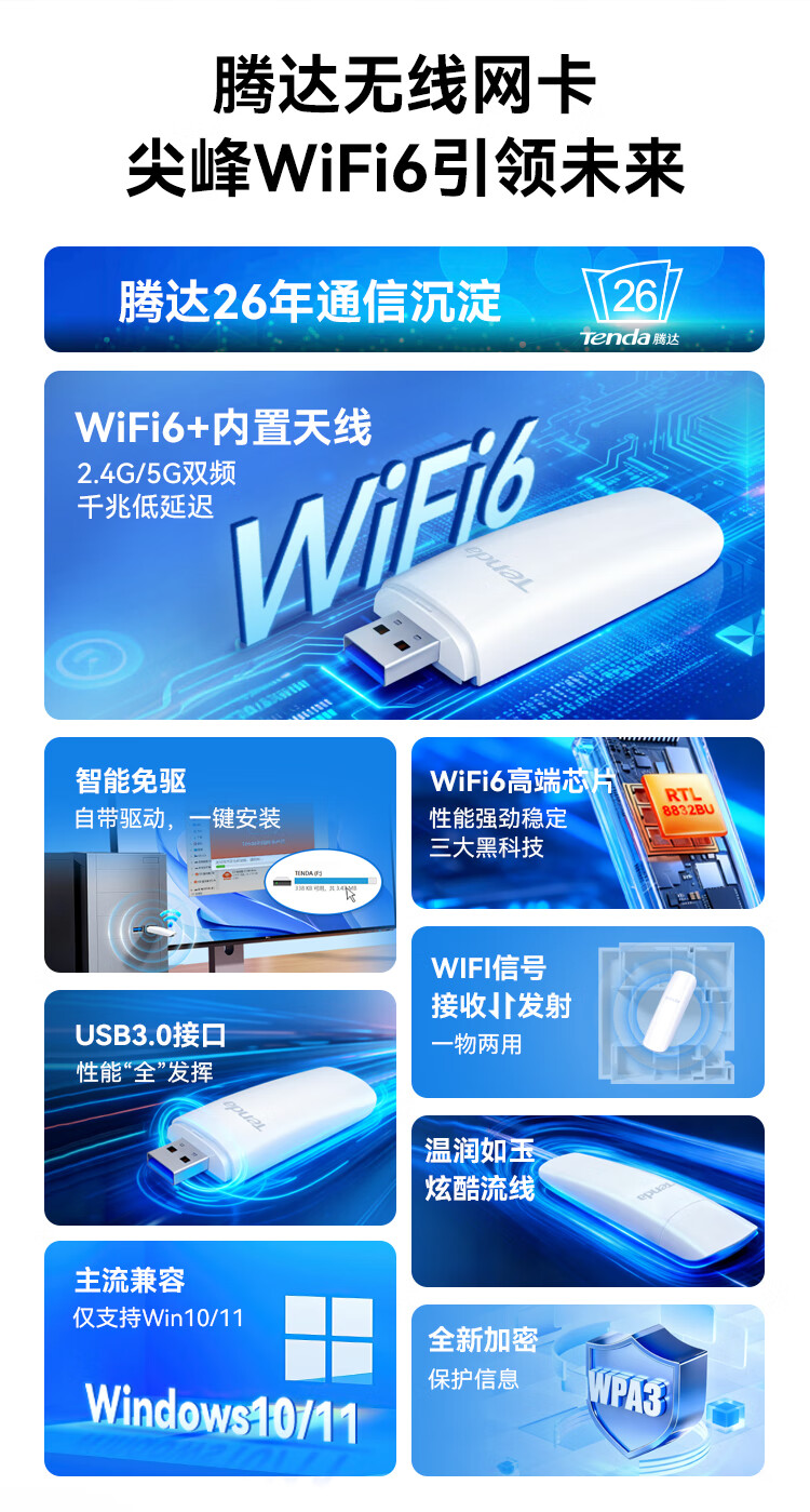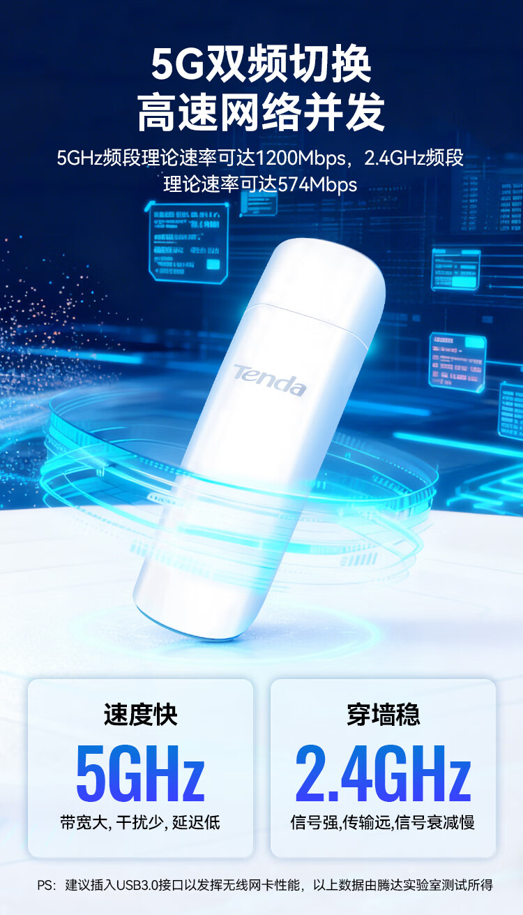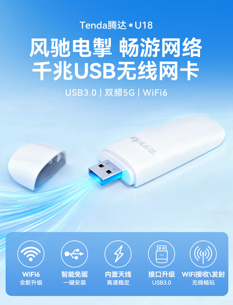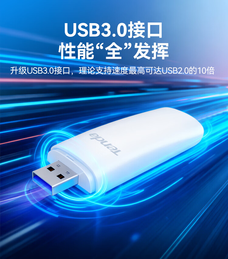 Tenda腾达USB无线网卡WiFi6 智能免驱AX1800 双频5G网卡 台式机专用WiFi接收器 无线WiFi发射器 USB3.0
