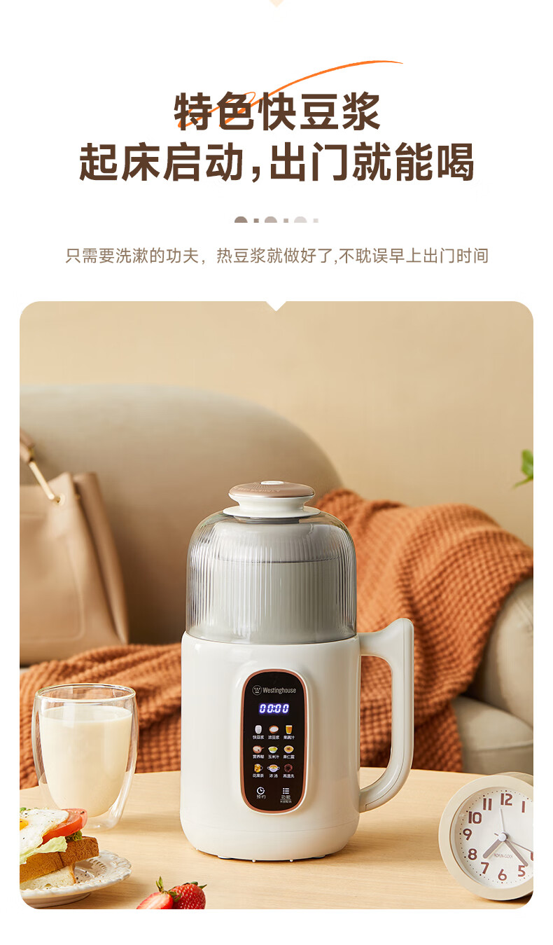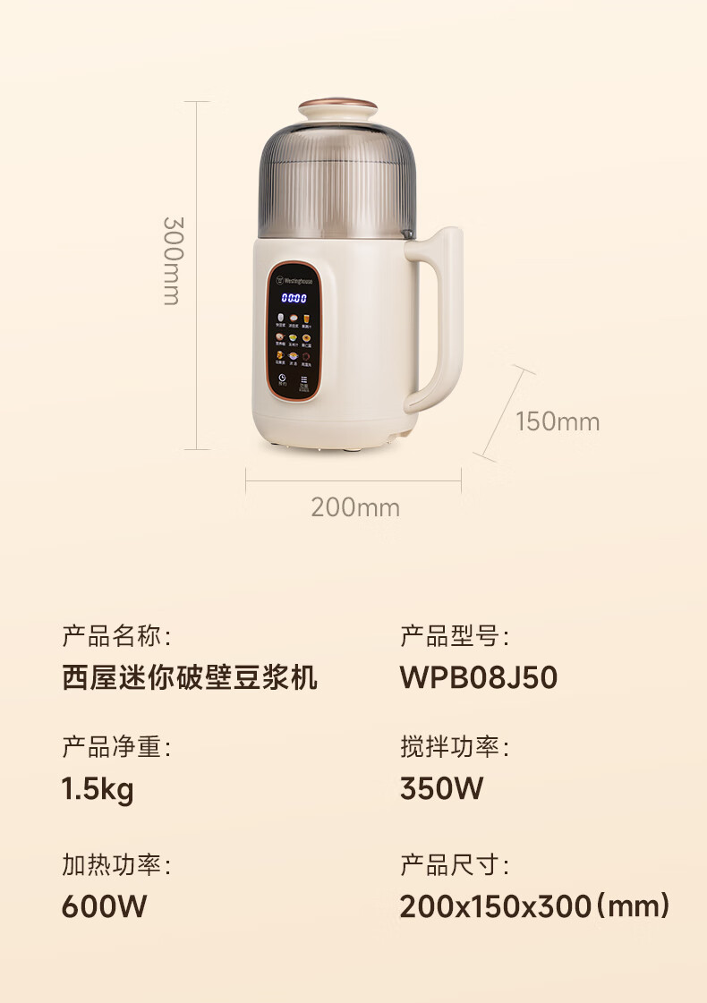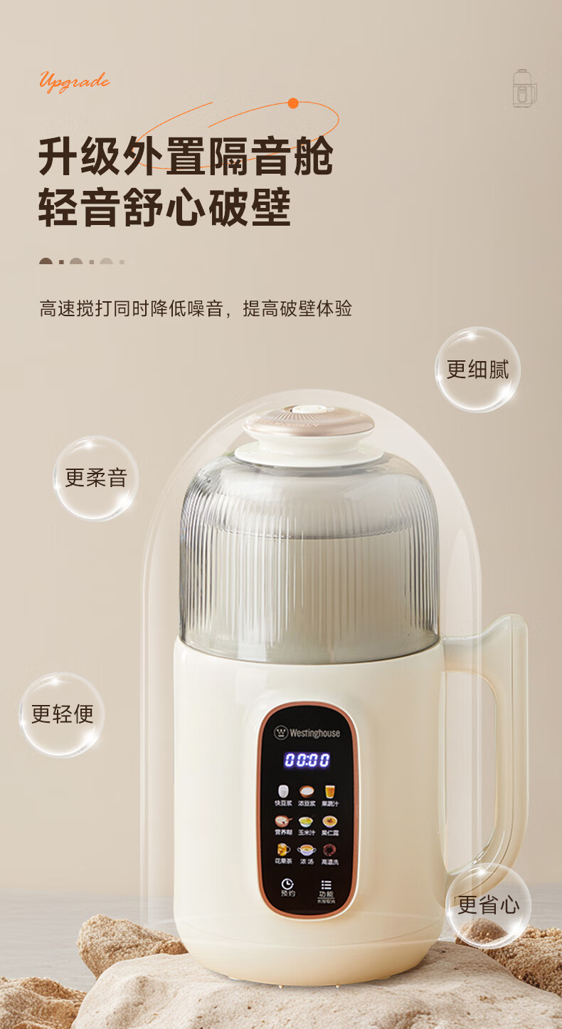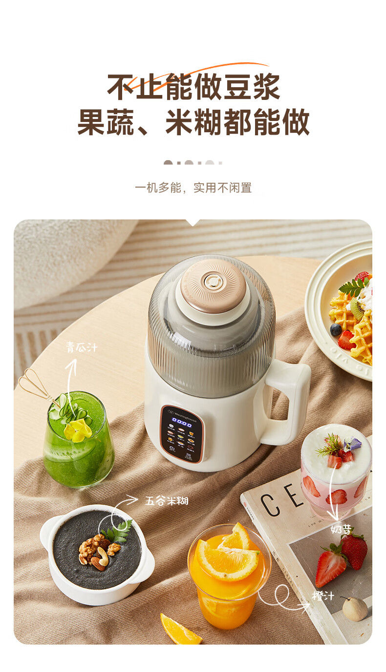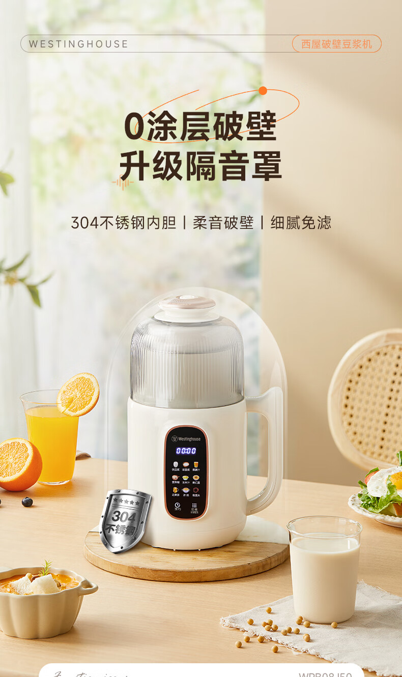 西屋(Westinghouse)不锈钢豆浆机800ml小型破壁机家用1-3人多功能料理机全自动免滤辅食机 WPB08J50