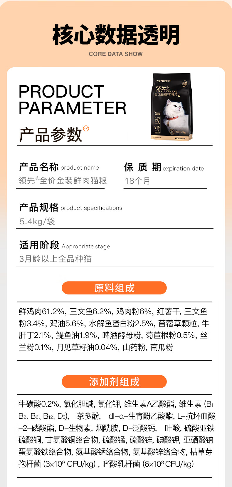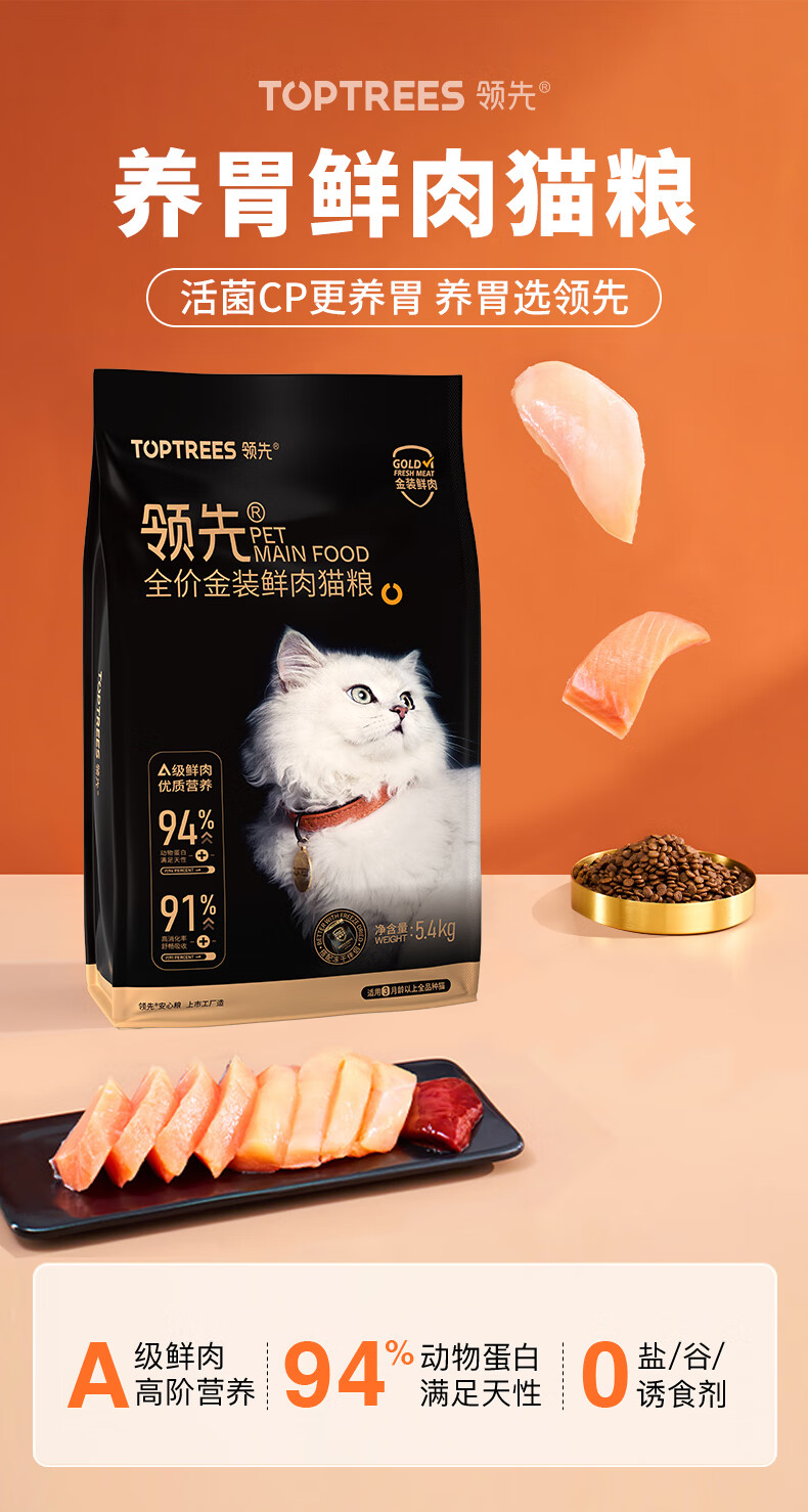 领先全价金装鲜肉猫粮5.4kg鸡肉三文鱼味成幼猫无谷养胃猫粮