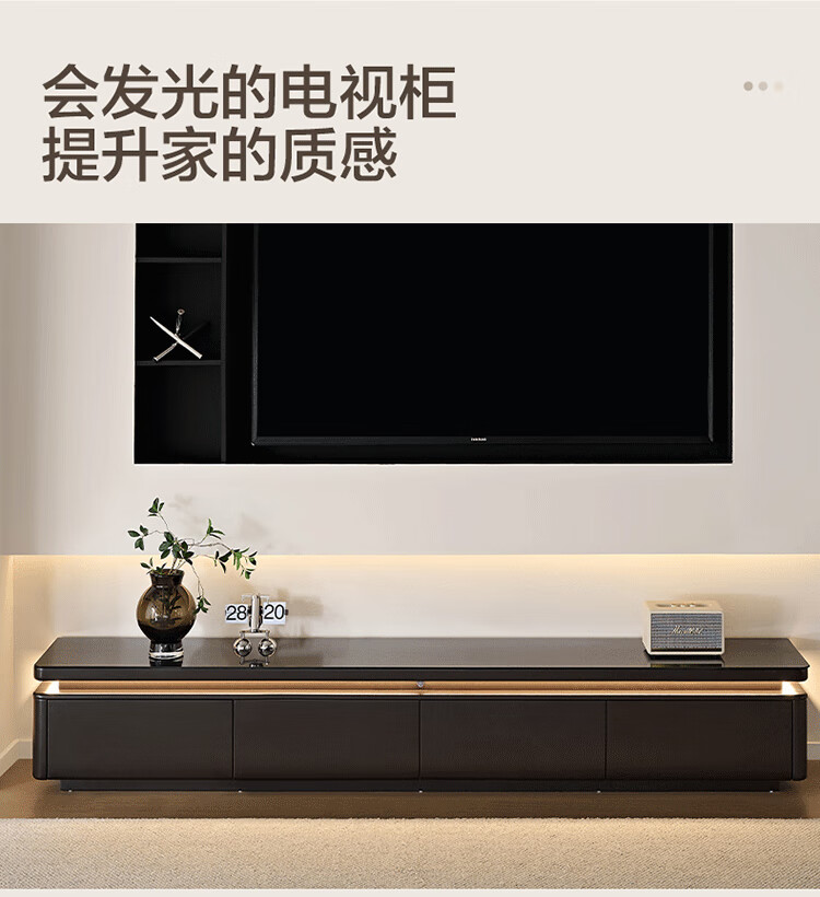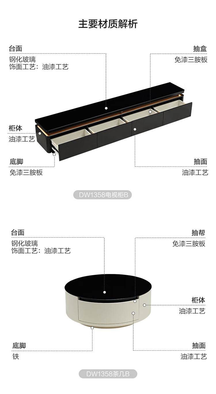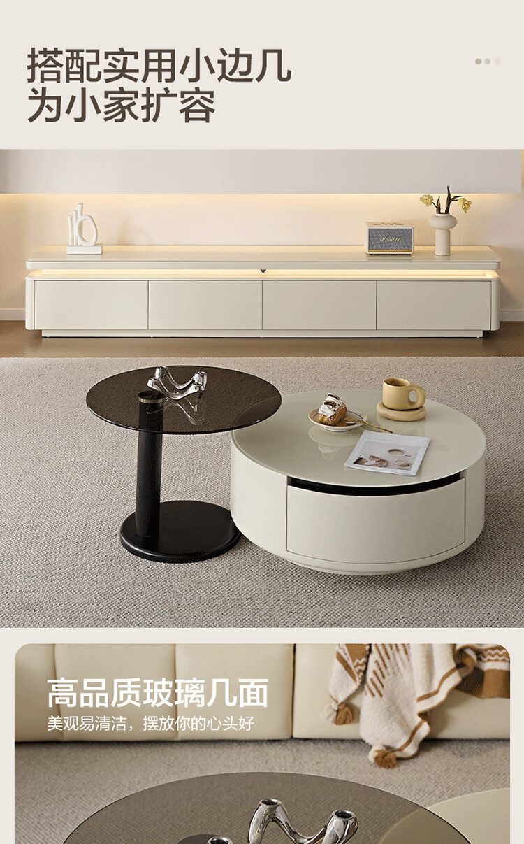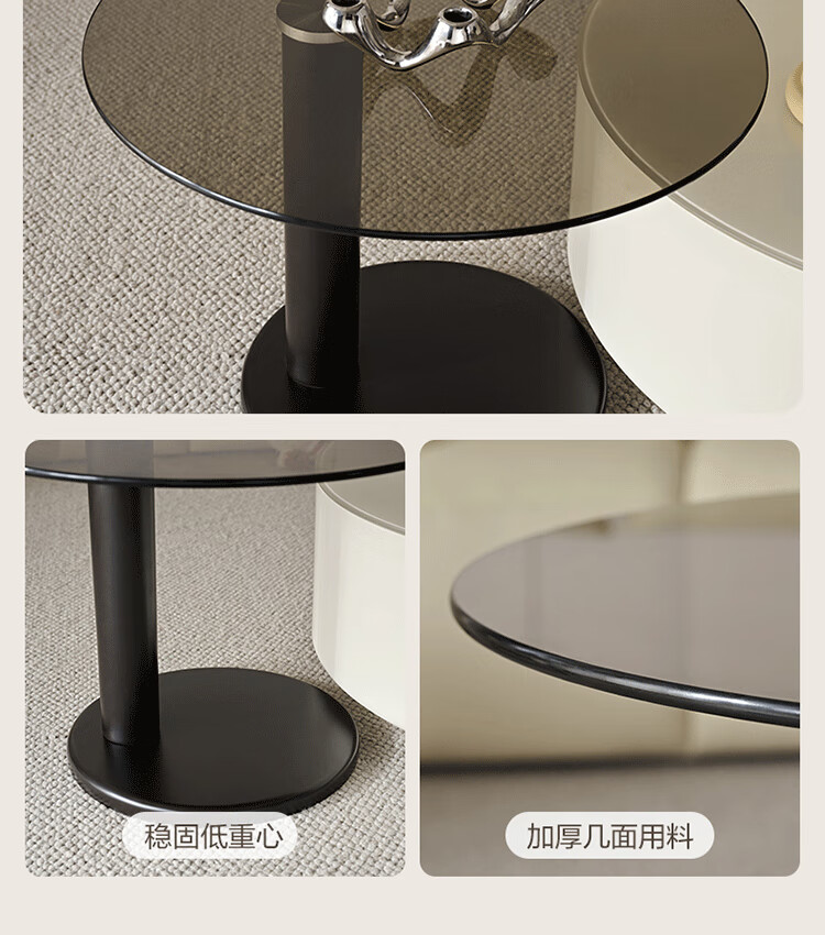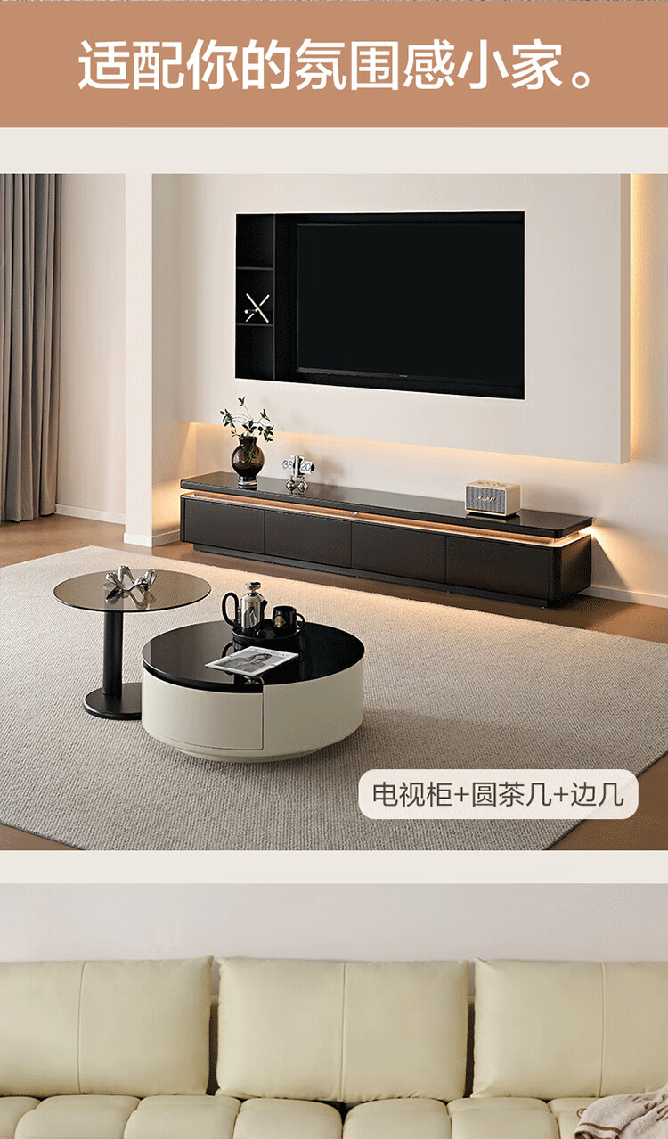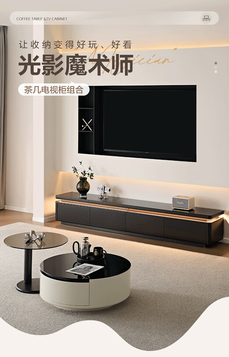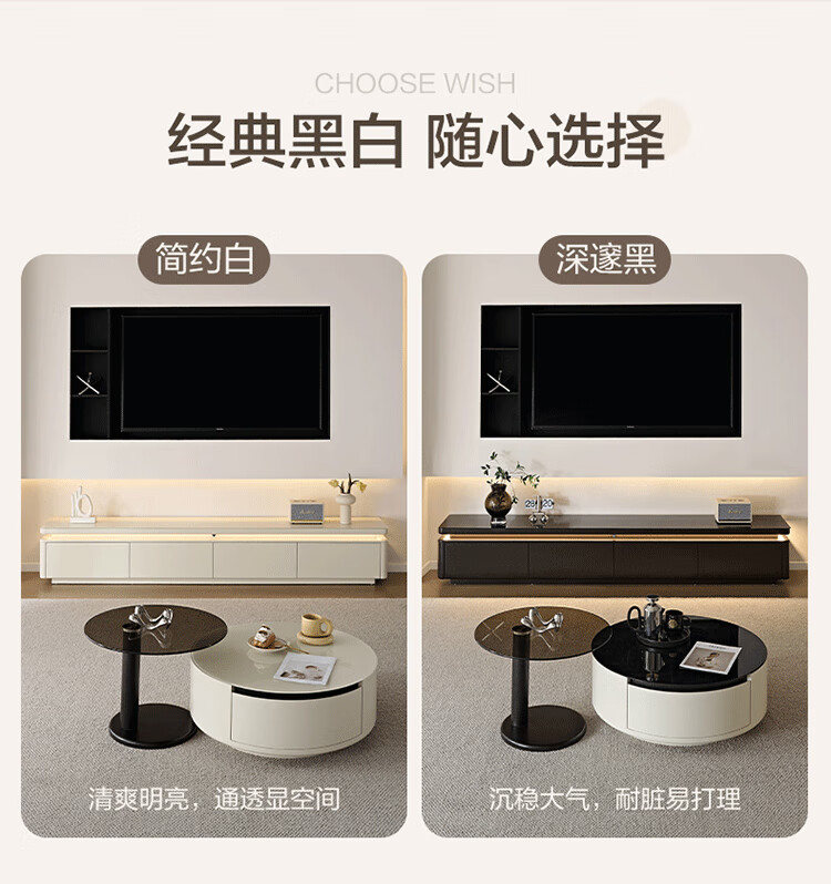 全友家居意式极简茶几客厅收纳储物柜子矮柜茶几电视柜组合套装家具 白色台面茶几+黑色边几 玻璃台面+氛围灯+隐藏式拉手