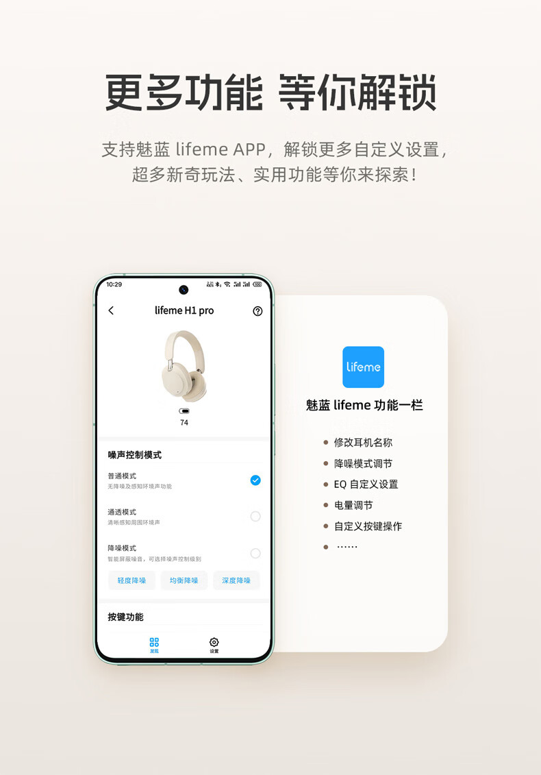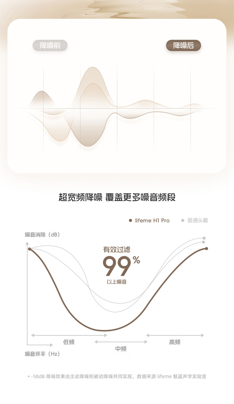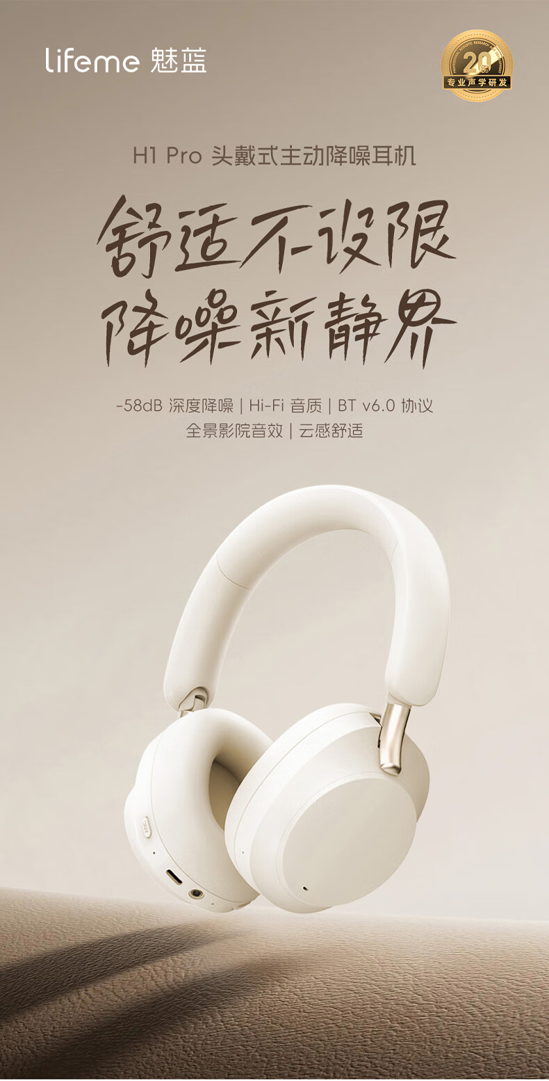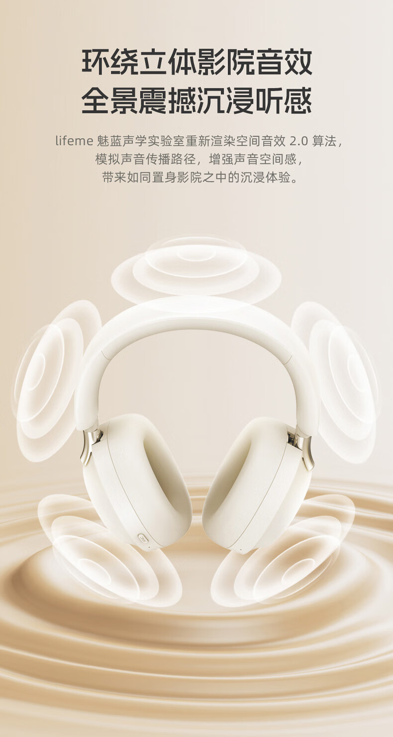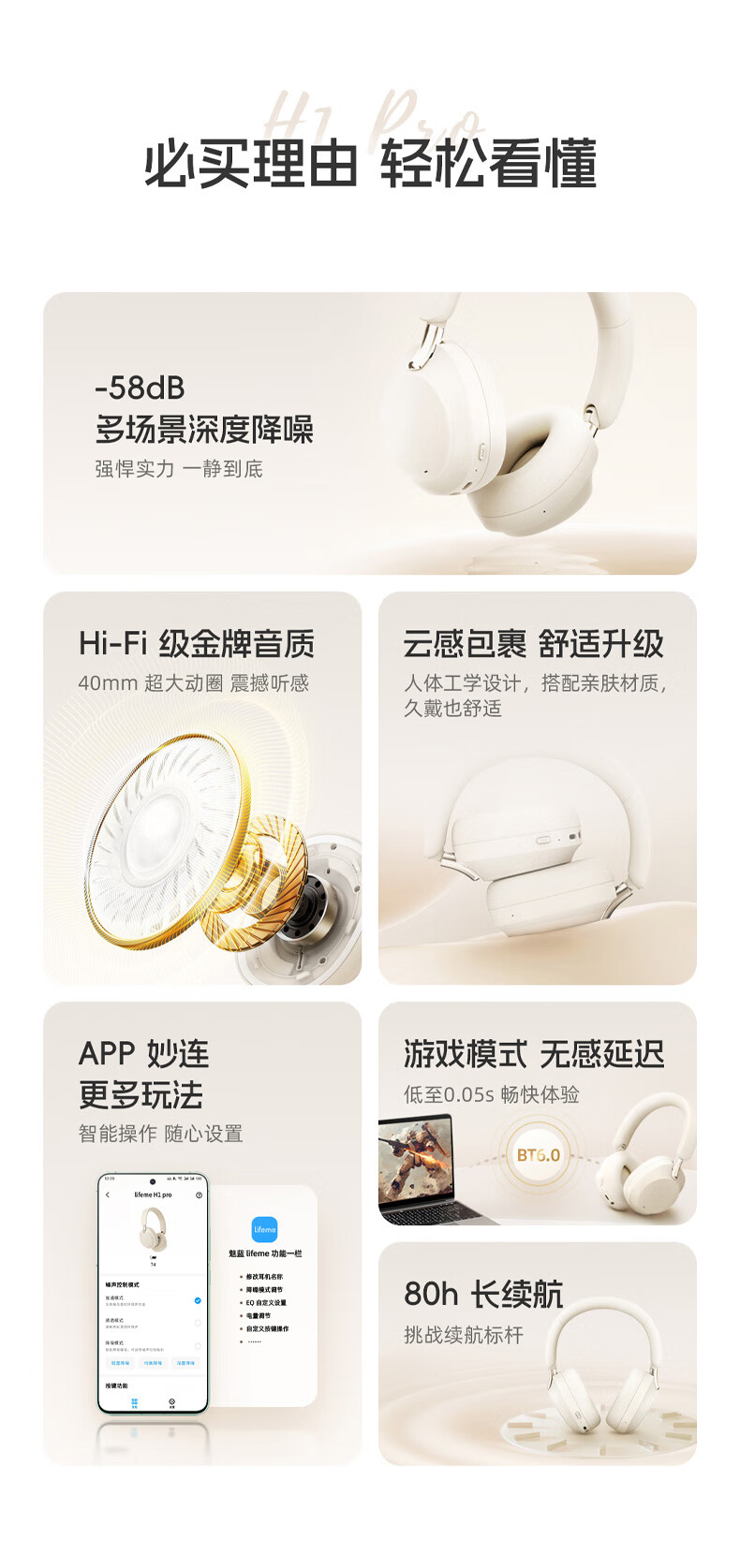 lifeme魅蓝H1 Pro头戴式蓝牙耳机-58dB降噪 80h长续航+APP调节 云感耳罩 蓝牙6.0低延迟 适用于魅族苹果 【-58dB降噪】影院音效