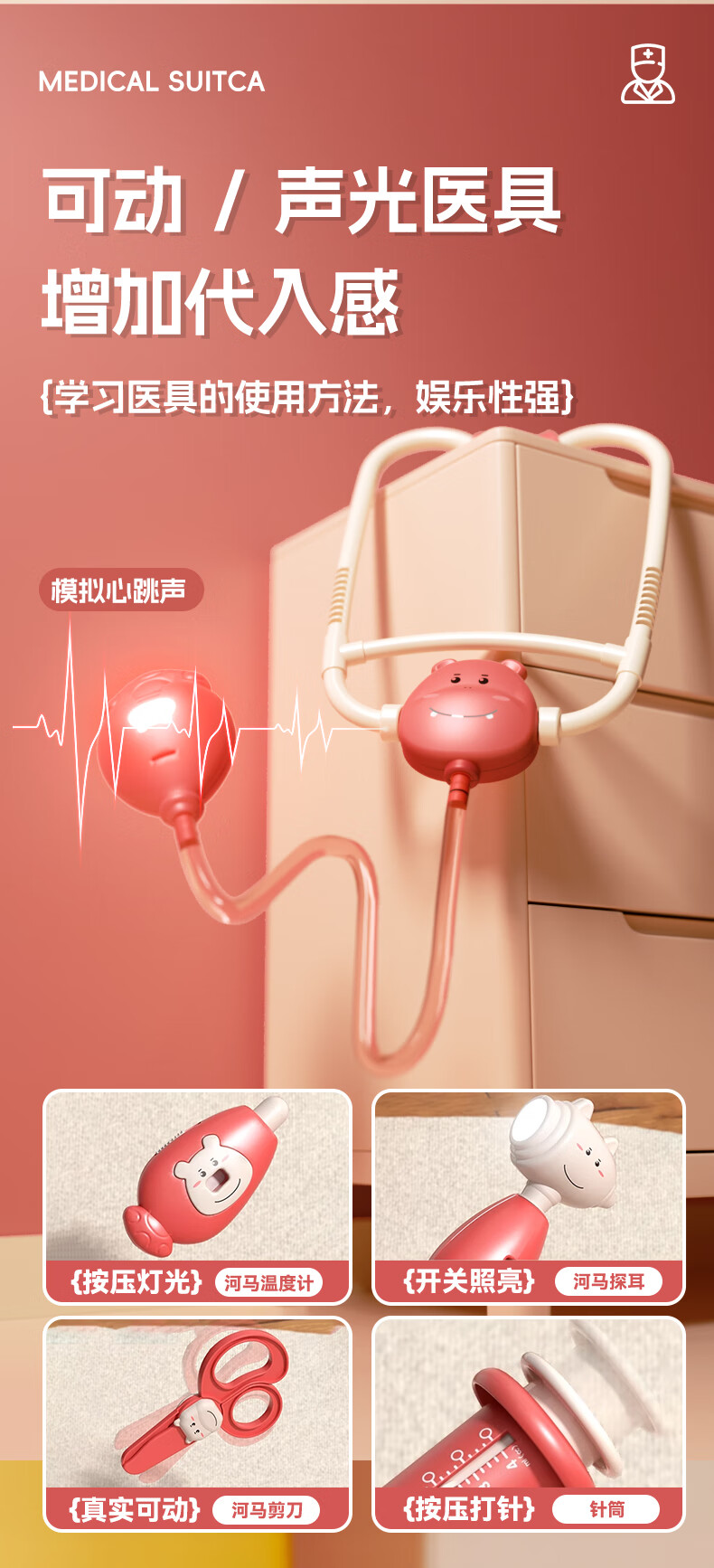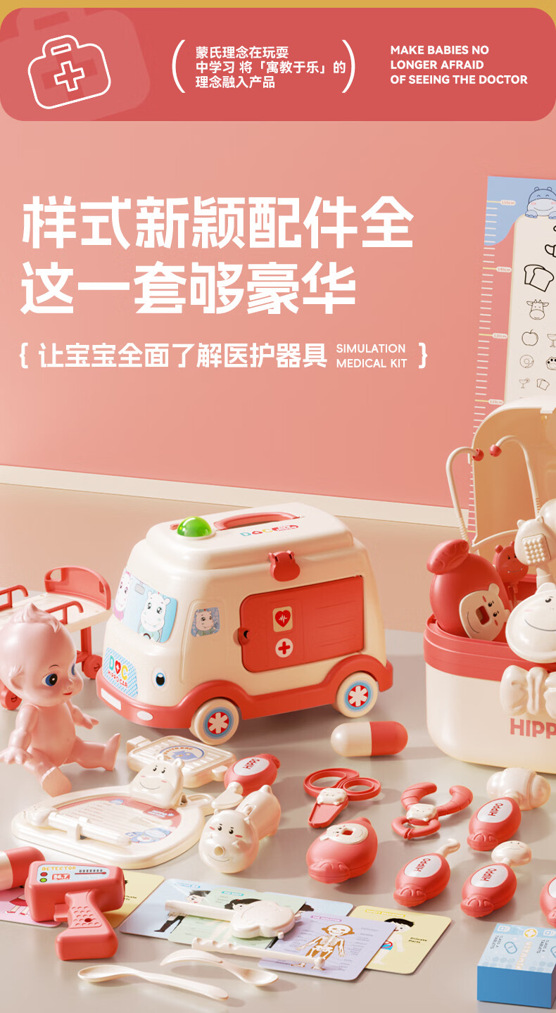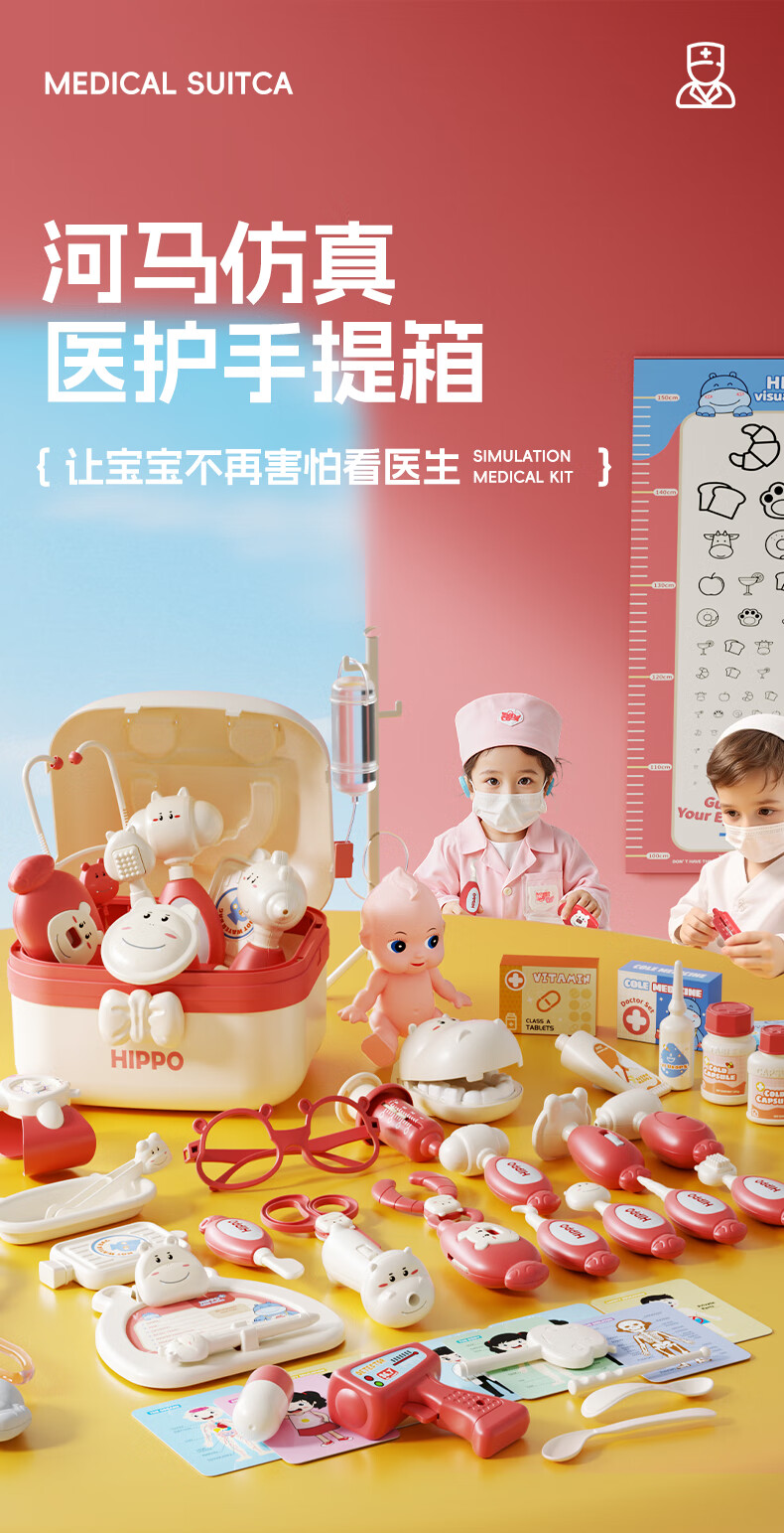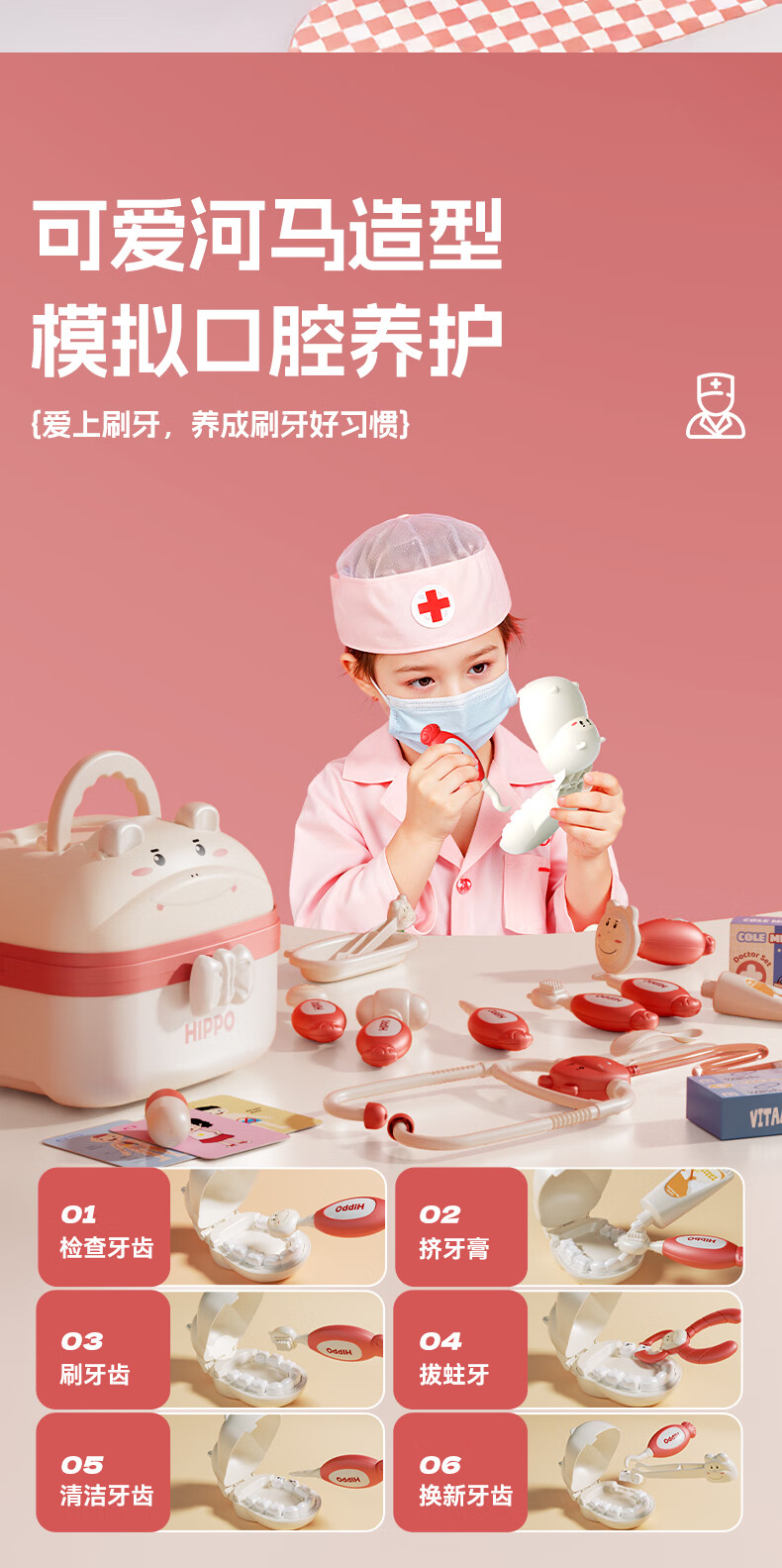 欧塞奇儿童小医生玩具套装女孩过家家医疗箱看病3-6岁早教益智小玩具 粉色河马【基础版39件】送娃娃+医疗床