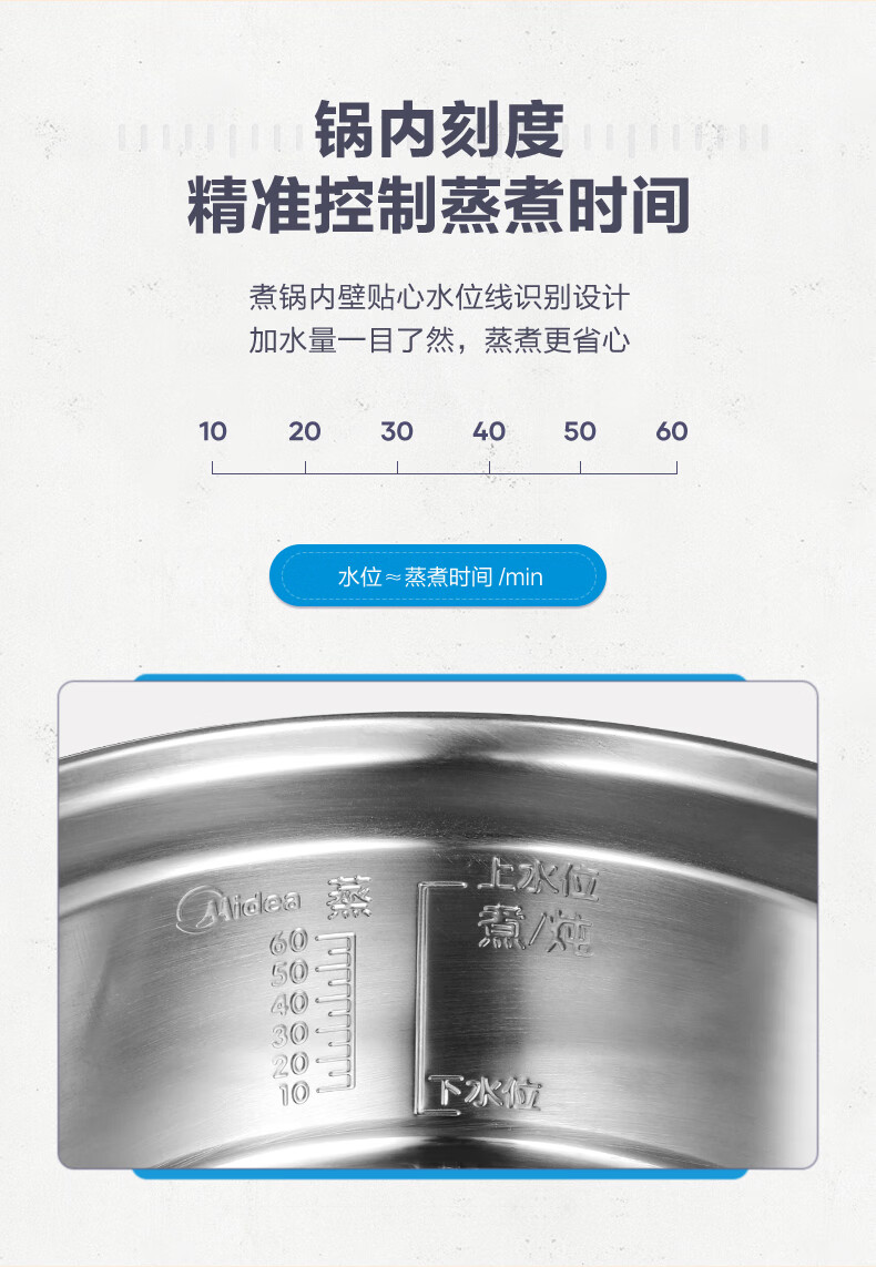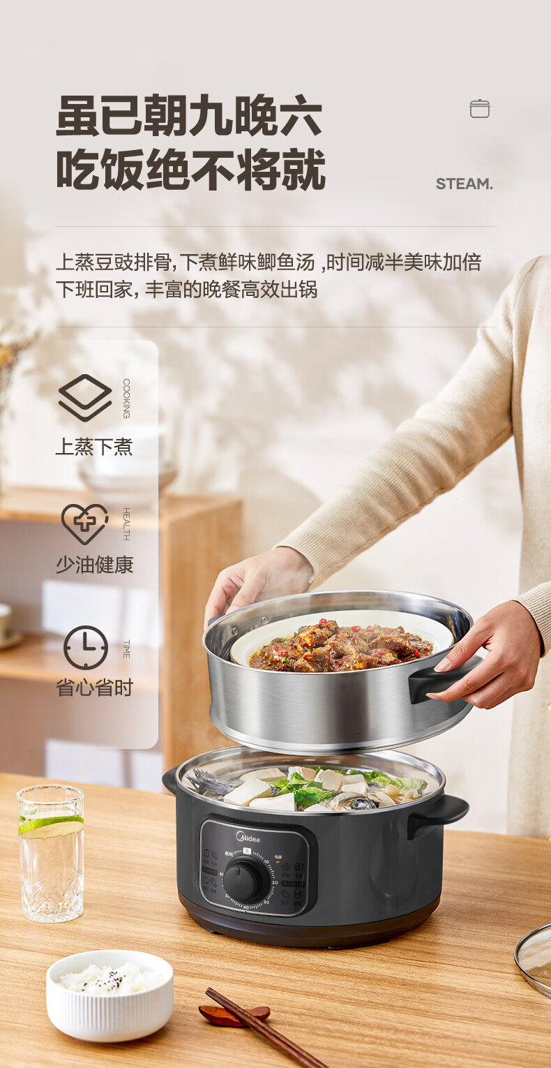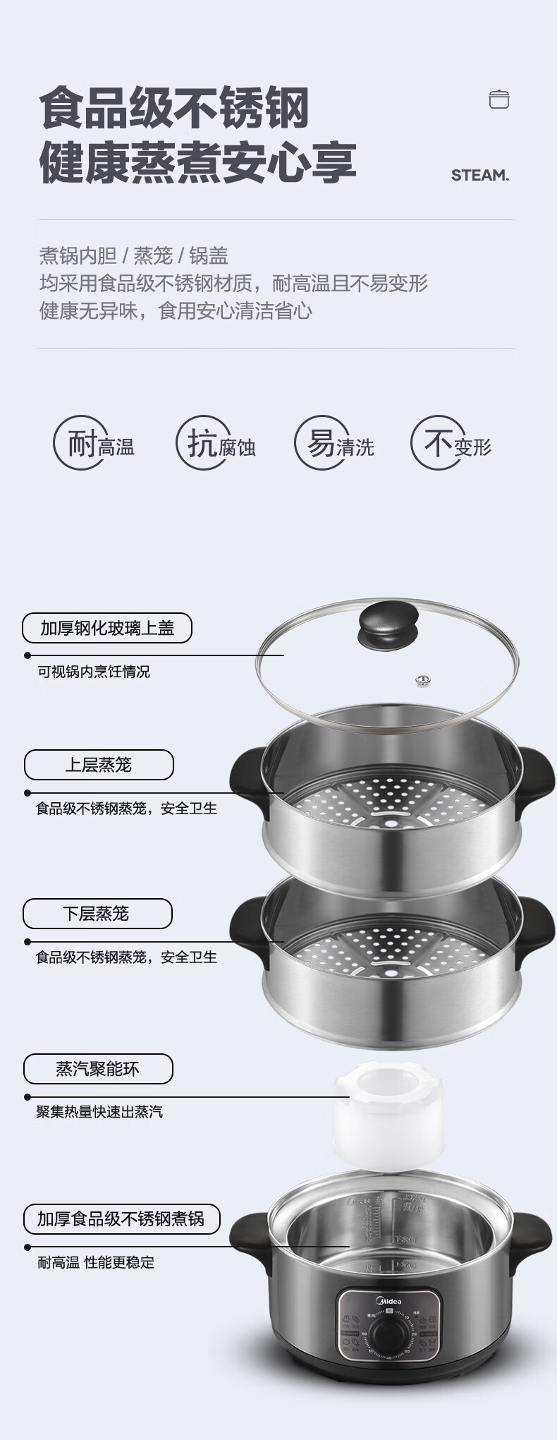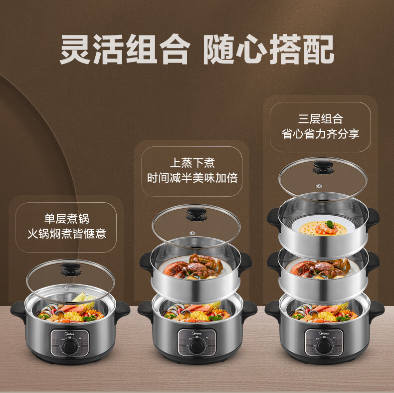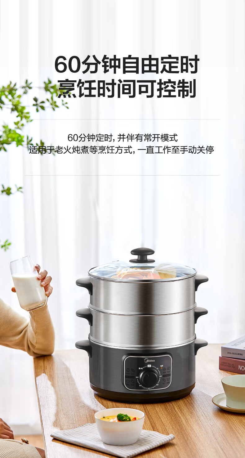 美的(Midea)电蒸锅电火锅电煮锅 多用途锅 电热锅 多功能蒸煮锅蒸包子锅煮蛋器上蒸下煮三层大容量不锈钢机身 10L ZG26EASY401【国家补贴】 旋钮调节