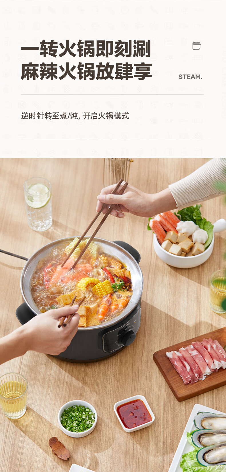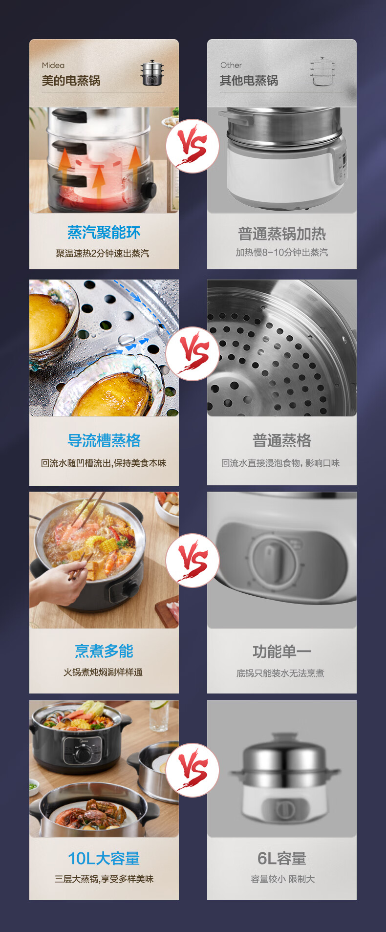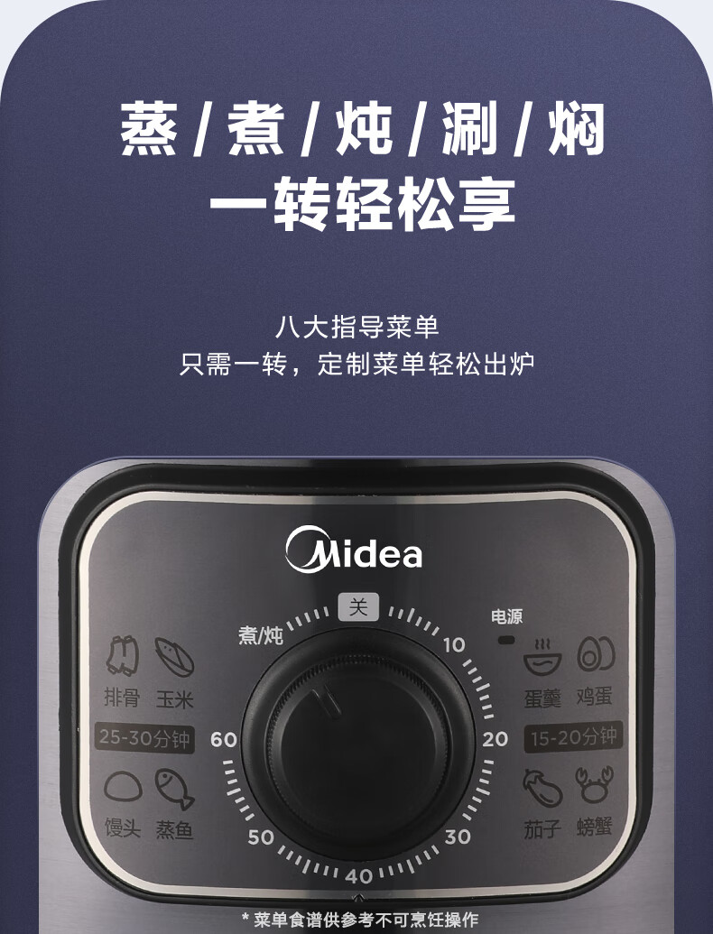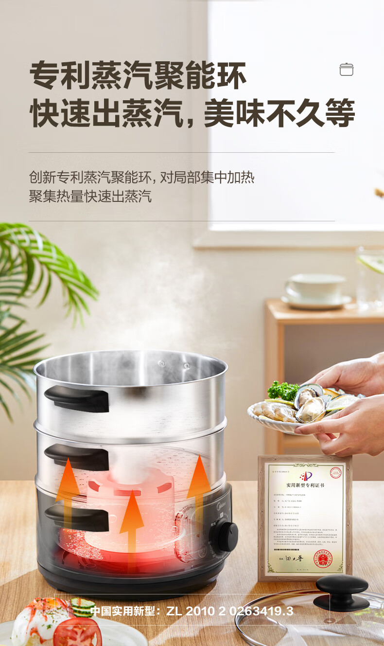 美的(Midea)电蒸锅电火锅电煮锅 多用途锅 电热锅 多功能蒸煮锅蒸包子锅煮蛋器上蒸下煮三层大容量不锈钢机身 10L ZG26EASY401【国家补贴】 旋钮调节