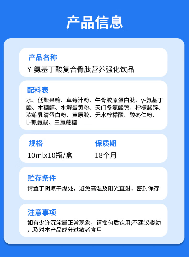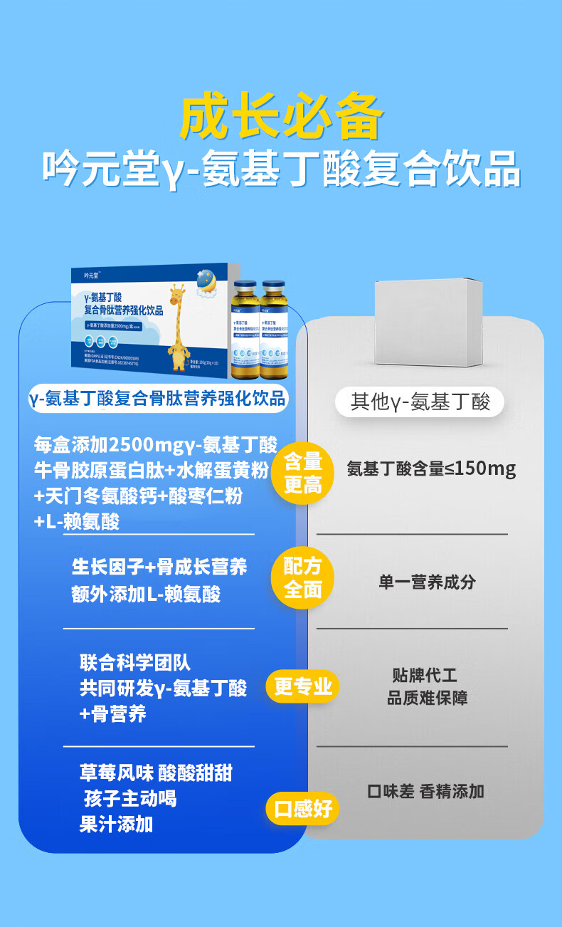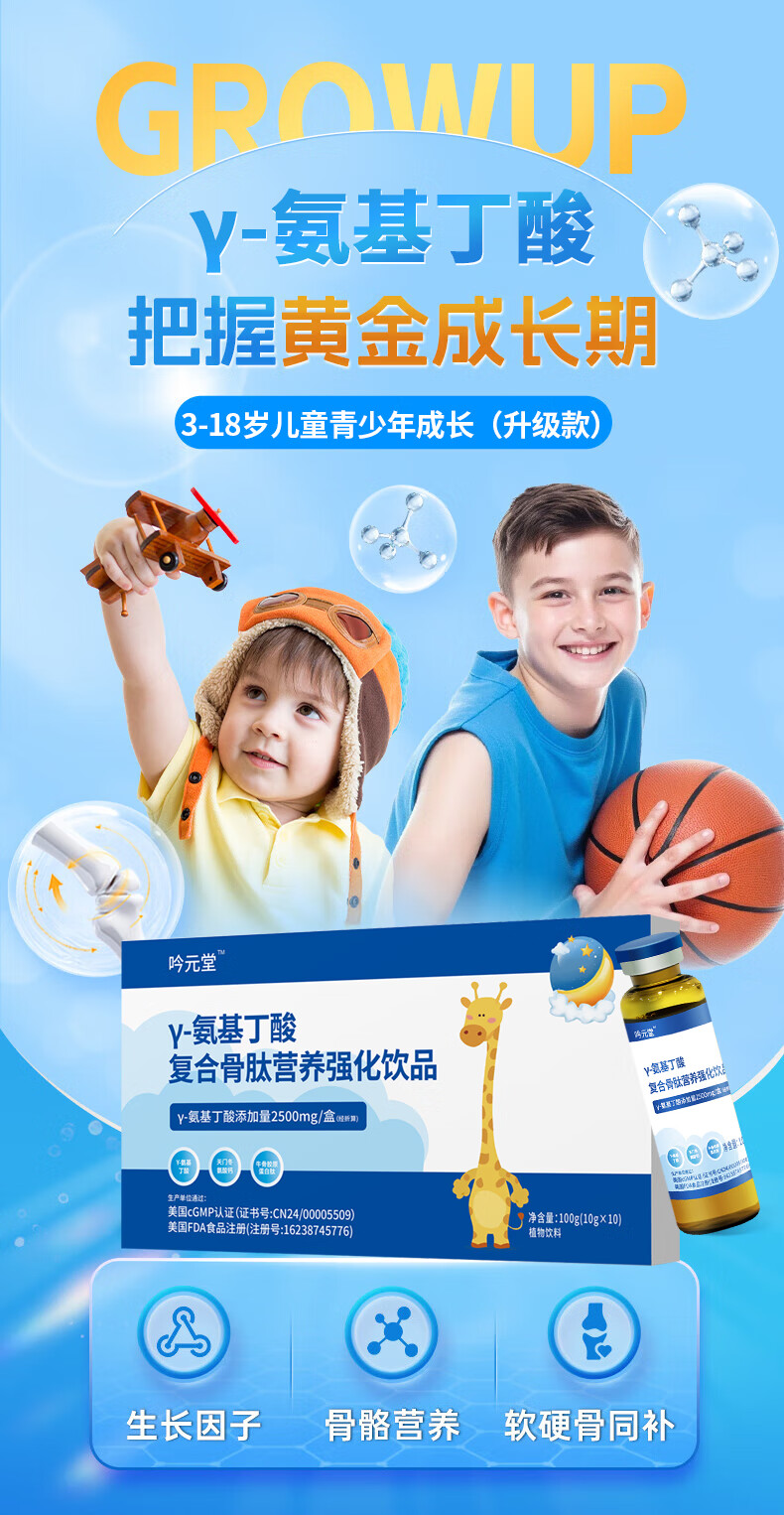 吟元堂γ-氨基丁酸伽马y儿童青少年生成长素骨肽液体钙GABA赖氨酸营养 【升级款1盒装10支】氨基丁酸含量2500mg/盒
