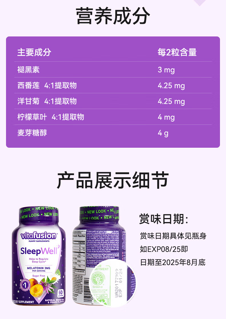 小熊糖Vitafusion褪黑素改善睡眠倒时差营养软糖60粒