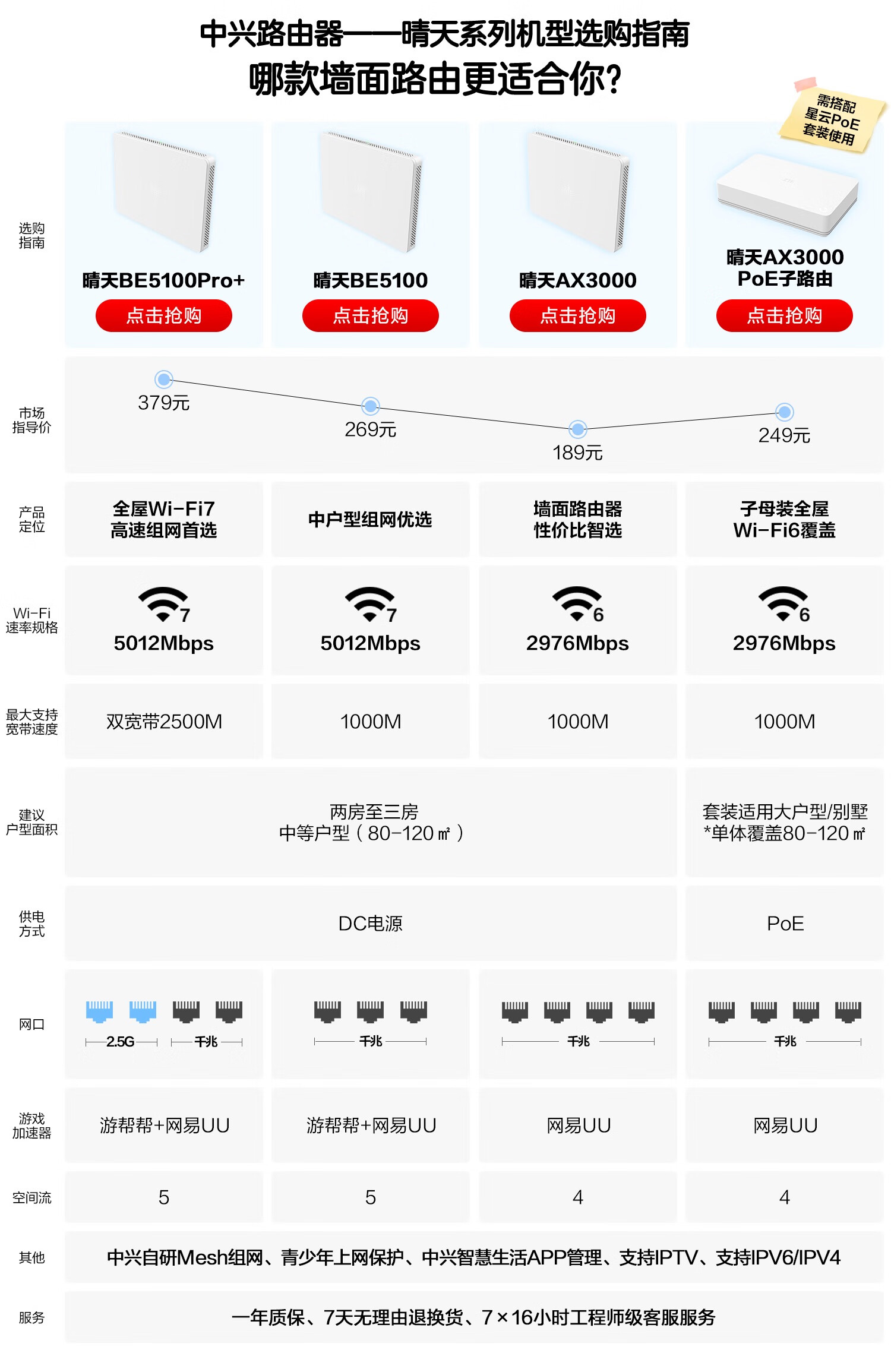 中兴(ZTE)【晴天墙面路由器】BE5100Pro+ 双2.5G口 无线WiFi7千兆双频5颗信号放大器兼容WiFi6游戏加速