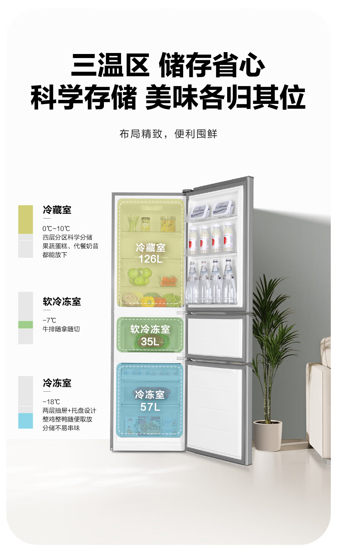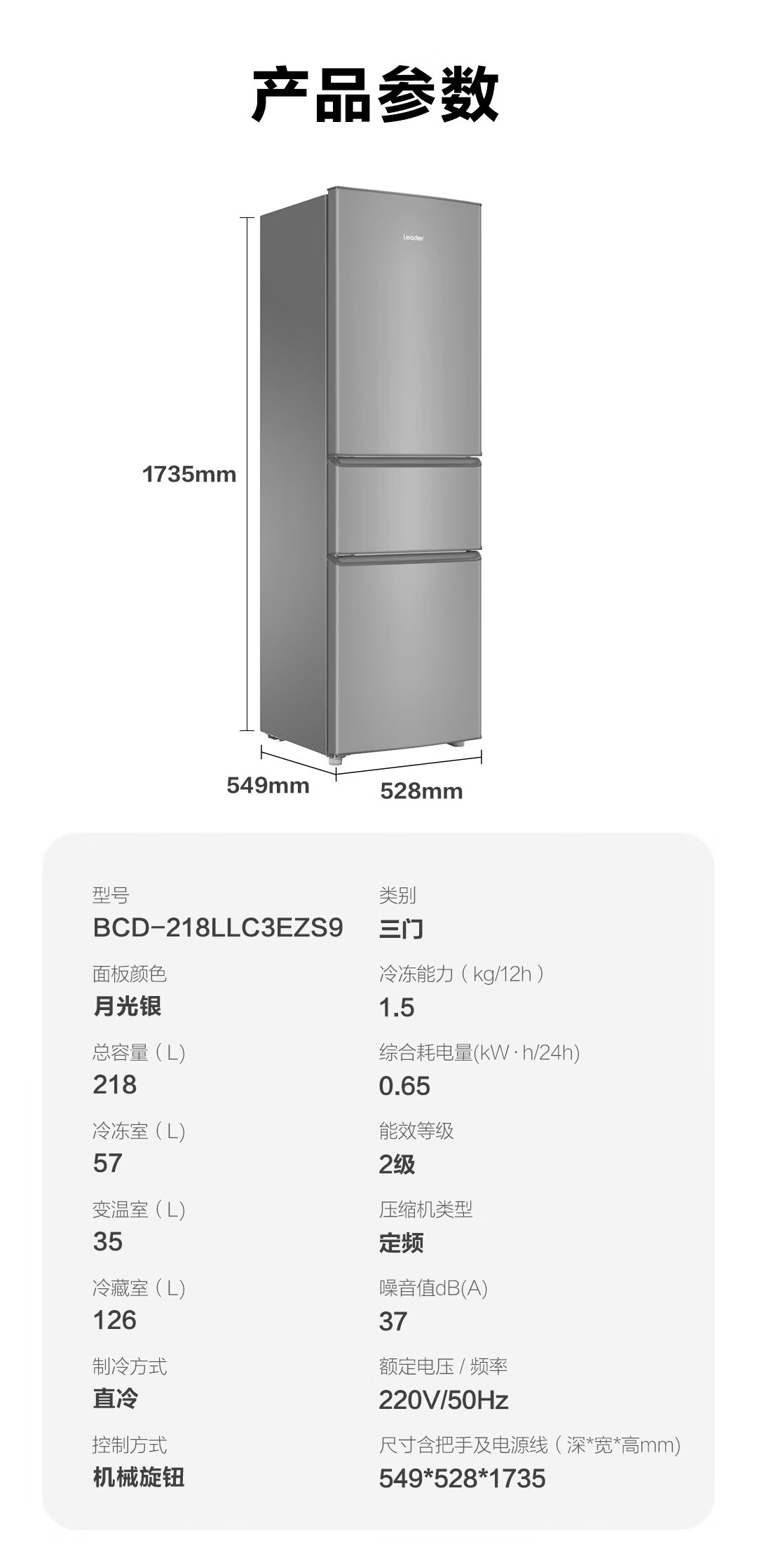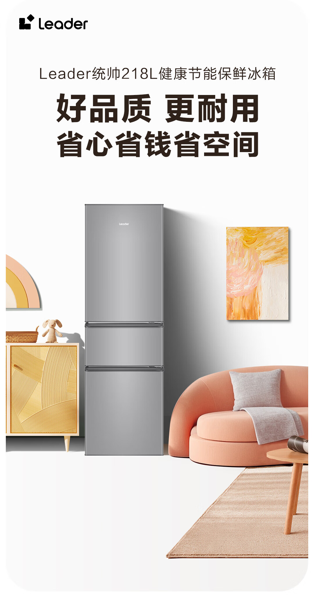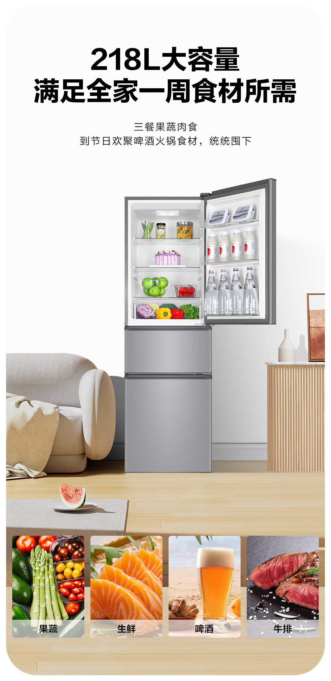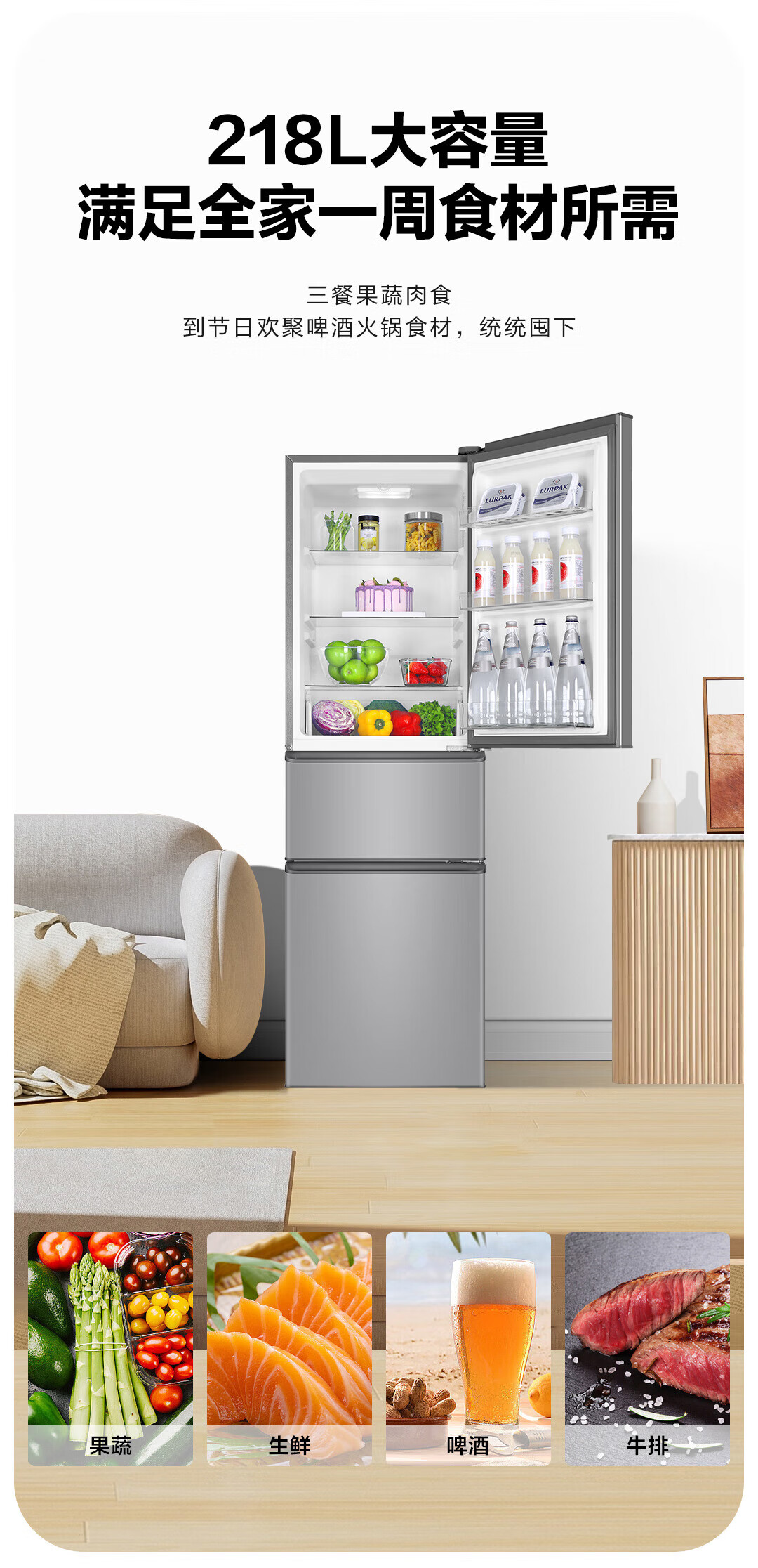 统帅(Leader)海尔冰箱出品小三门218升家用冰箱 三门三温三开门防串味 省电节能低噪宿舍租房迷你小冰箱 BCD-218LLC3EZS9二级能效