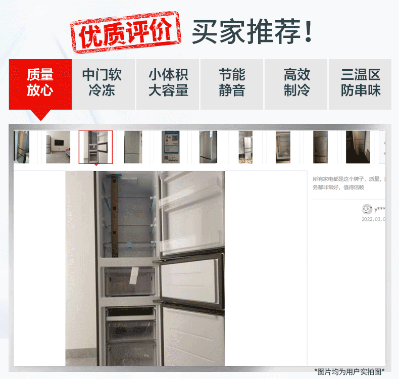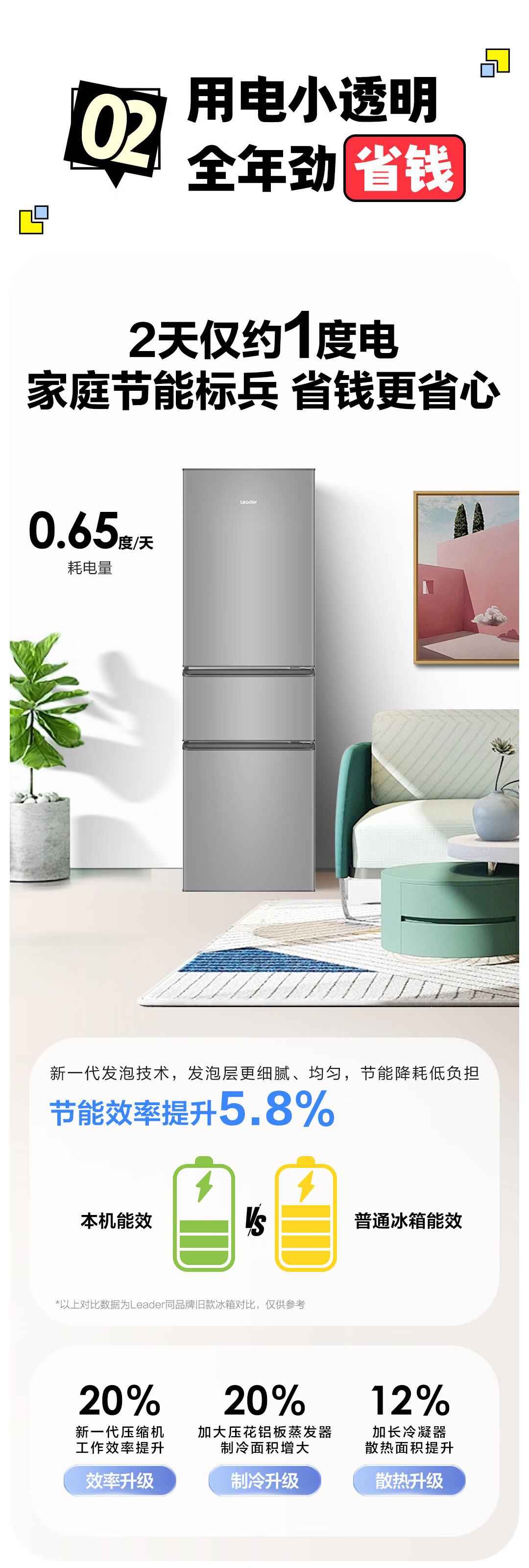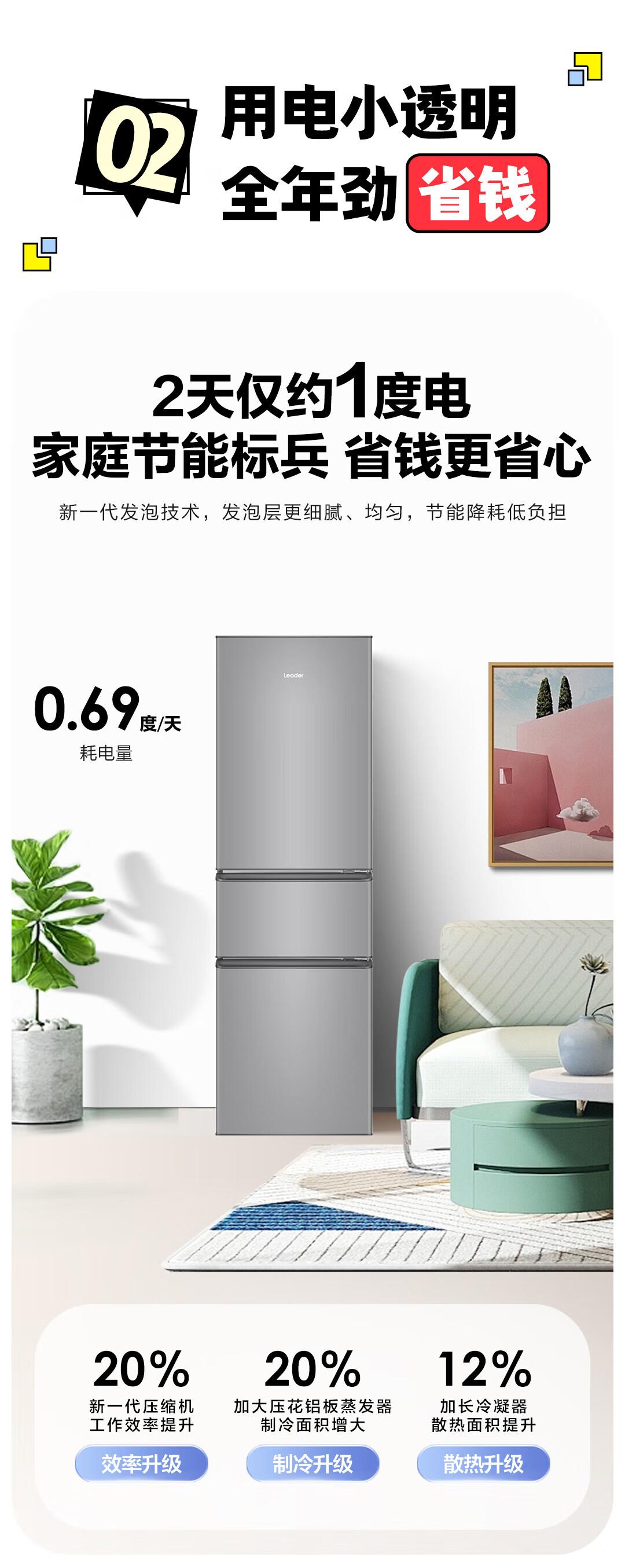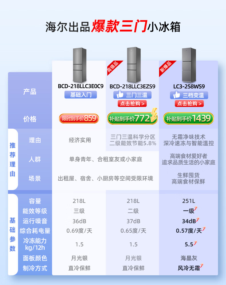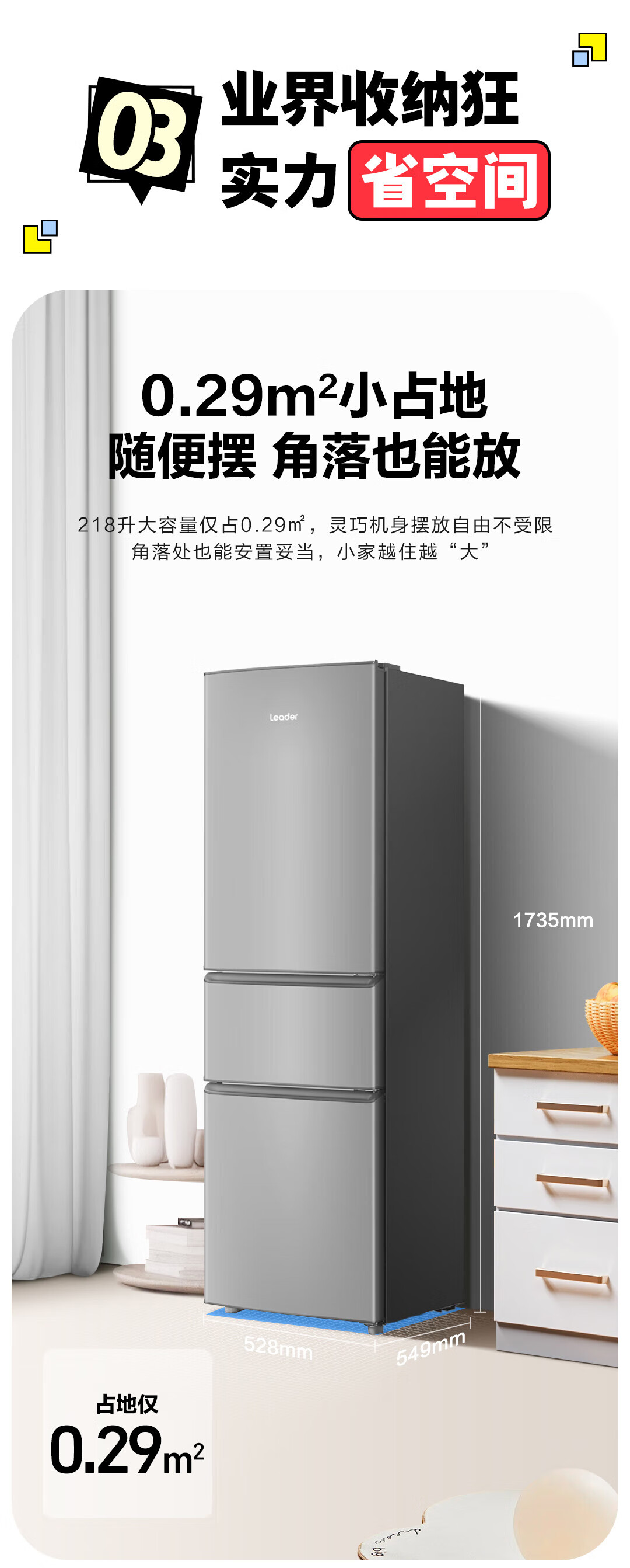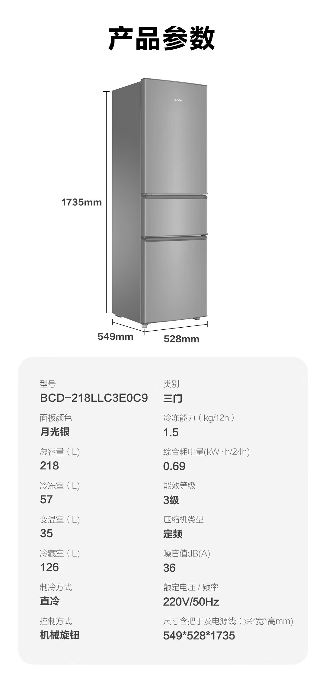 统帅(Leader)海尔冰箱出品小三门218升家用冰箱 三门三温三开门防串味 省电节能低噪宿舍租房迷你小冰箱 BCD-218LLC3EZS9二级能效
