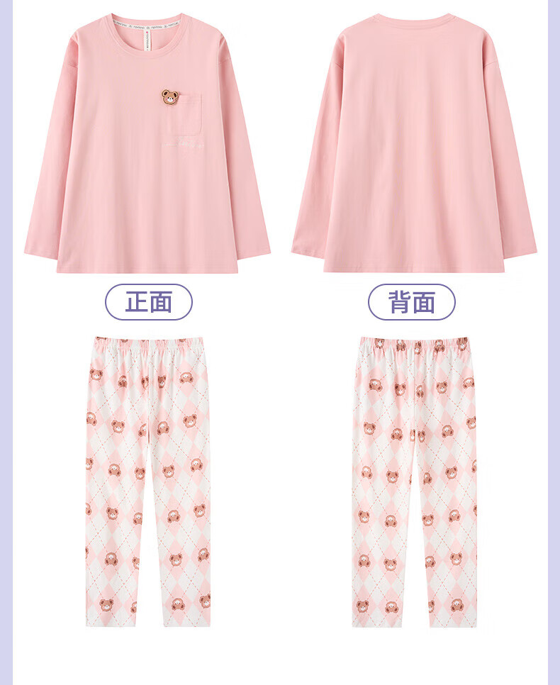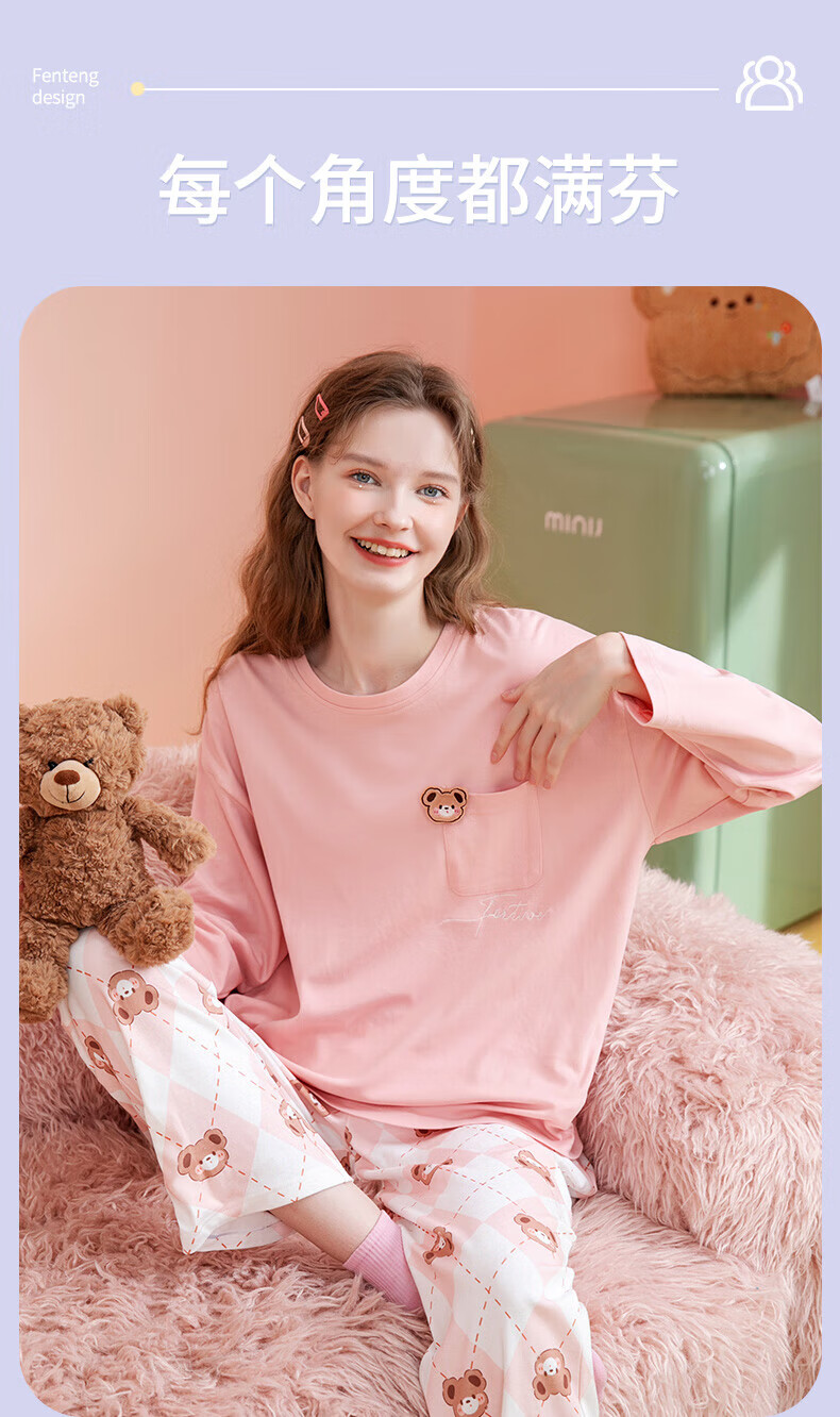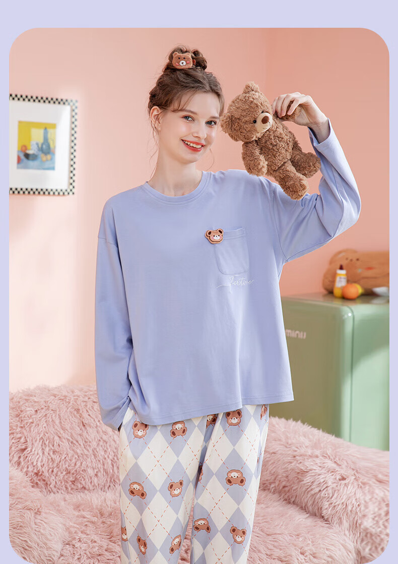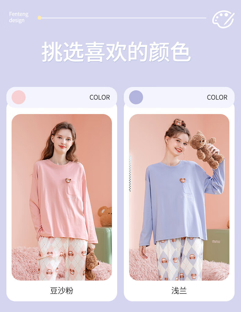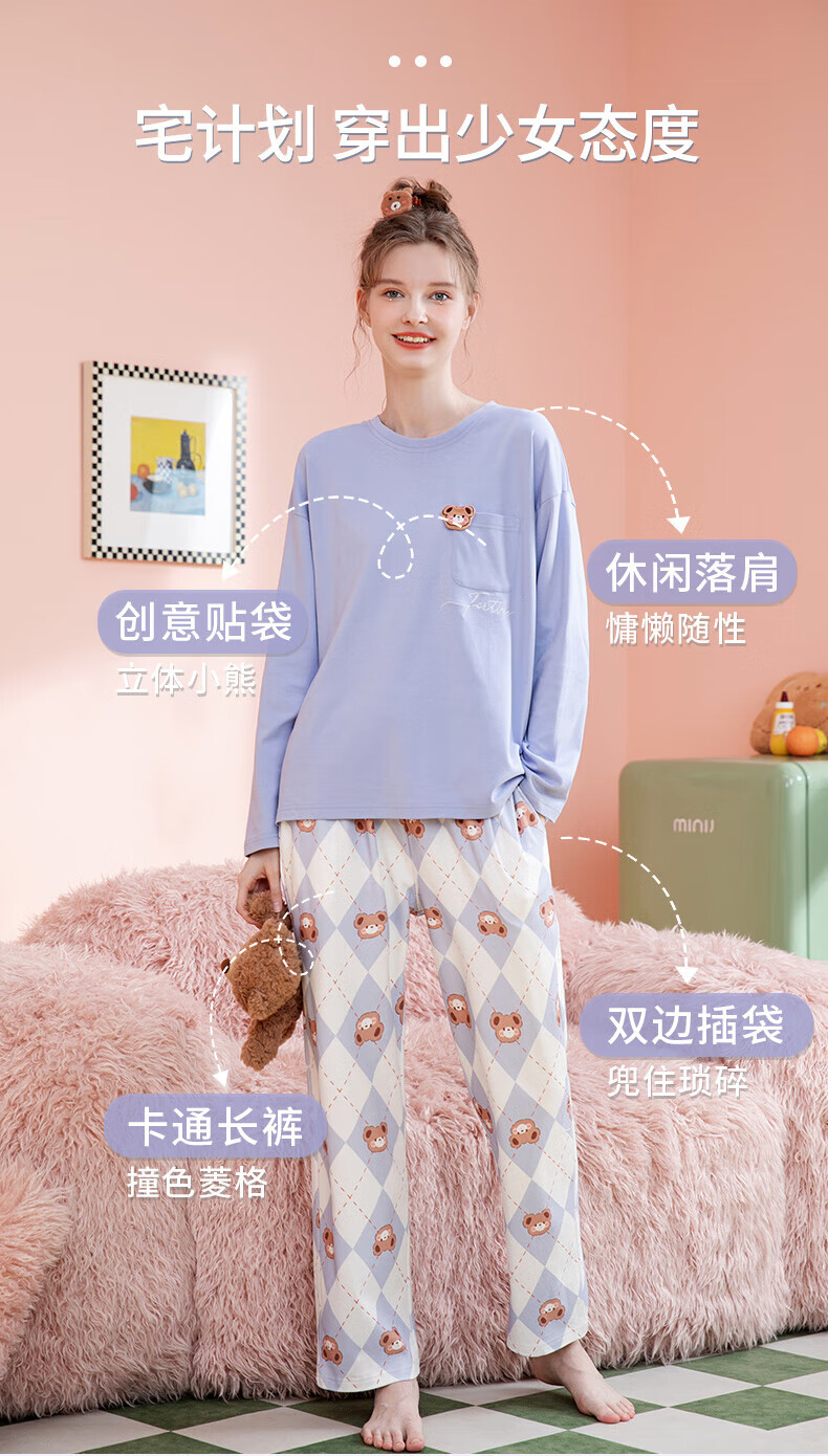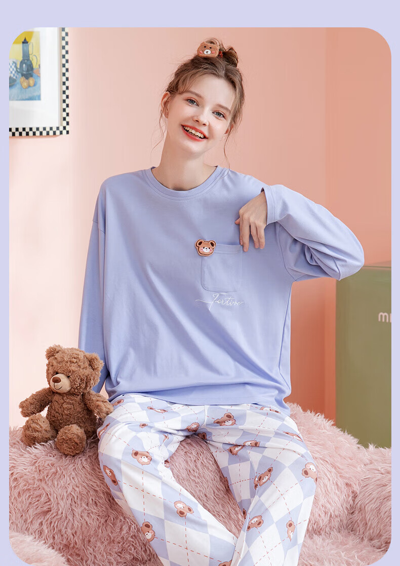 芬腾睡衣女圆领长袖甜美外穿纯棉棉家居服女士睡衣套装 浅兰 L