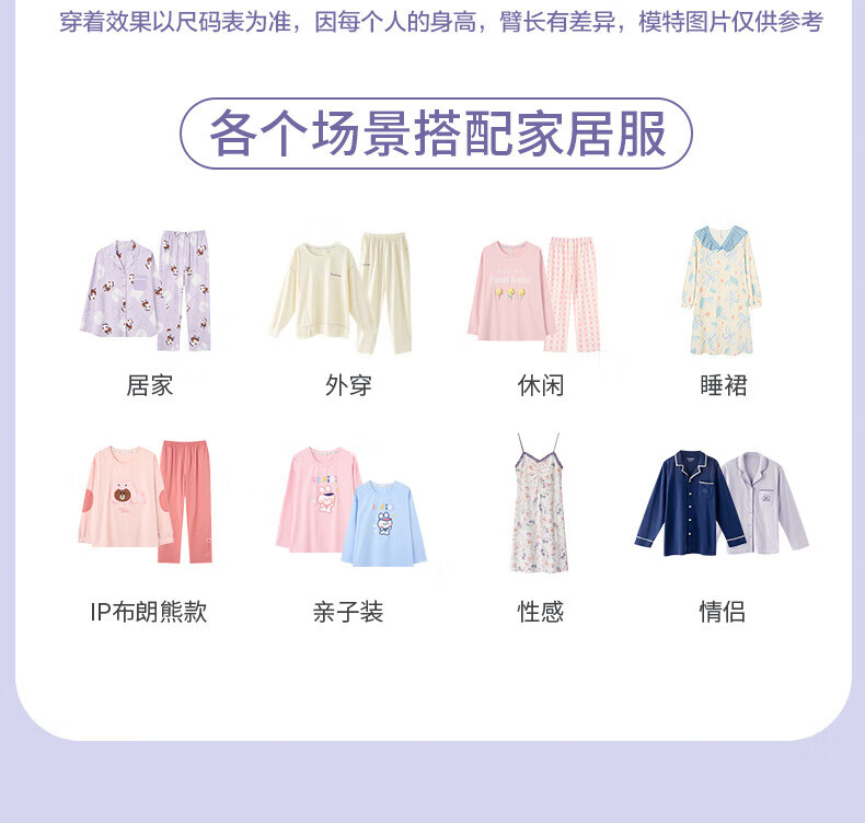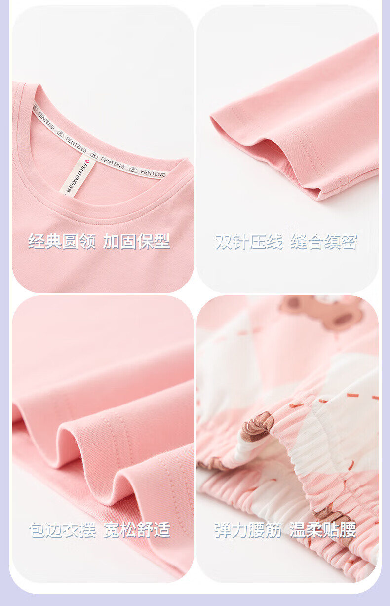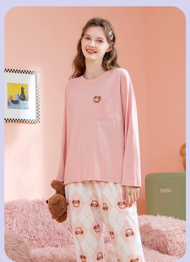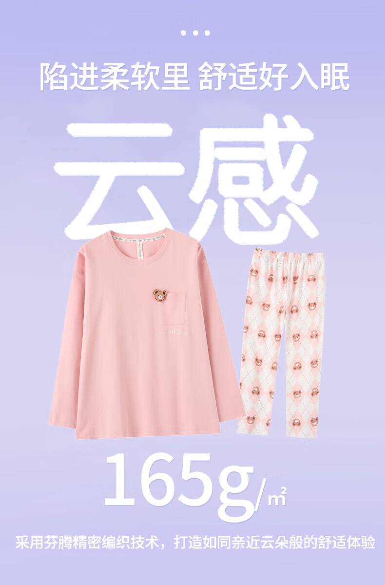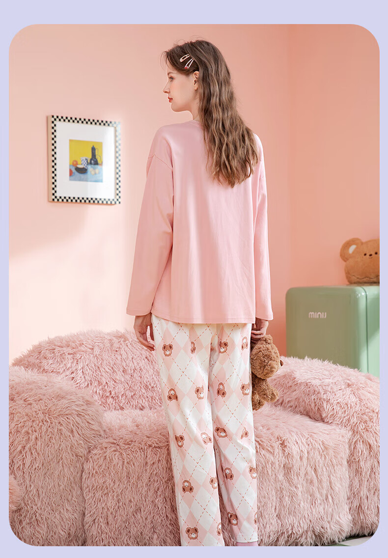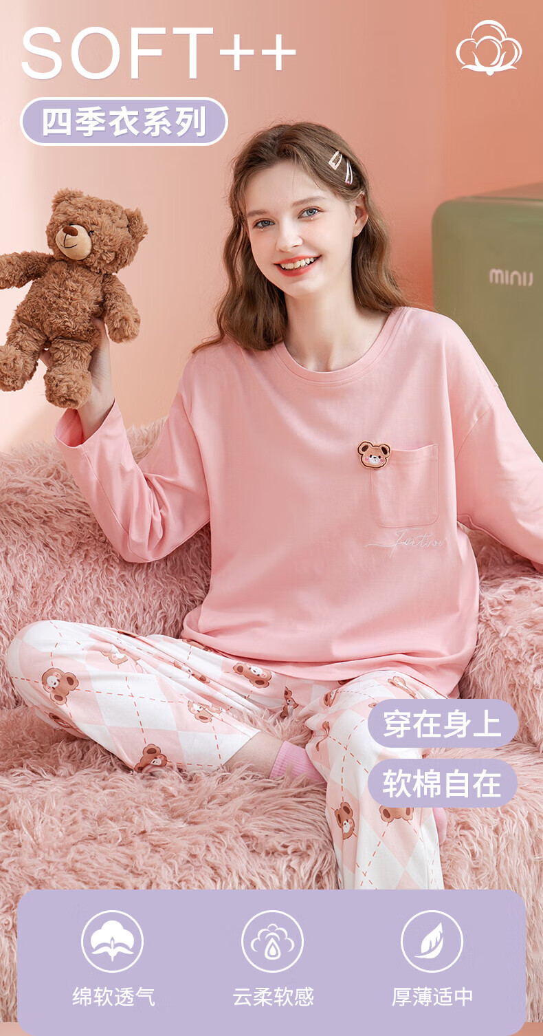 芬腾睡衣女圆领长袖甜美外穿纯棉棉家居服女士睡衣套装 浅兰 L
