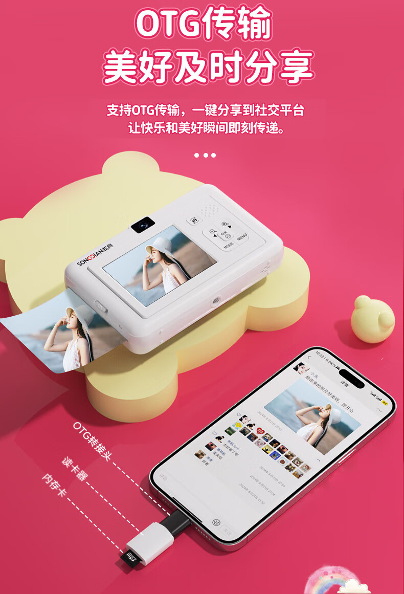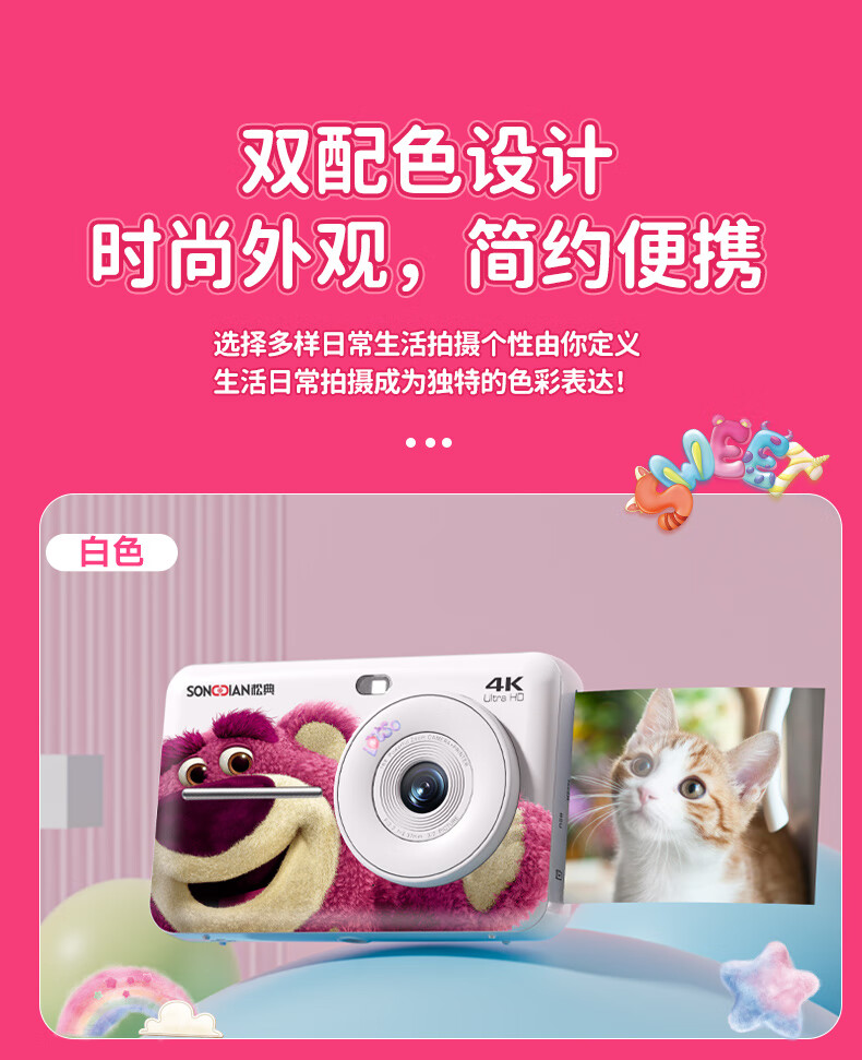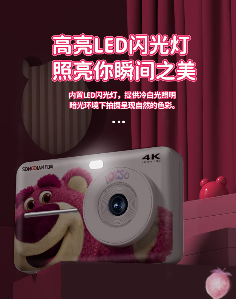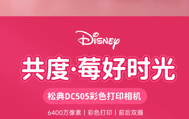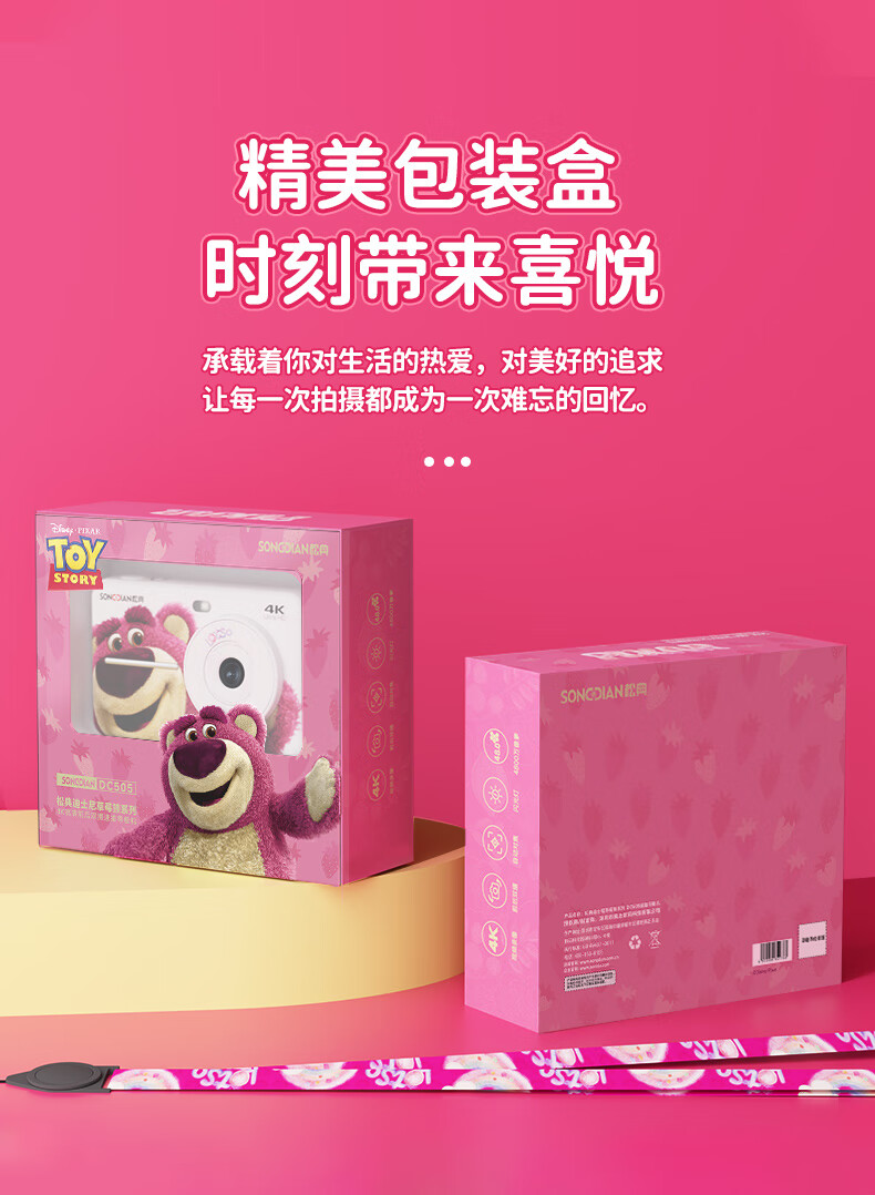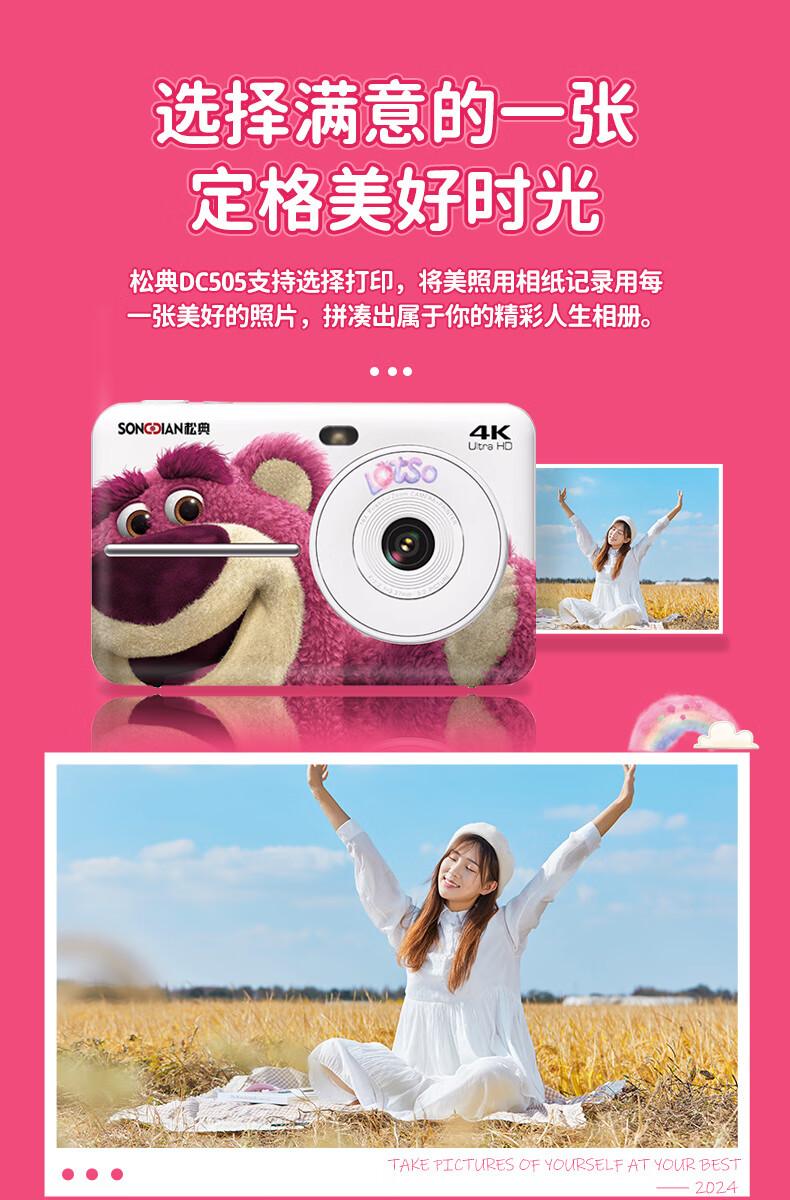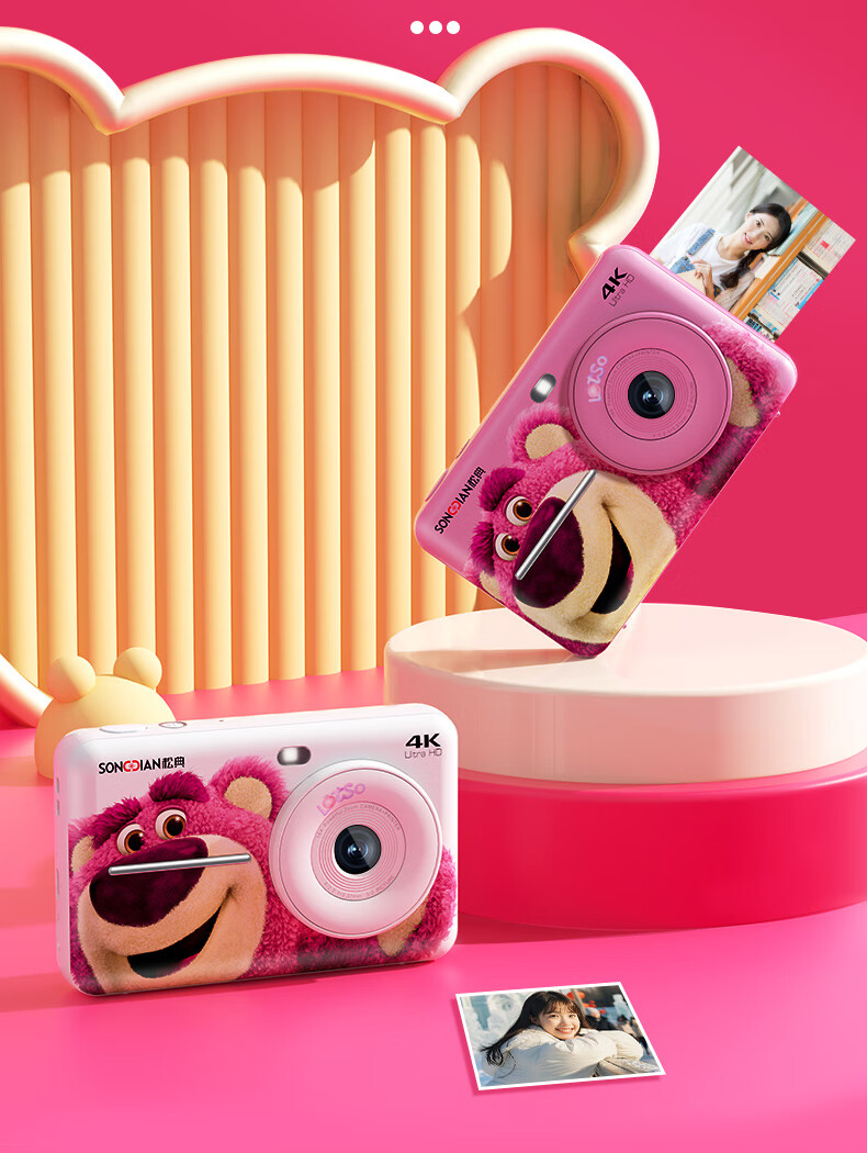 松典(SONGDIAN)拍立得草莓熊联名相机前后双摄 一次成像即拍即得旅游礼物 DC505 白色 【32G内存+30张相纸】