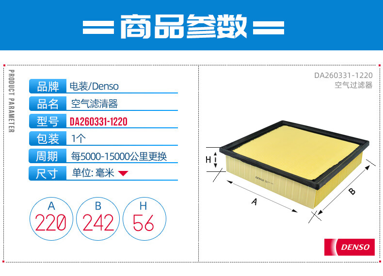 电装(DENSO)空气滤清器260331-1220(适配15-18款新汉兰达2.0T/塞纳RX270)