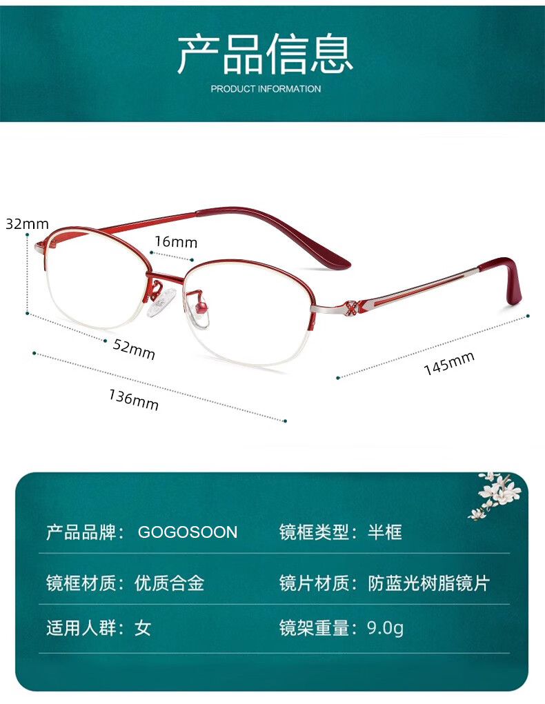 GOGOSOON老花眼镜女士防蓝光辐射品牌高档正品高清中老年人时尚老花镜开学