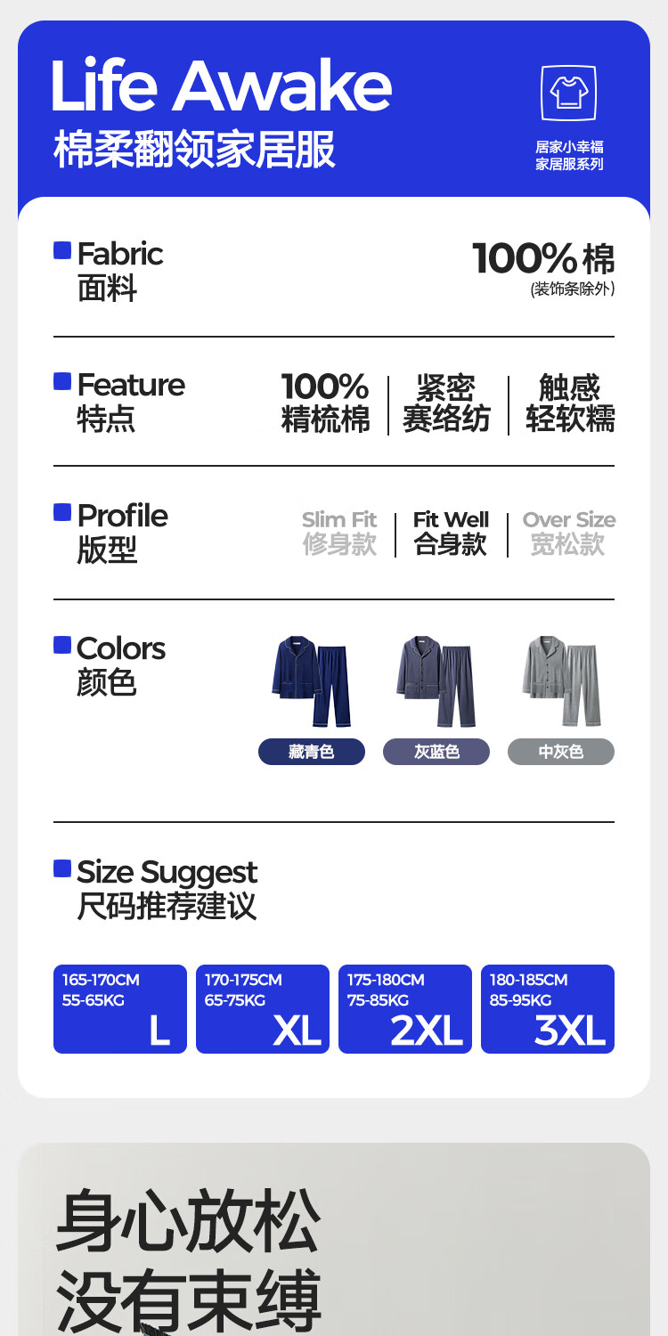 海澜之家男士睡衣男四季通用翻领开衫纯棉100%棉可外穿长袖长裤家居服套装
