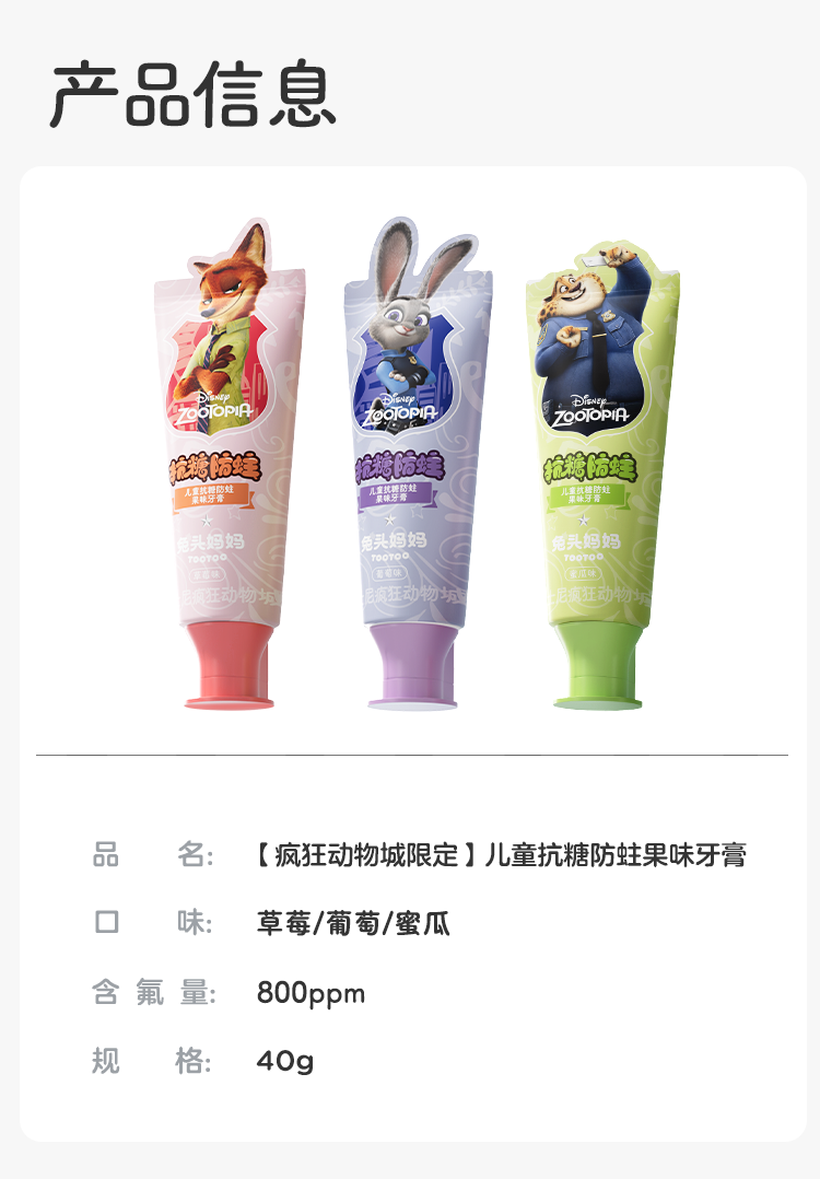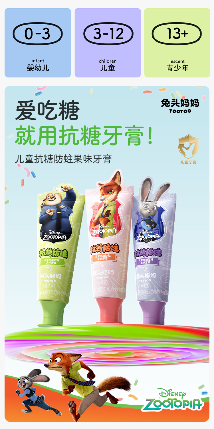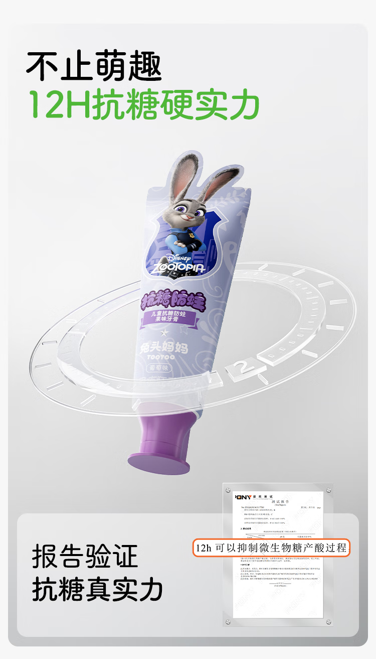 兔头妈妈迪士尼疯狂动物城联名抗糖防蛀儿童牙膏1-3-12岁葡萄味40g