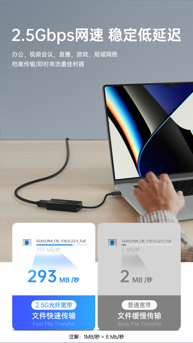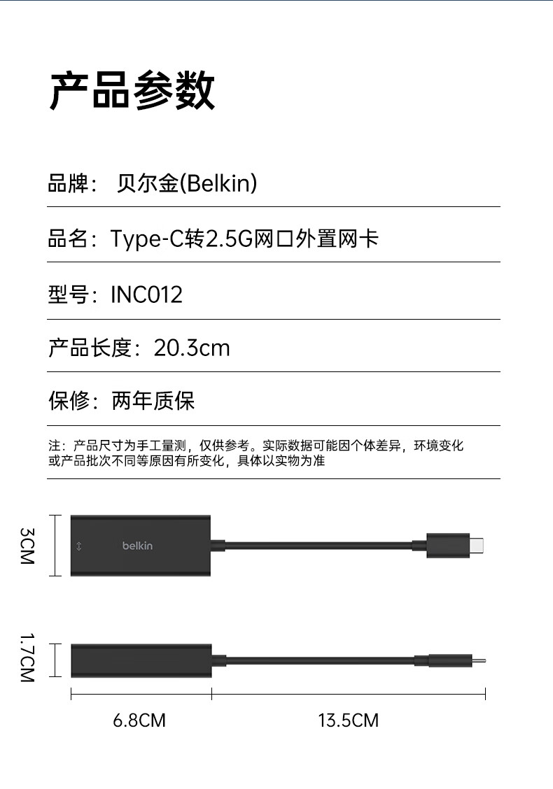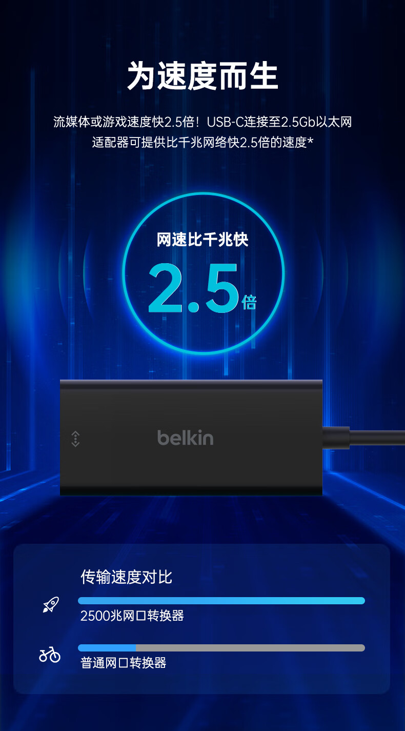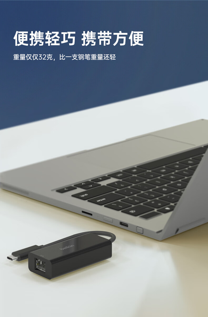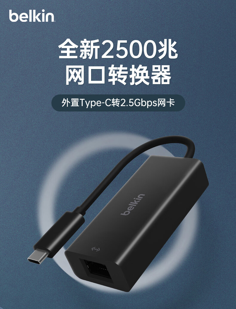 贝尔金(BELKIN)扩展坞 Type-C转网口 2.5Gbps超千兆网口转接 USB网线拓展 网络转接头 INC012