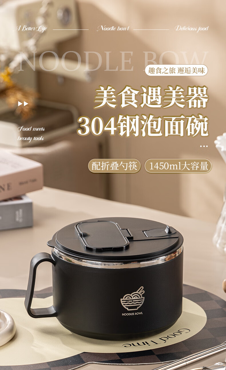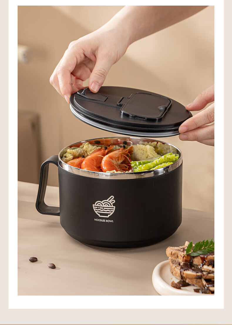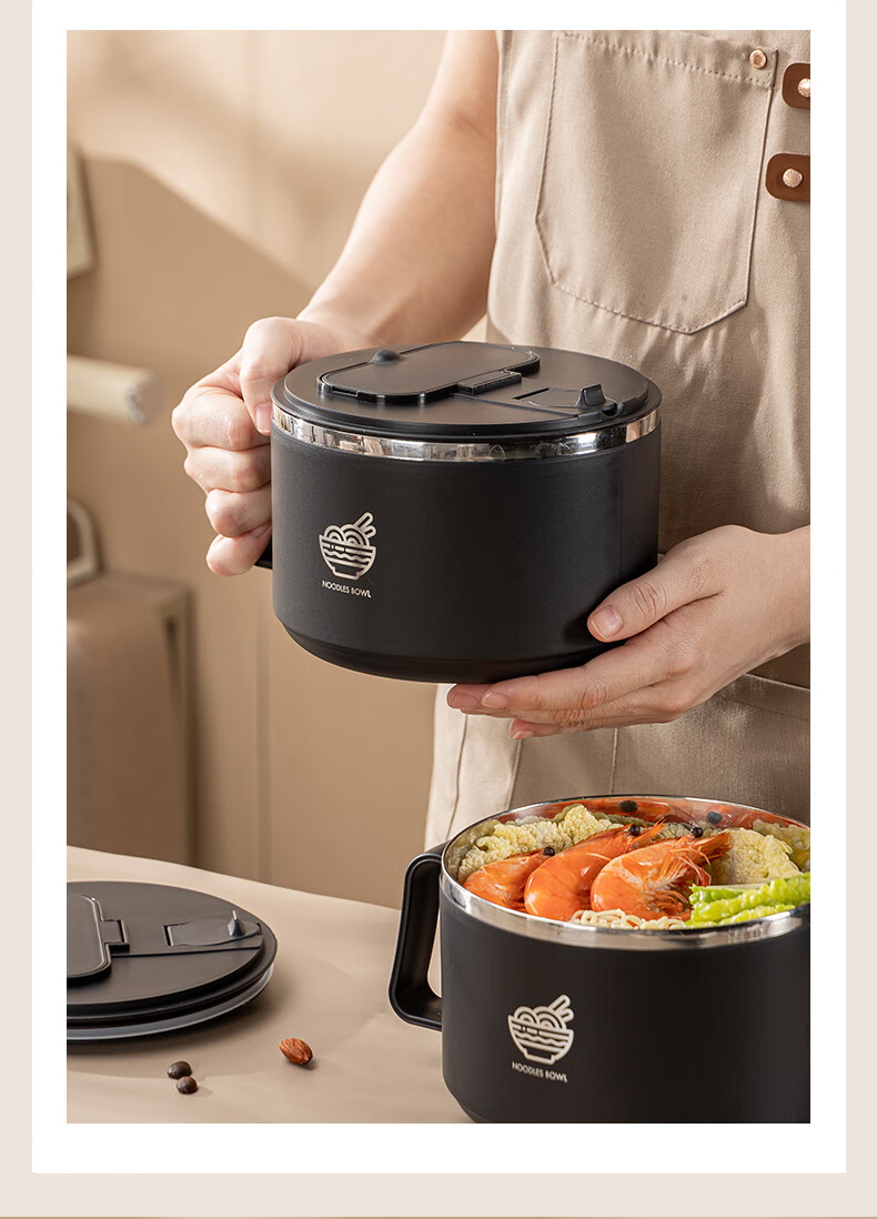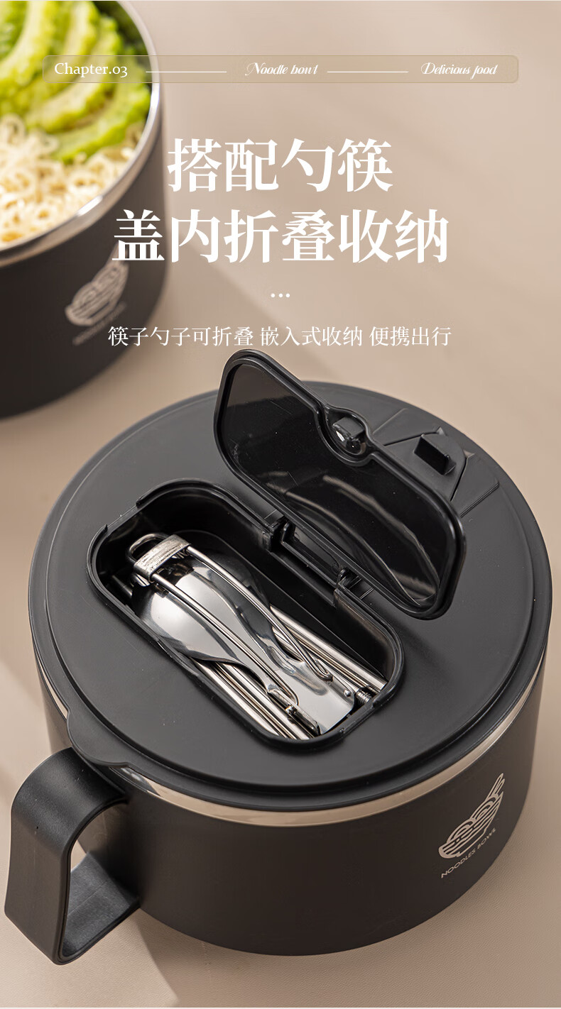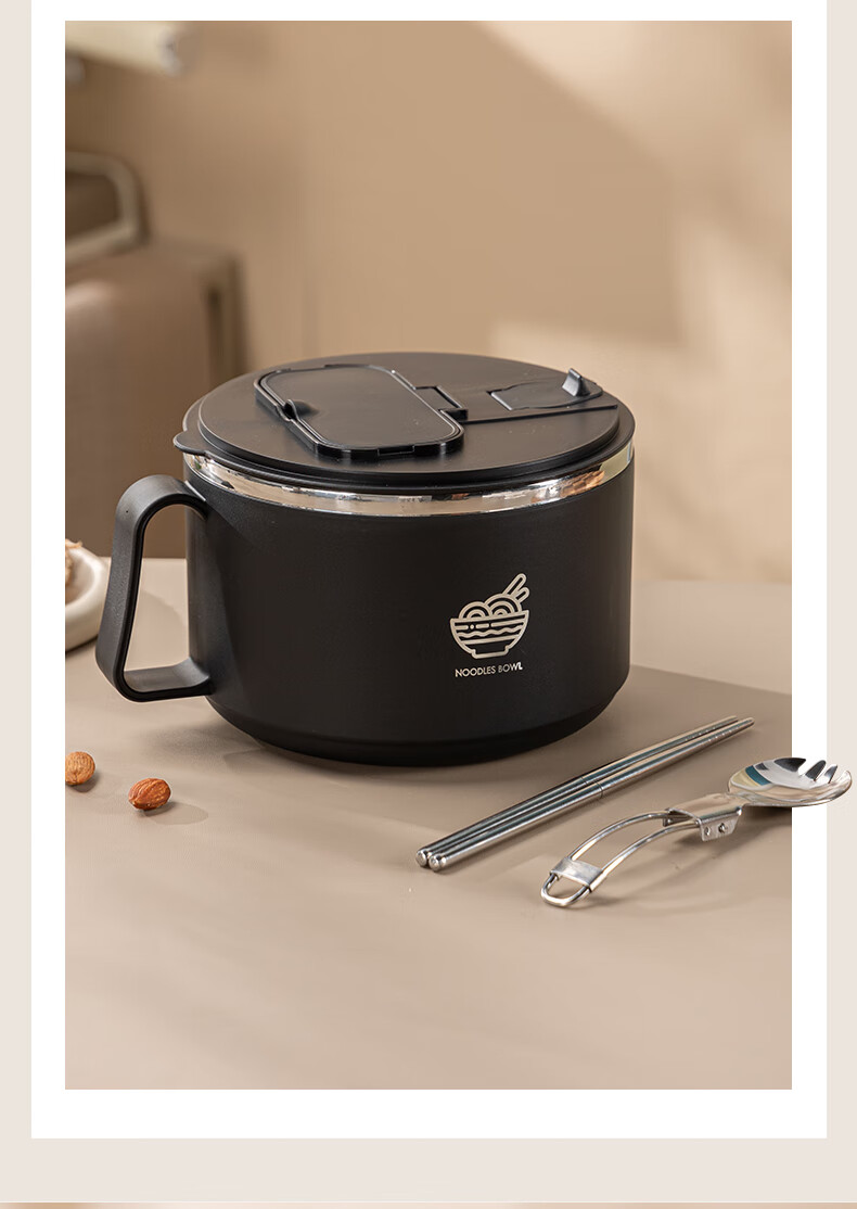 广意 304不锈钢泡面碗 学生上班族饭盒大容量大号 黑色配勺筷GY7348