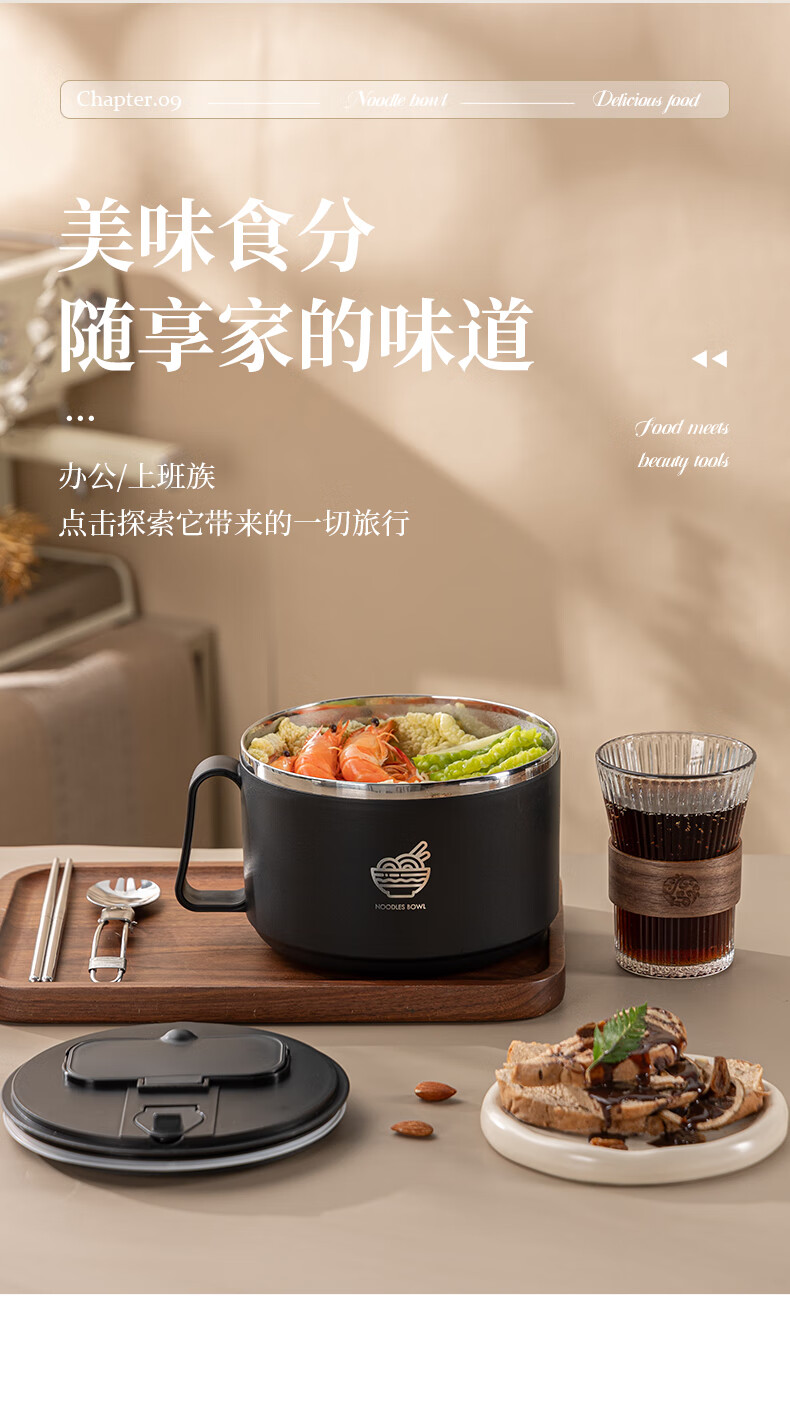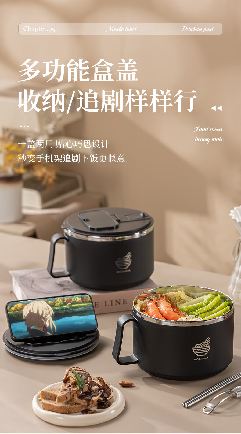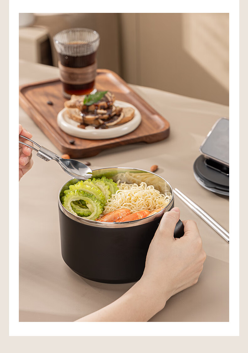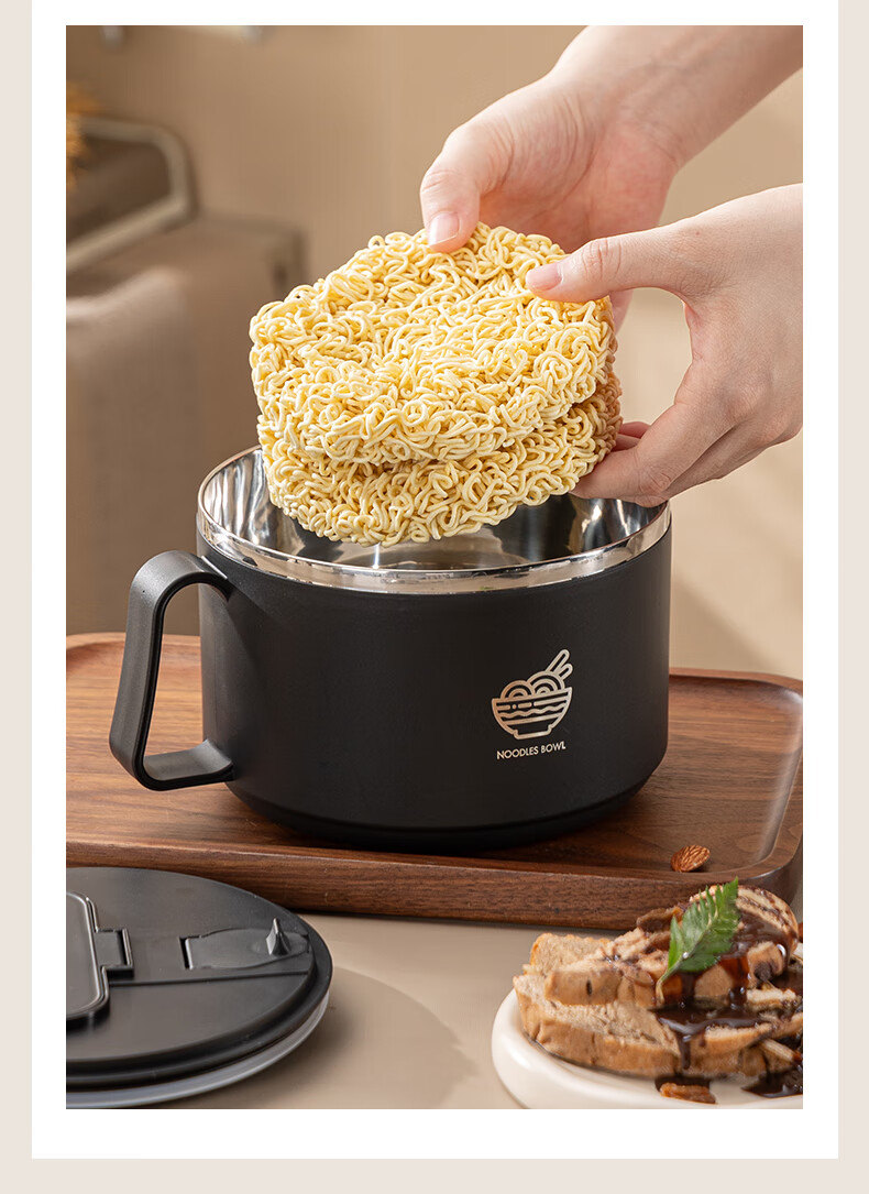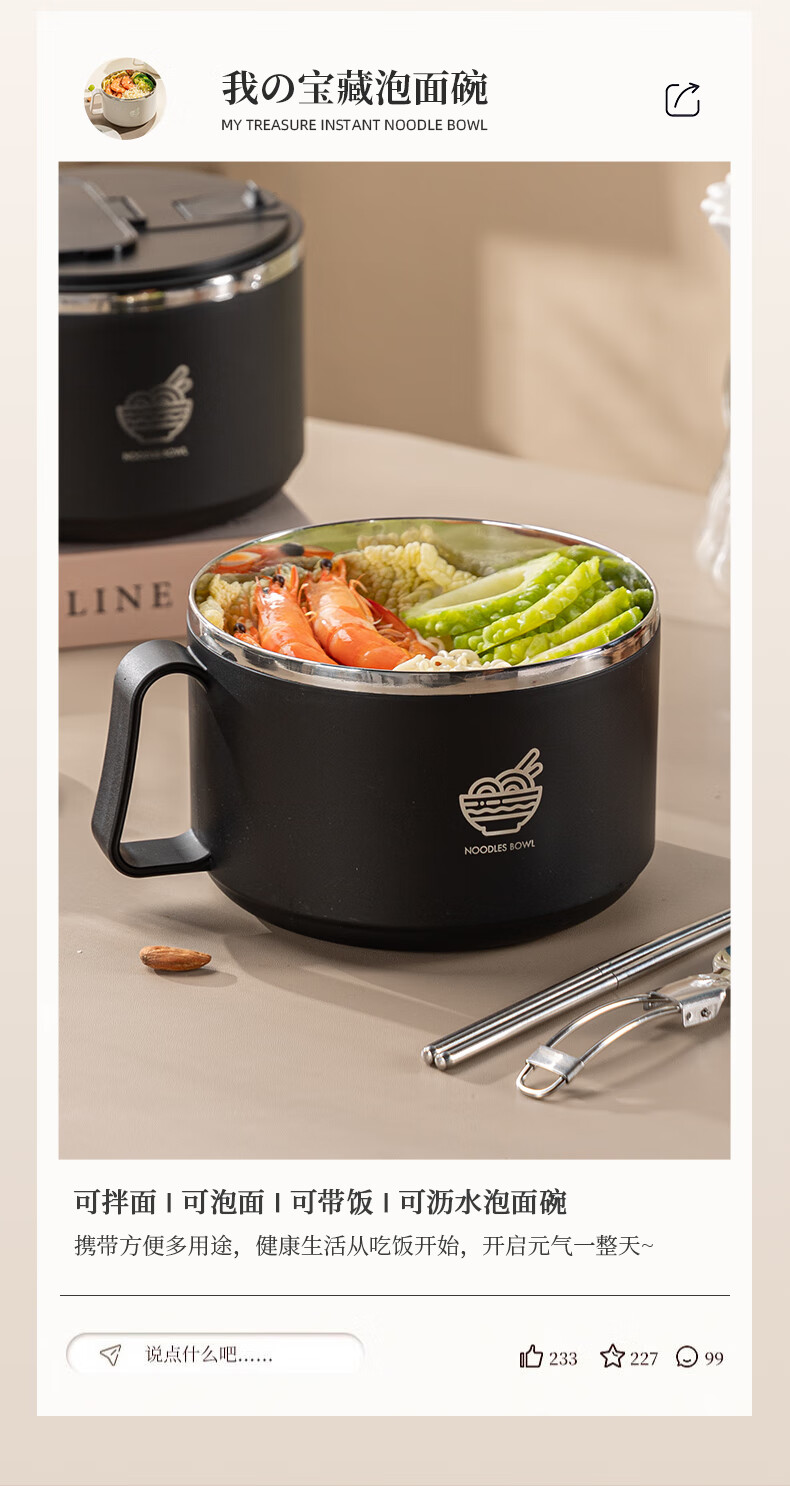 广意 304不锈钢泡面碗 学生上班族饭盒大容量大号 黑色配勺筷GY7348