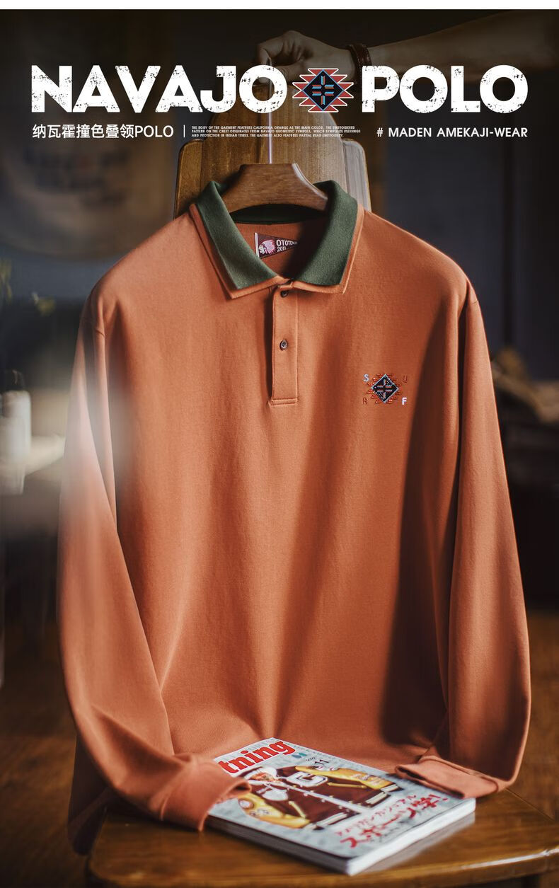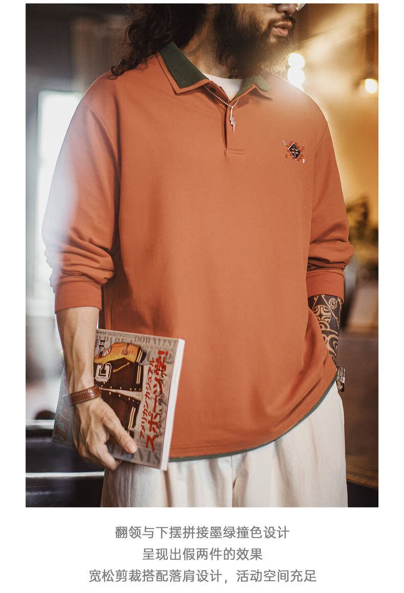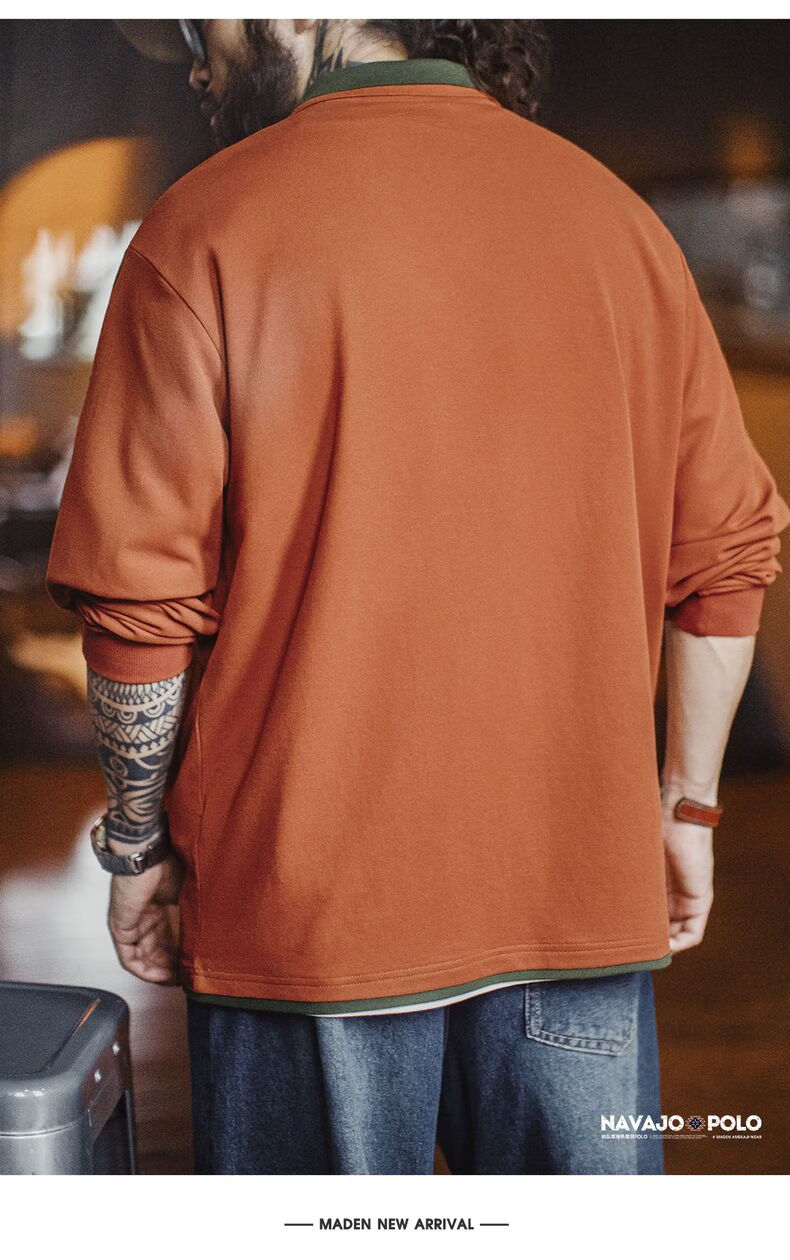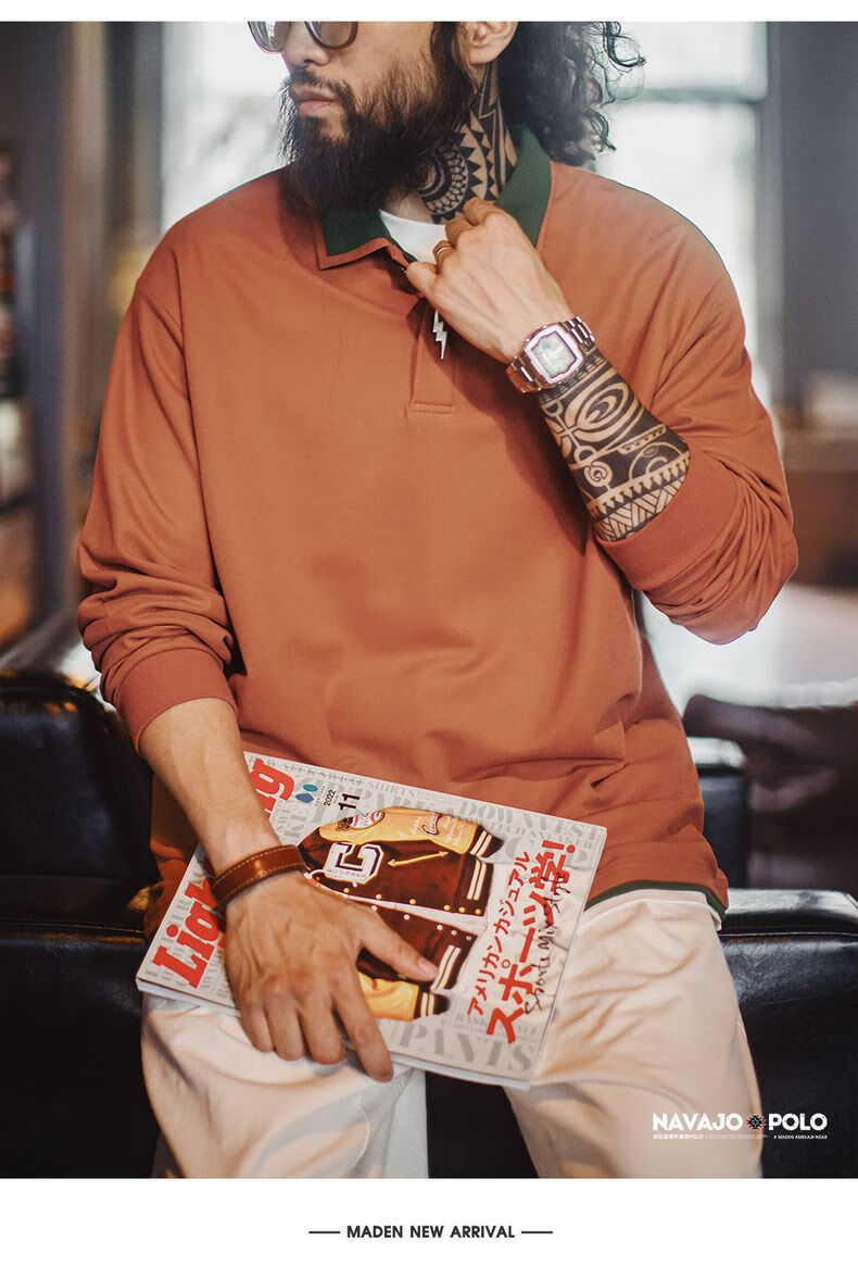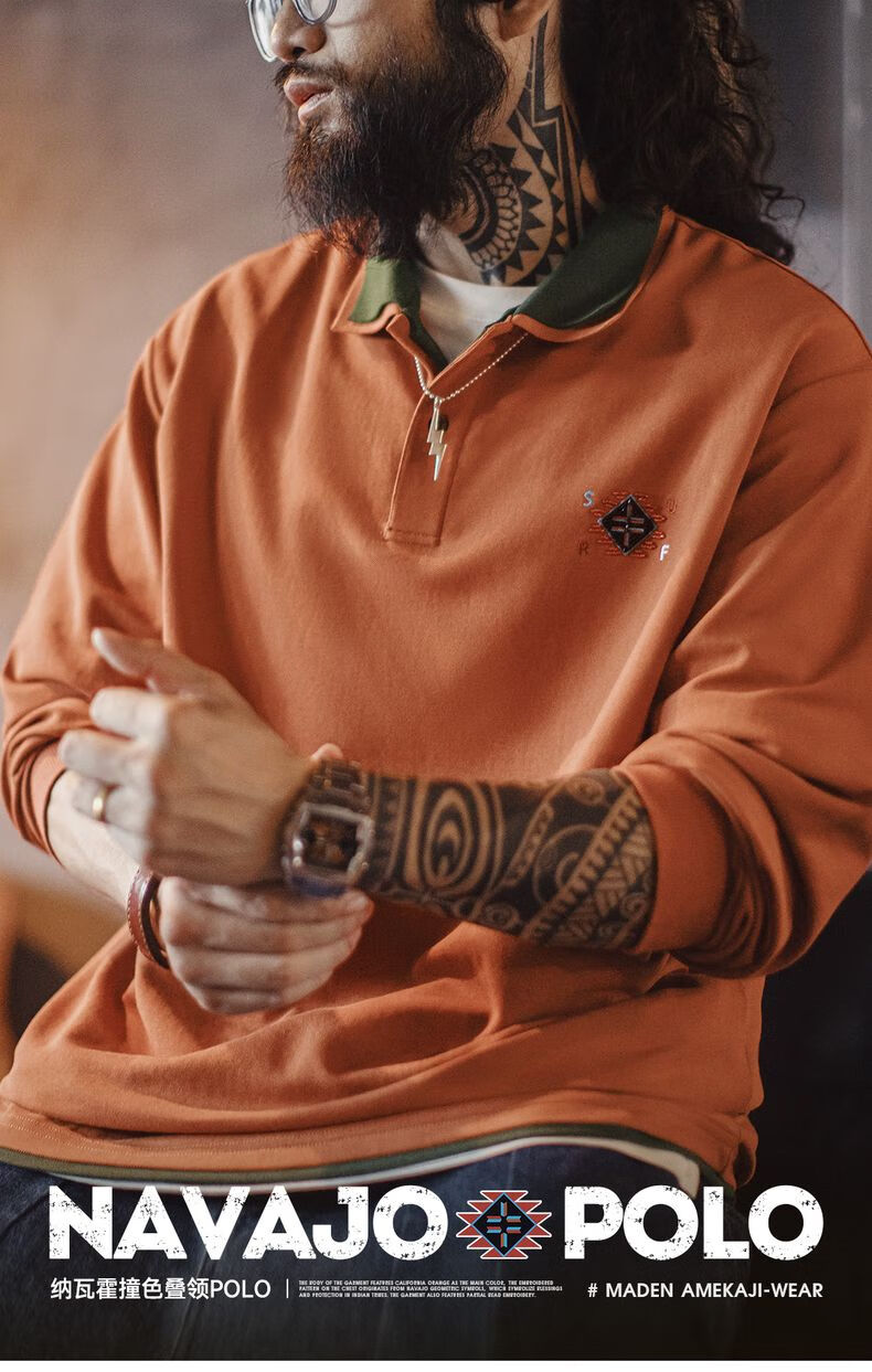 马登工装美式复古纳瓦霍撞色叠领polo衫男秋季假两件宽松男士长袖T恤 加州橙 L