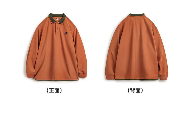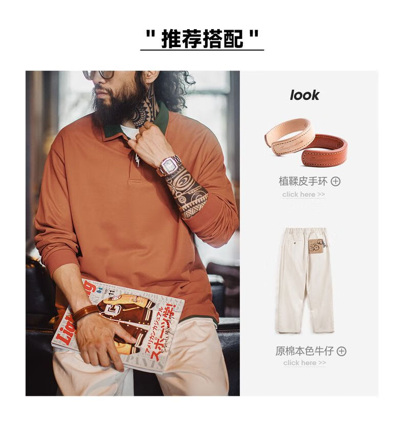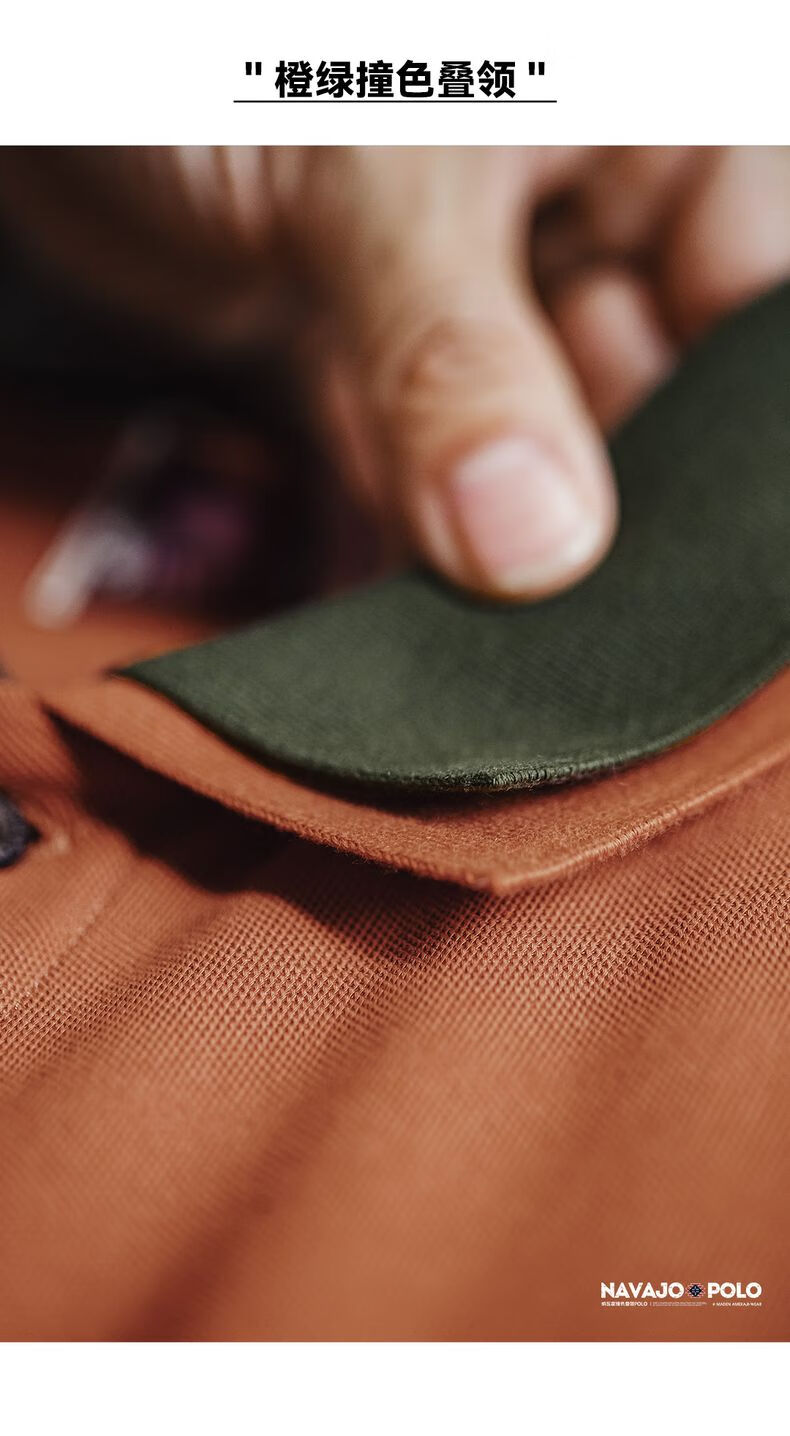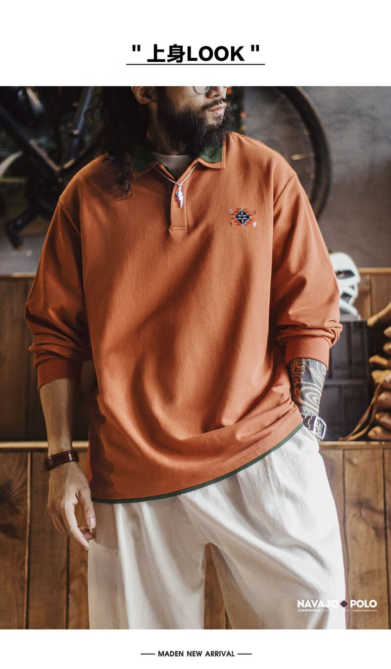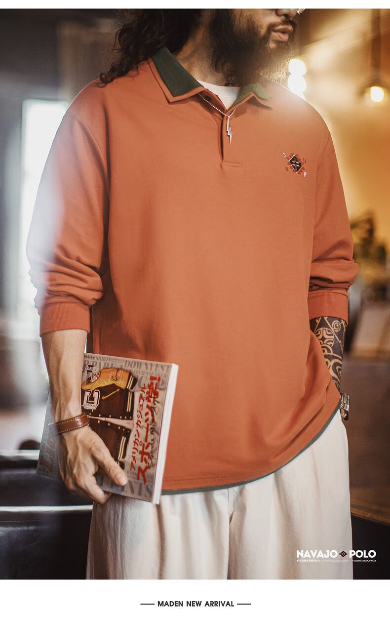 马登工装美式复古纳瓦霍撞色叠领polo衫男秋季假两件宽松男士长袖T恤 加州橙 L