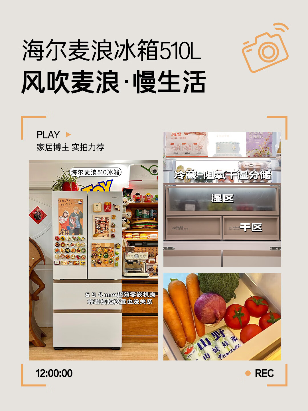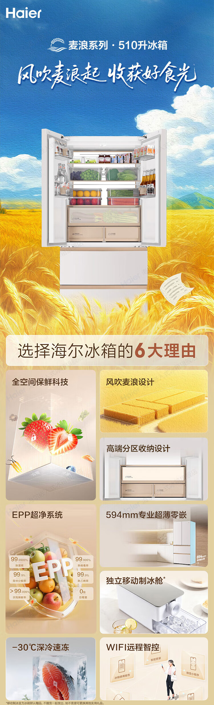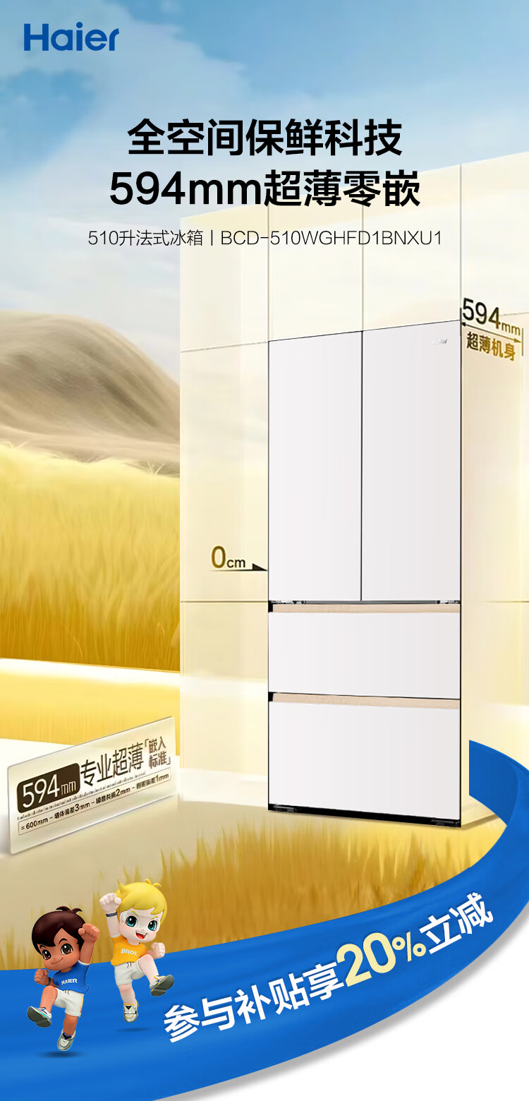 海尔(Haier)麦浪冰箱510升专业超薄零嵌入式全空间保鲜四门法式多门一级能效双变频国家补贴大容量家用电冰箱 510升麦浪+594超薄嵌+全空间保鲜+EPP超净