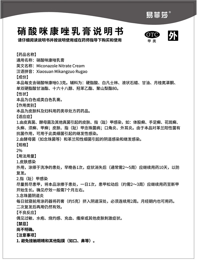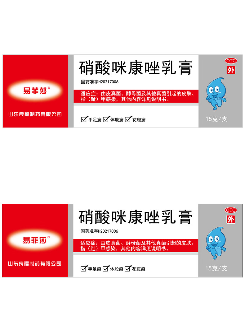 易菲莎 硝酸咪康唑乳膏2%*15g/支 治疗甲沟炎口角炎真菌感染手足癣体股癬头癬须癬甲癬花斑癣皮肤念珠菌感染