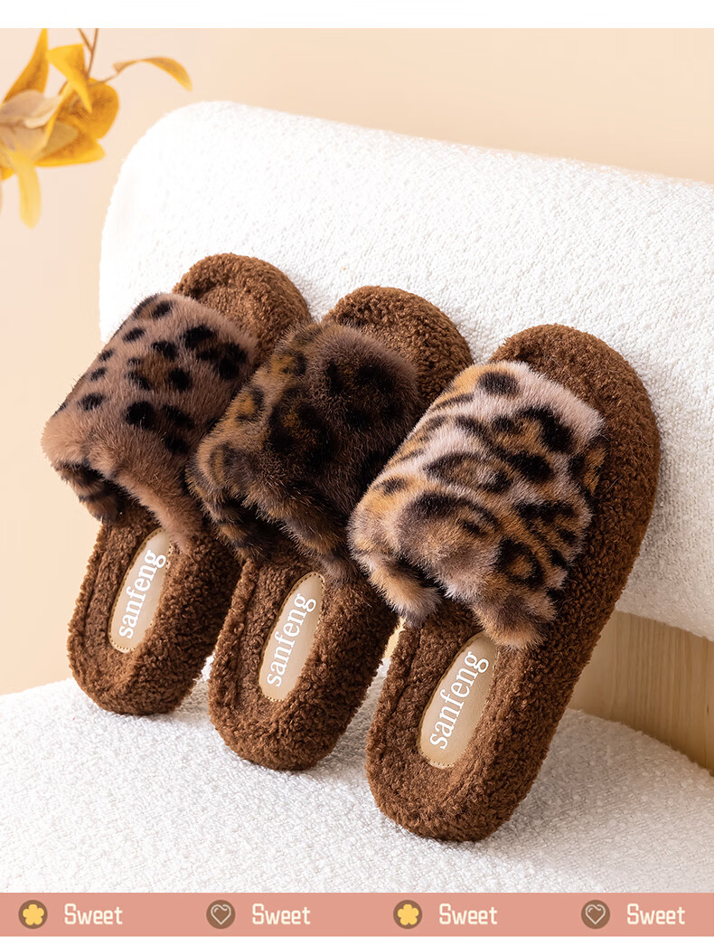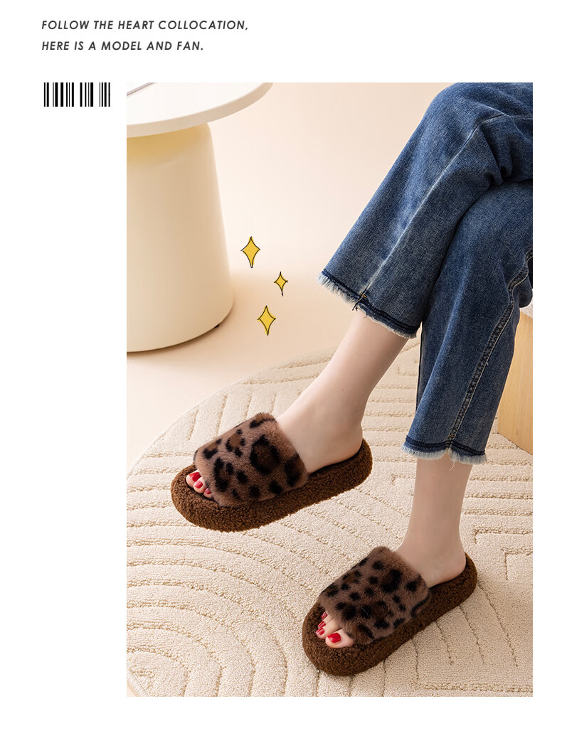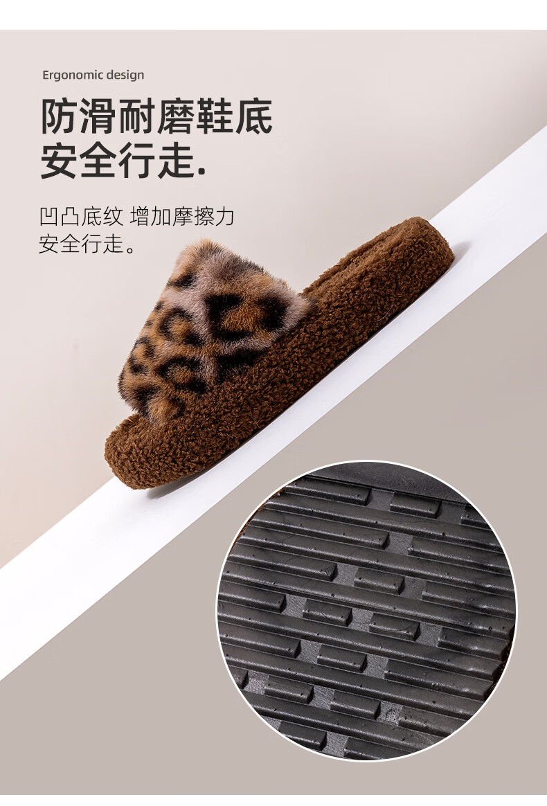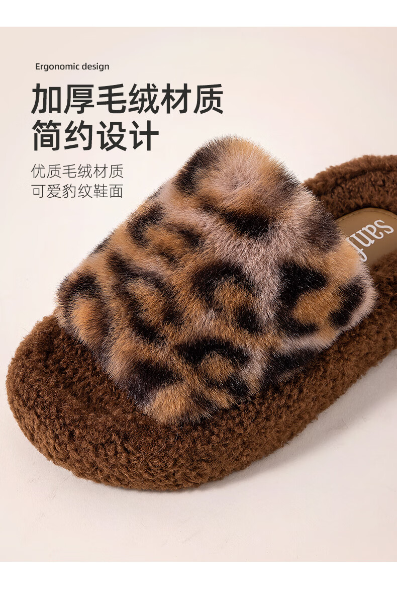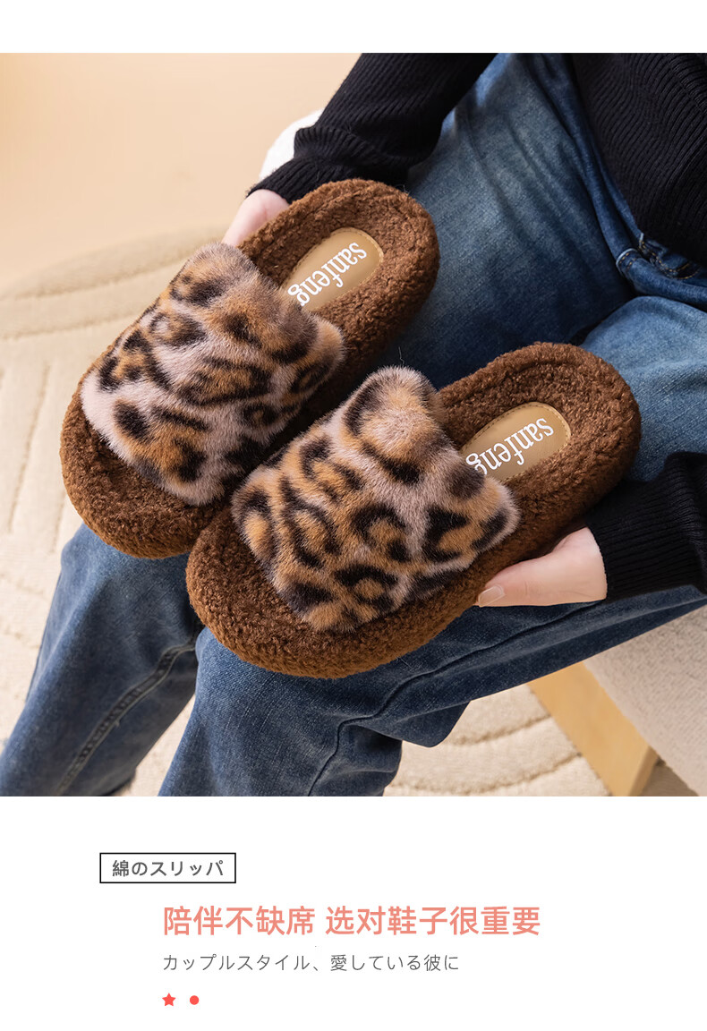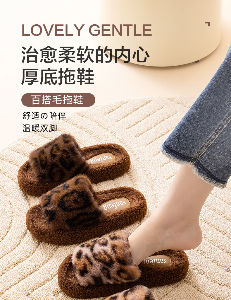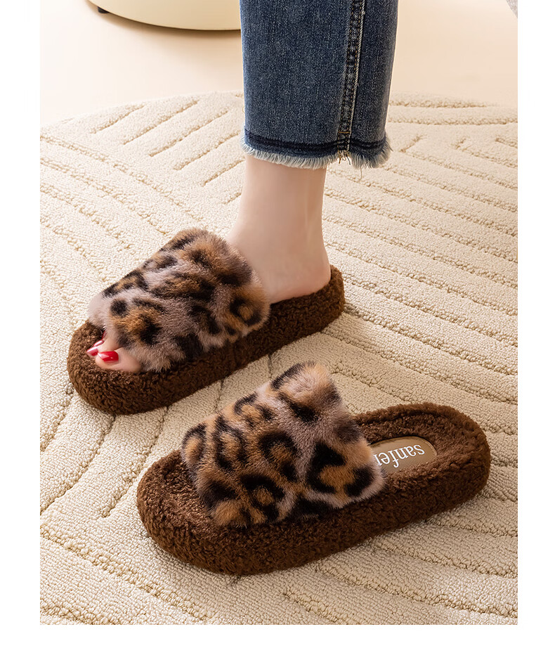 AILUKI日本秋冬季网红时尚百搭毛毛拖鞋女外穿一字拖潮鞋厚底棉拖鞋 A29豹纹:金咖 37 _38