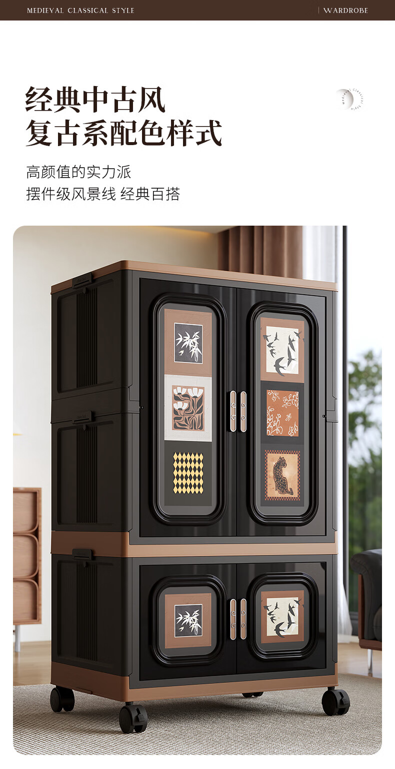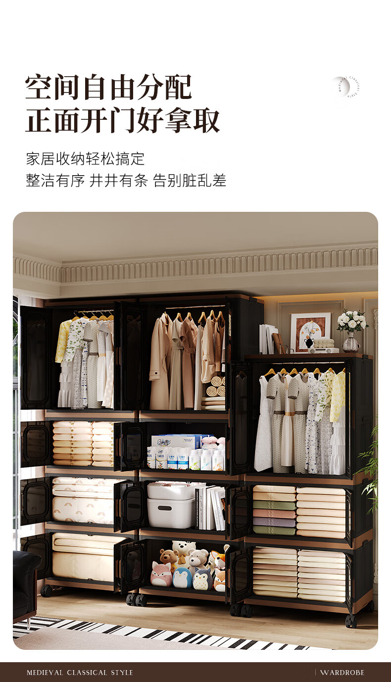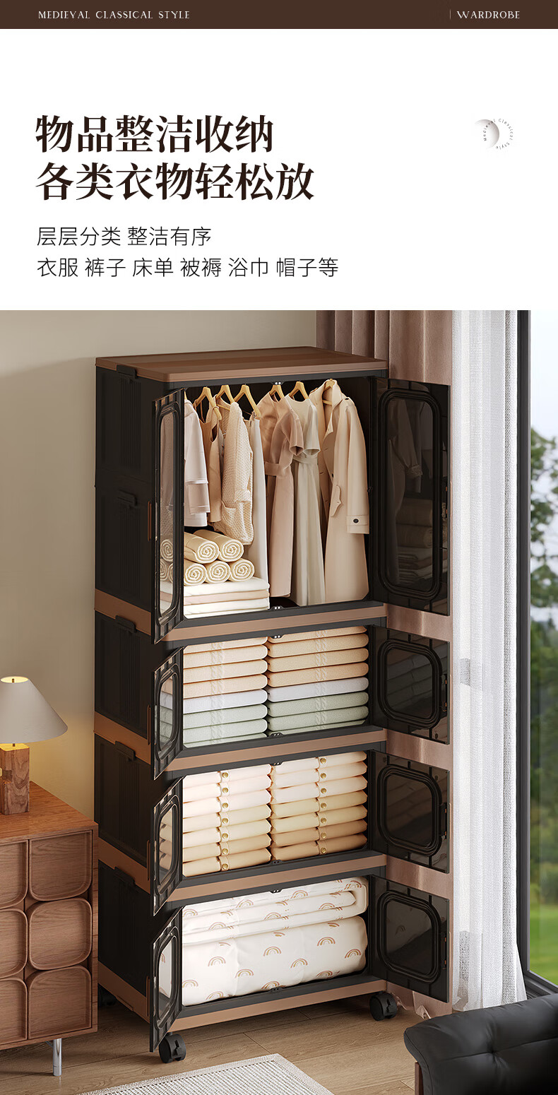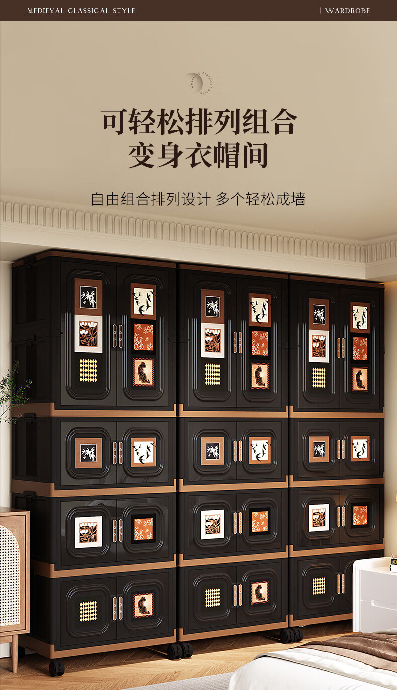 邦尼美家中古风简易衣柜家用卧室衣服被子收纳柜成人衣橱可折叠塑料储物柜 75cm面宽【1衣柜+3储物柜】 放心购【内含挂衣杆+衣架】