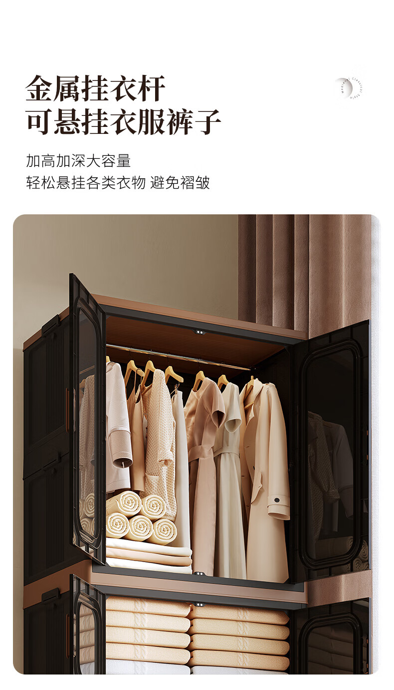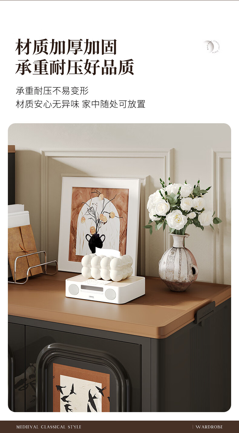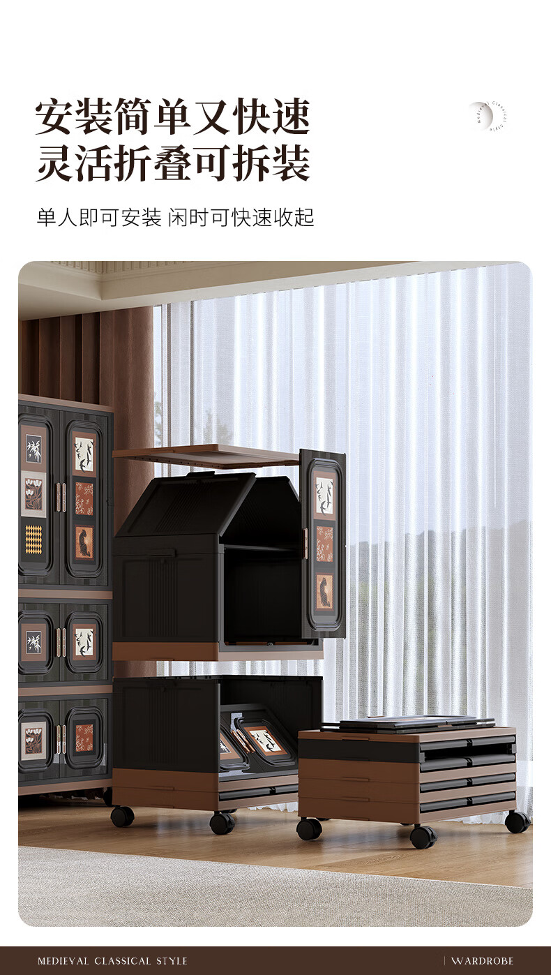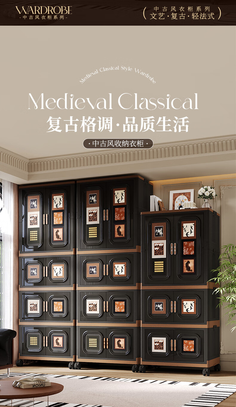 邦尼美家中古风简易衣柜家用卧室衣服被子收纳柜成人衣橱可折叠塑料储物柜 75cm面宽【1衣柜+3储物柜】 放心购【内含挂衣杆+衣架】