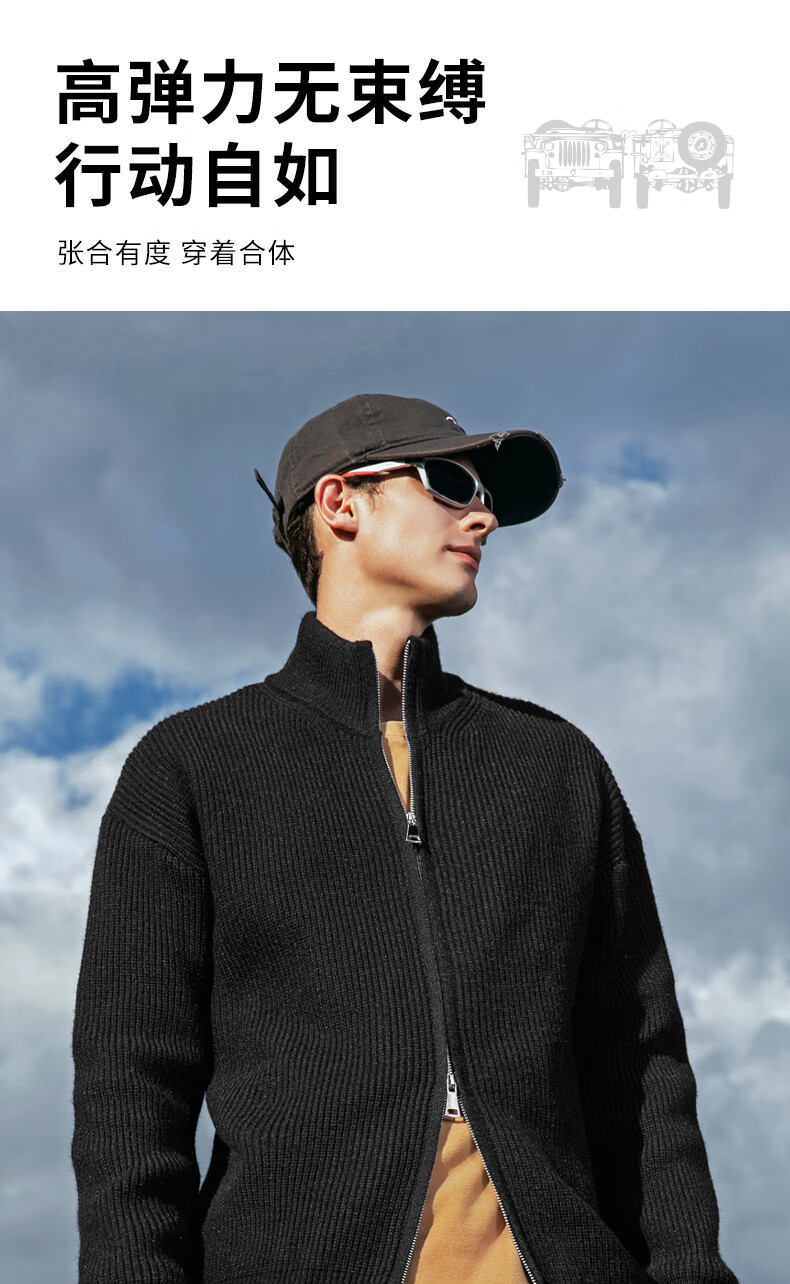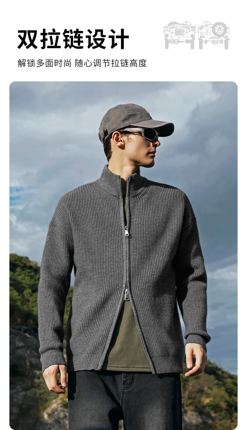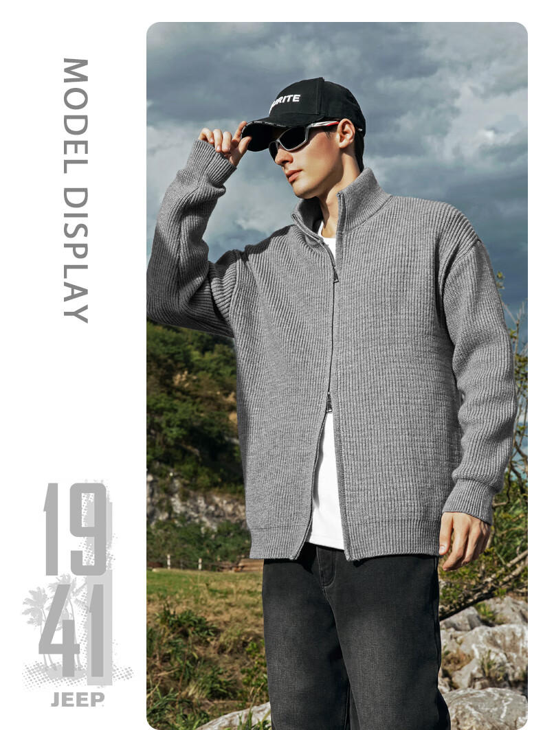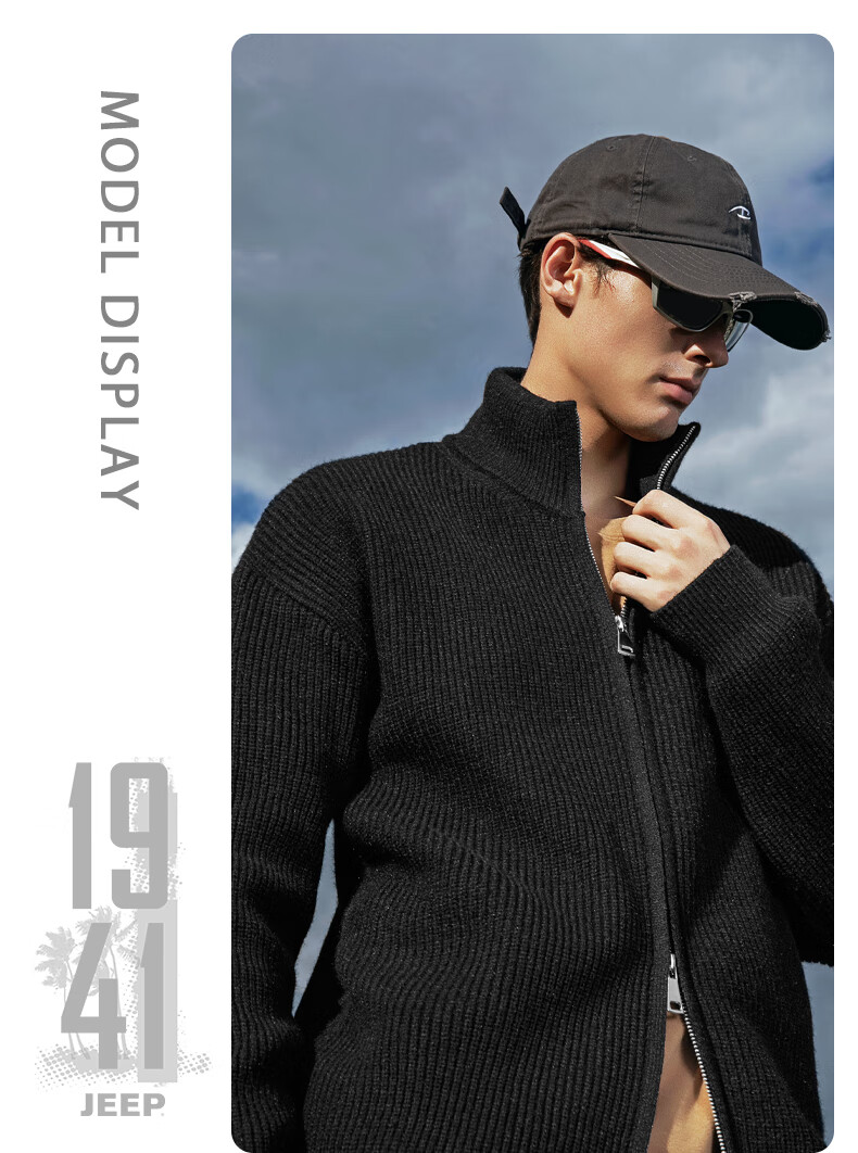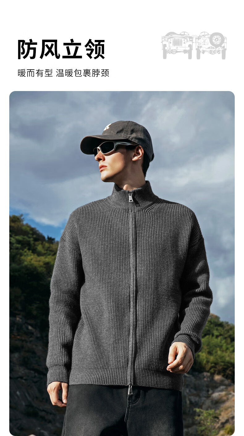 JEEP SPIRIT吉普美式潮牌毛衣男冬款重磅加厚开衫户外跑步防风立领男装针织衫