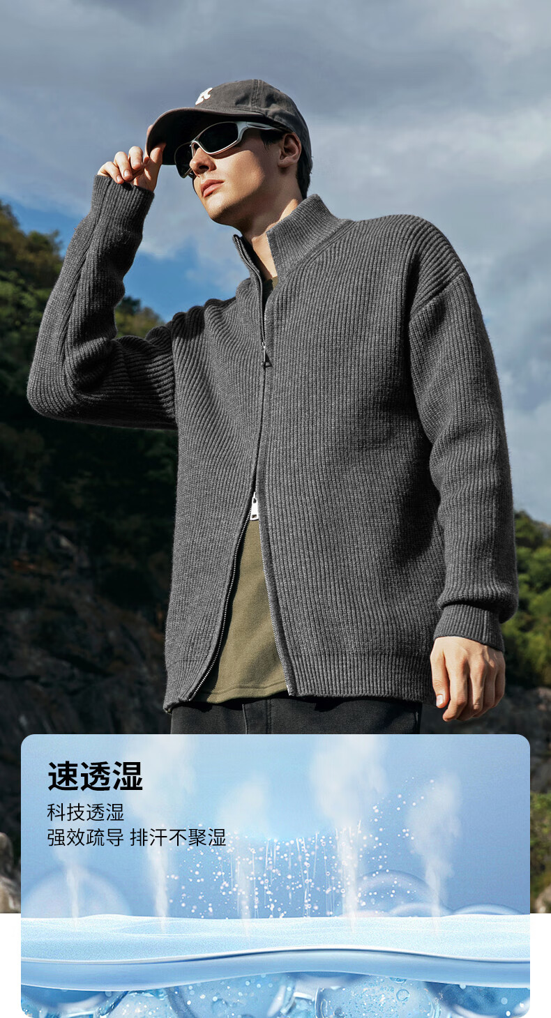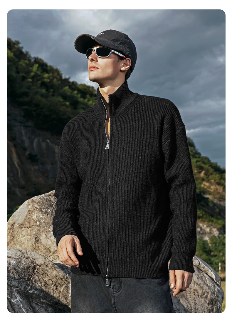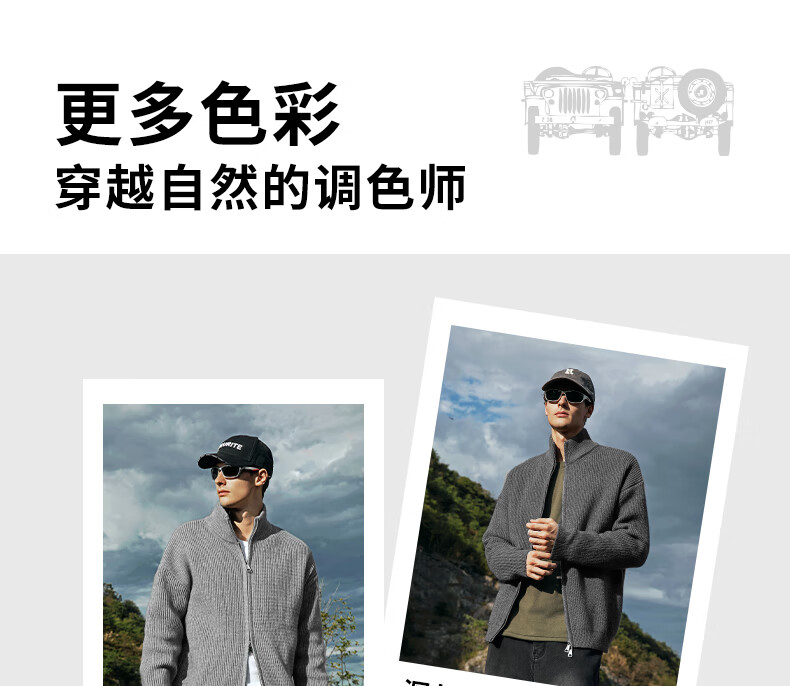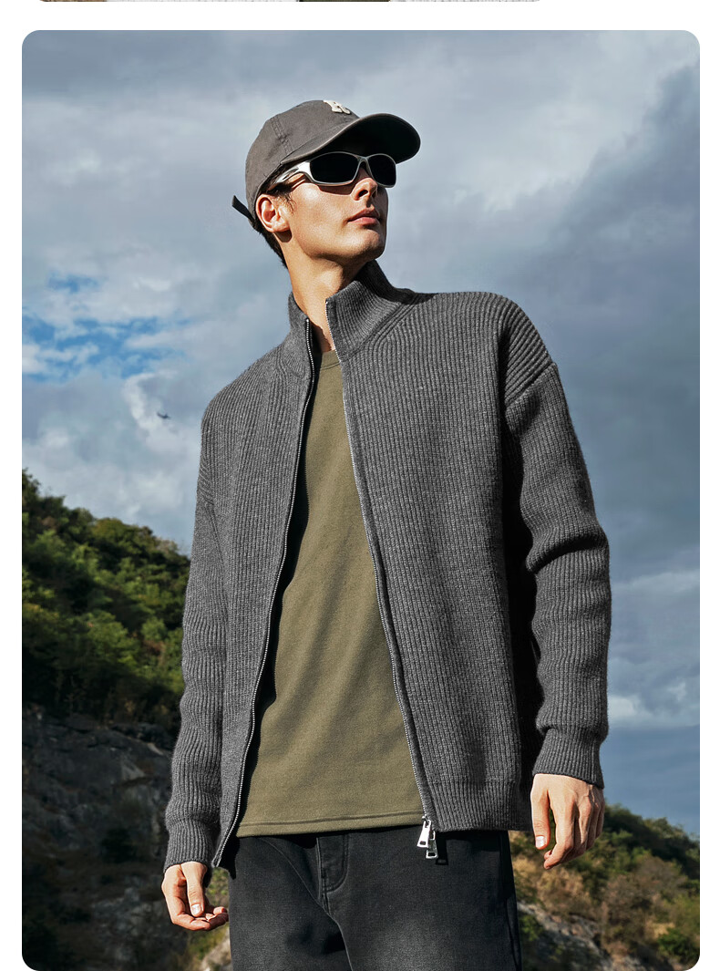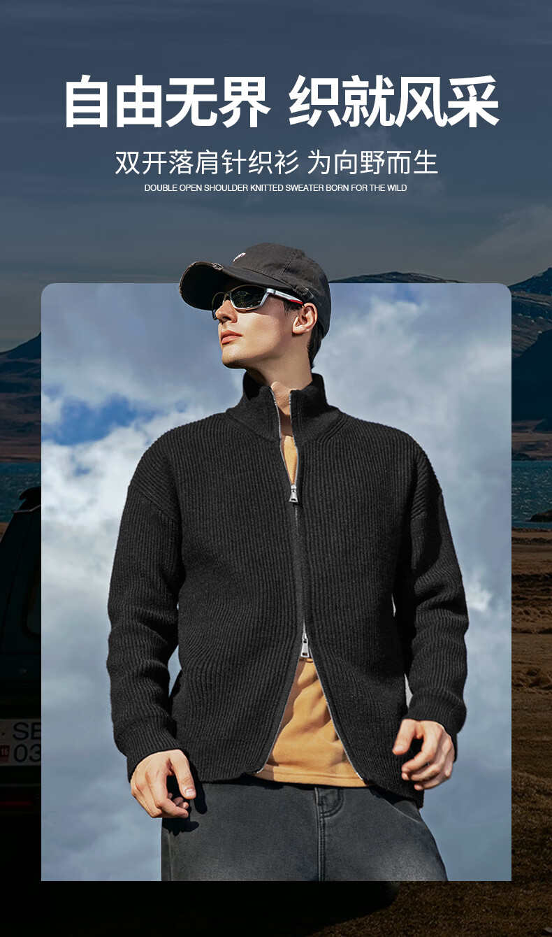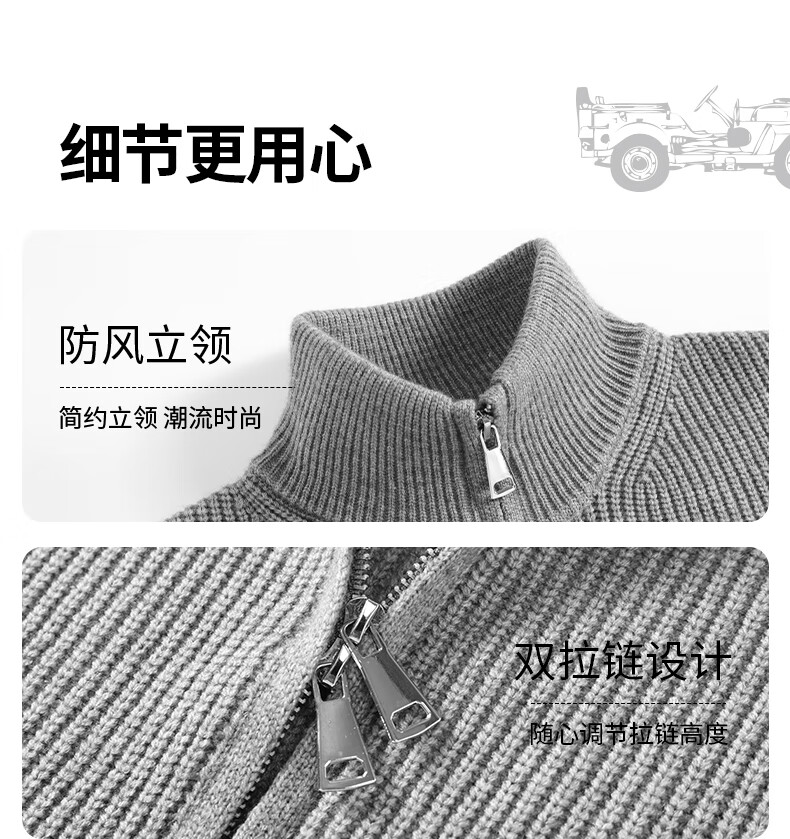 JEEP SPIRIT吉普美式潮牌毛衣男冬款重磅加厚开衫户外跑步防风立领男装针织衫