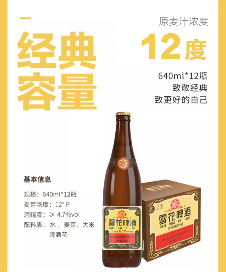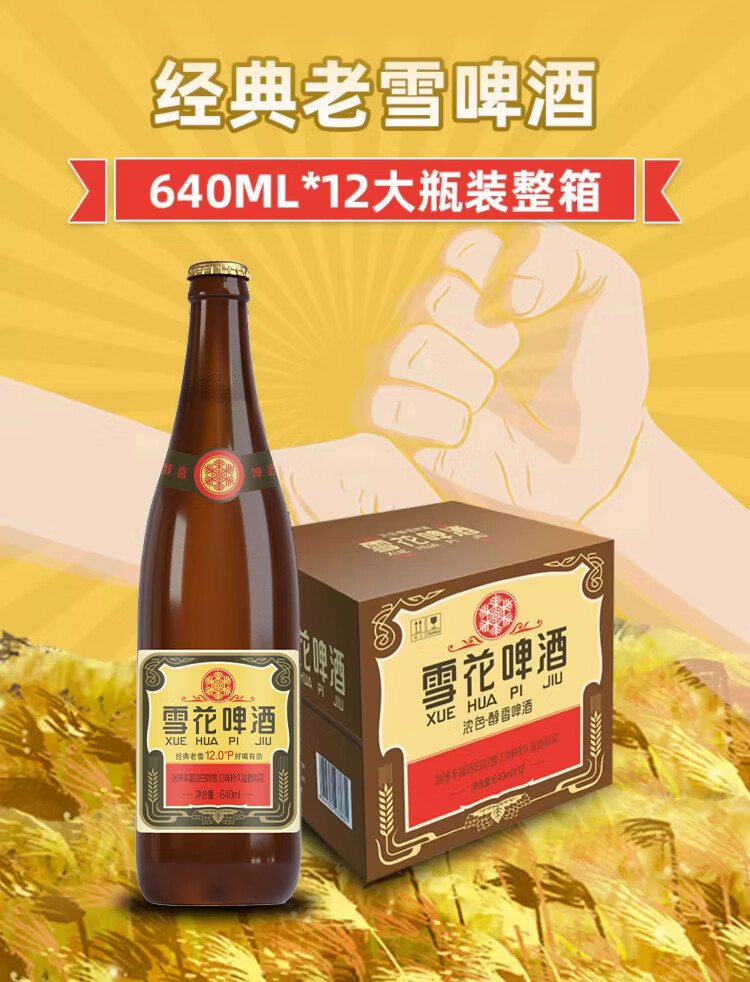 雪花啤酒【50万+人已购】经典沈阳老雪 640ml*12瓶经典醇厚高度数