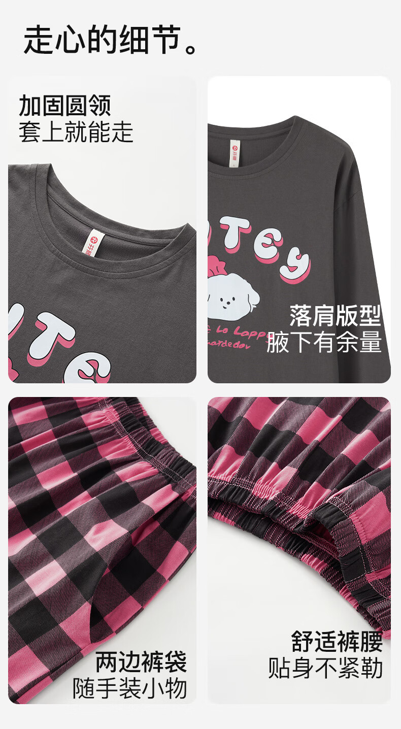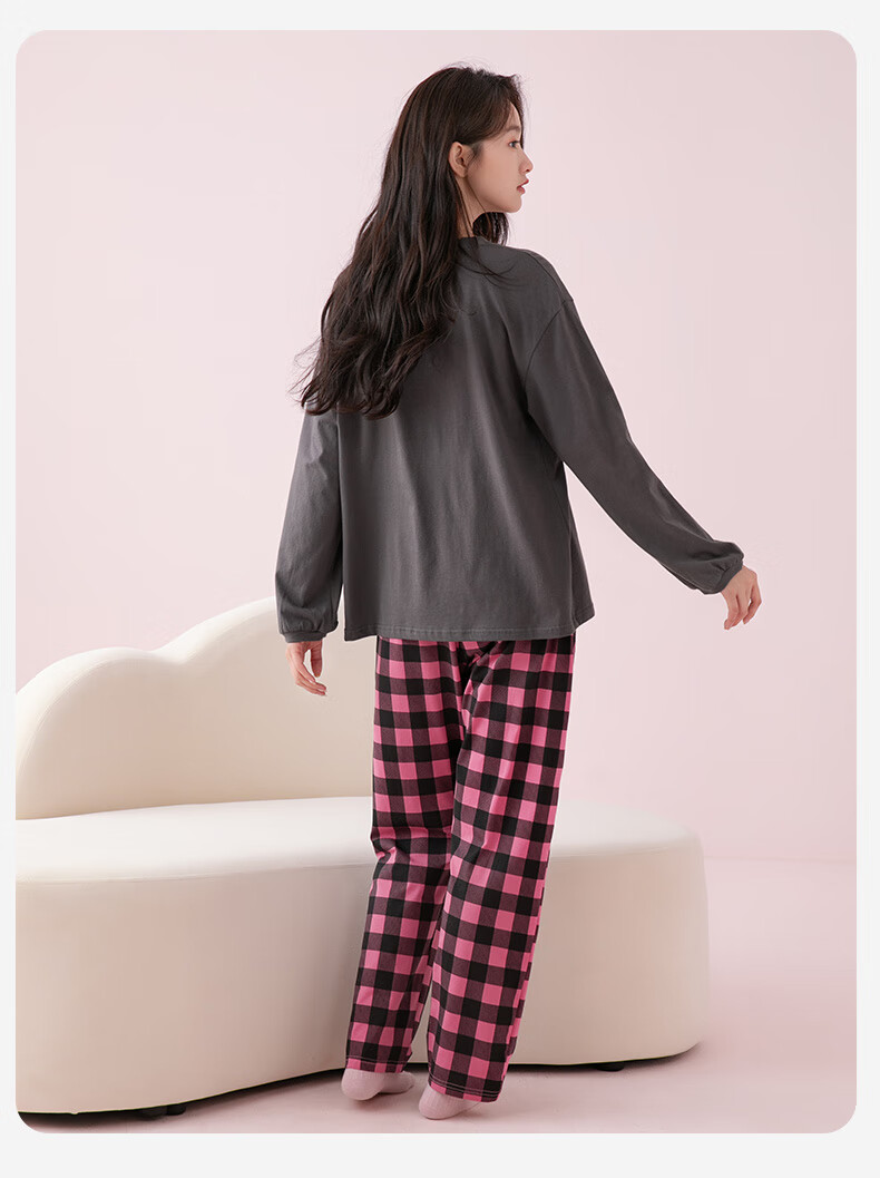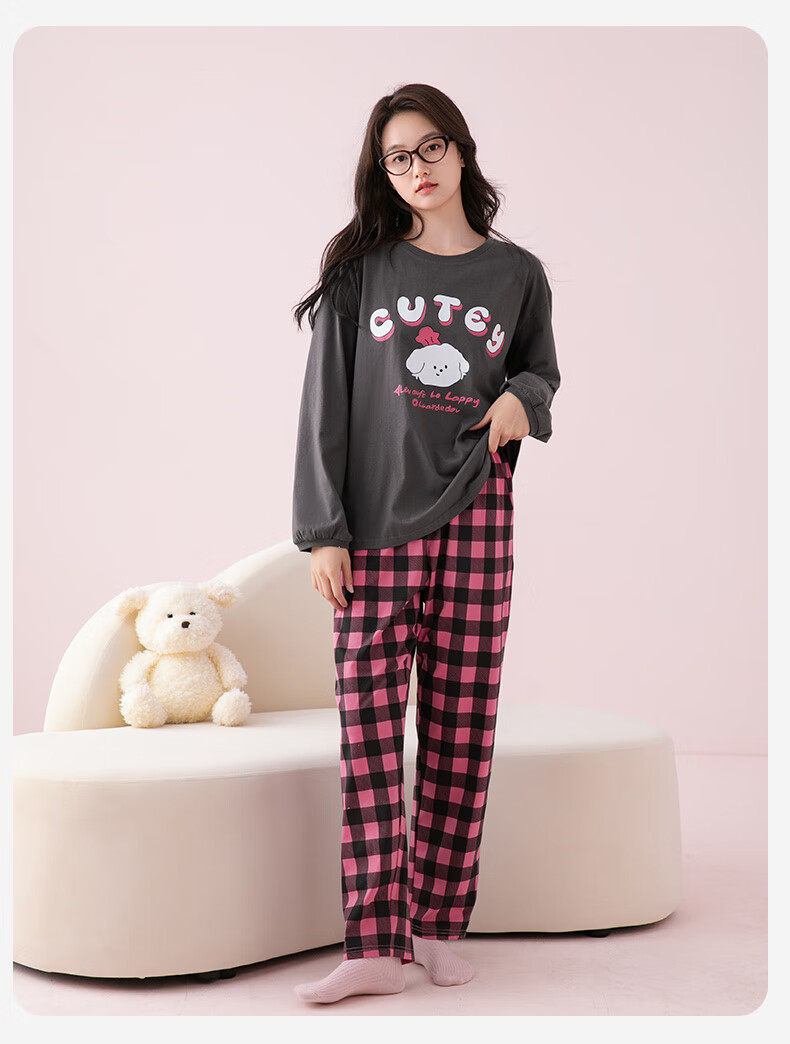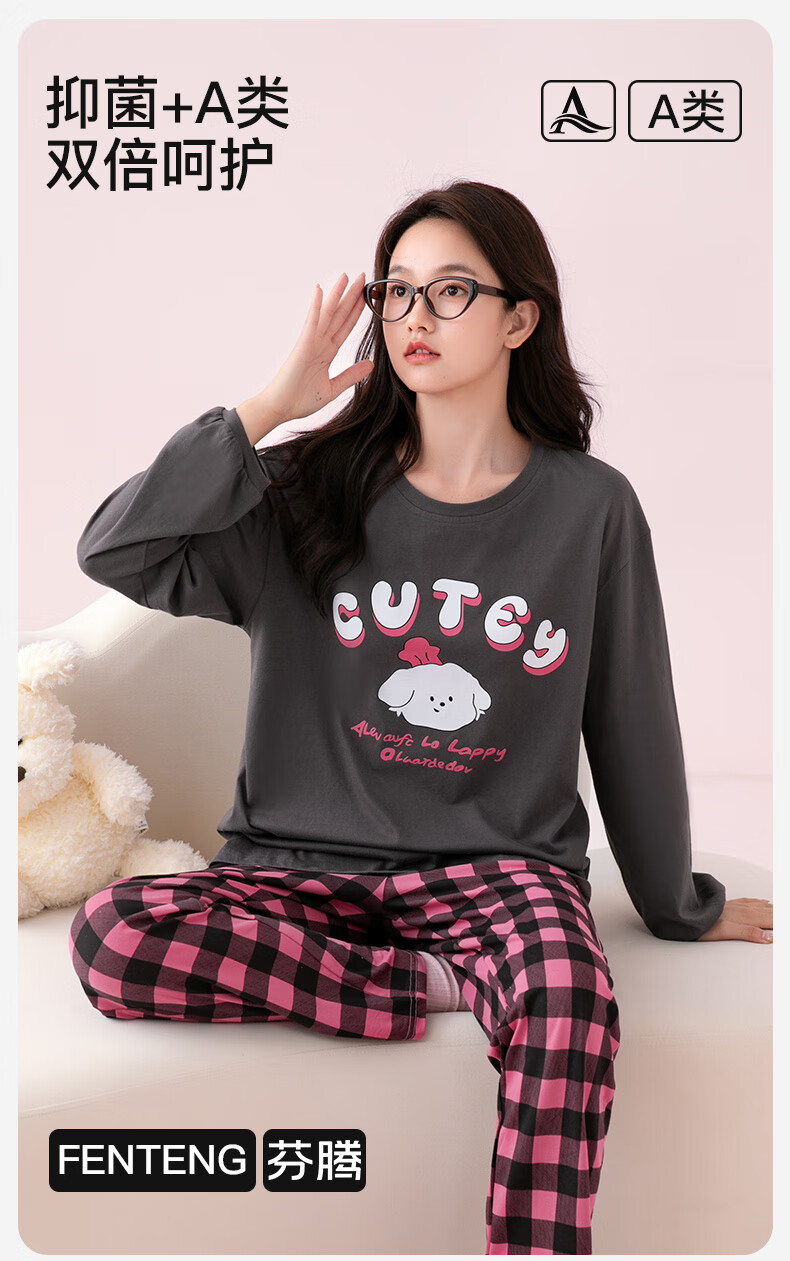 芬腾睡衣女A类纯棉7A抑菌2025秋新款圆领格纹少女感长袖家居服套装 深灰 M