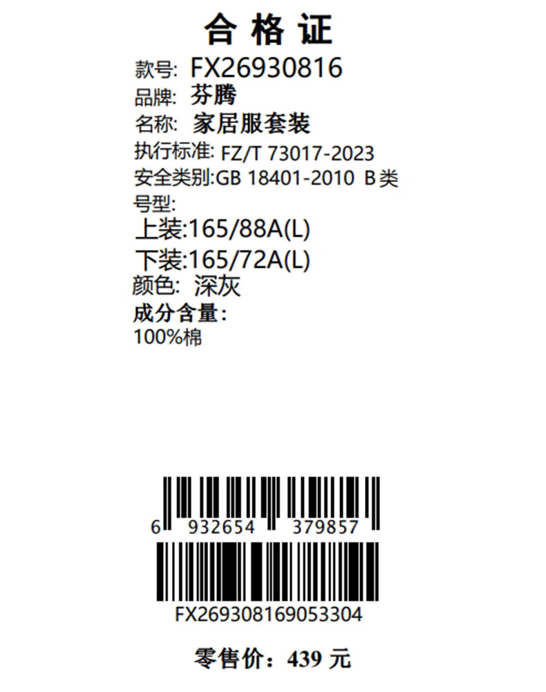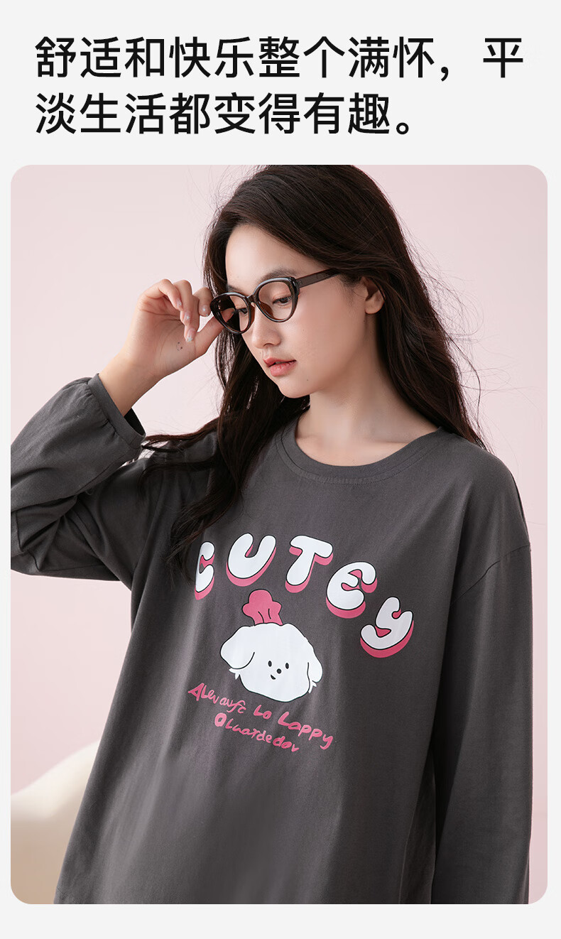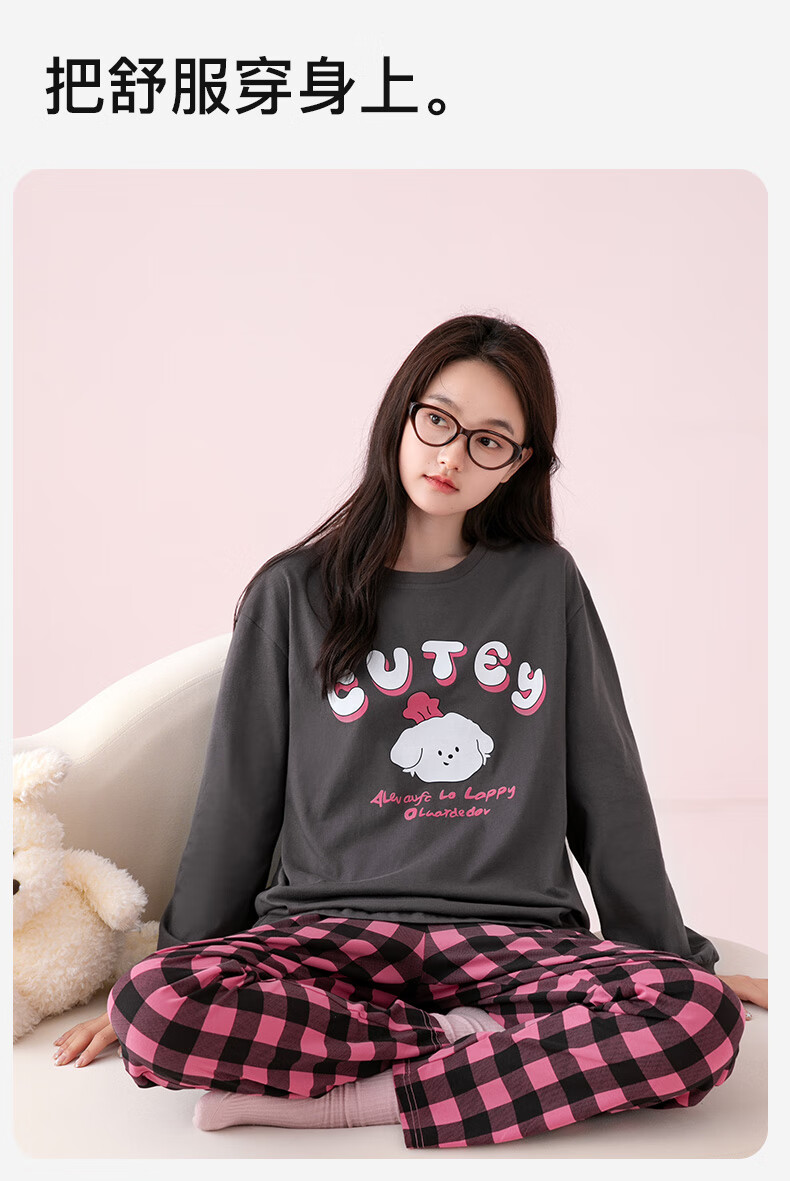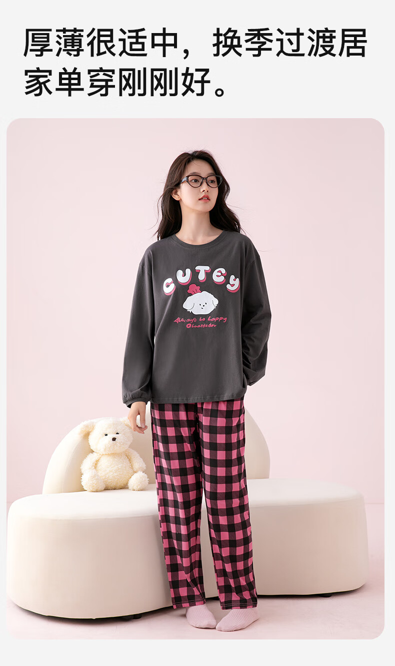 芬腾睡衣女A类纯棉7A抑菌2025秋新款圆领格纹少女感长袖家居服套装 深灰 M