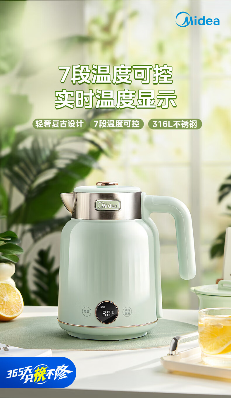 美的(Midea)艺术家电热水壶烧水壶自动断电保温一体1.7L大容量无缝电水壶316L不锈钢恒温7档温控53-Q