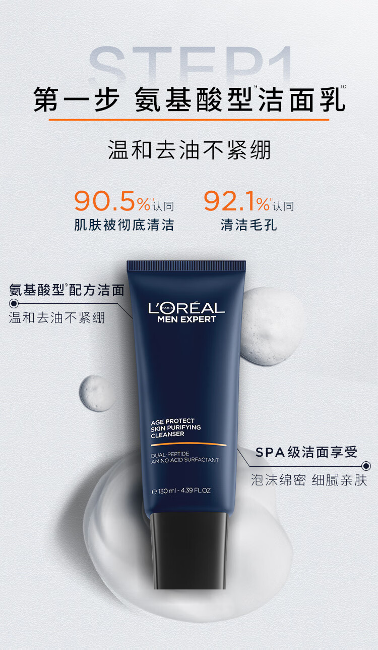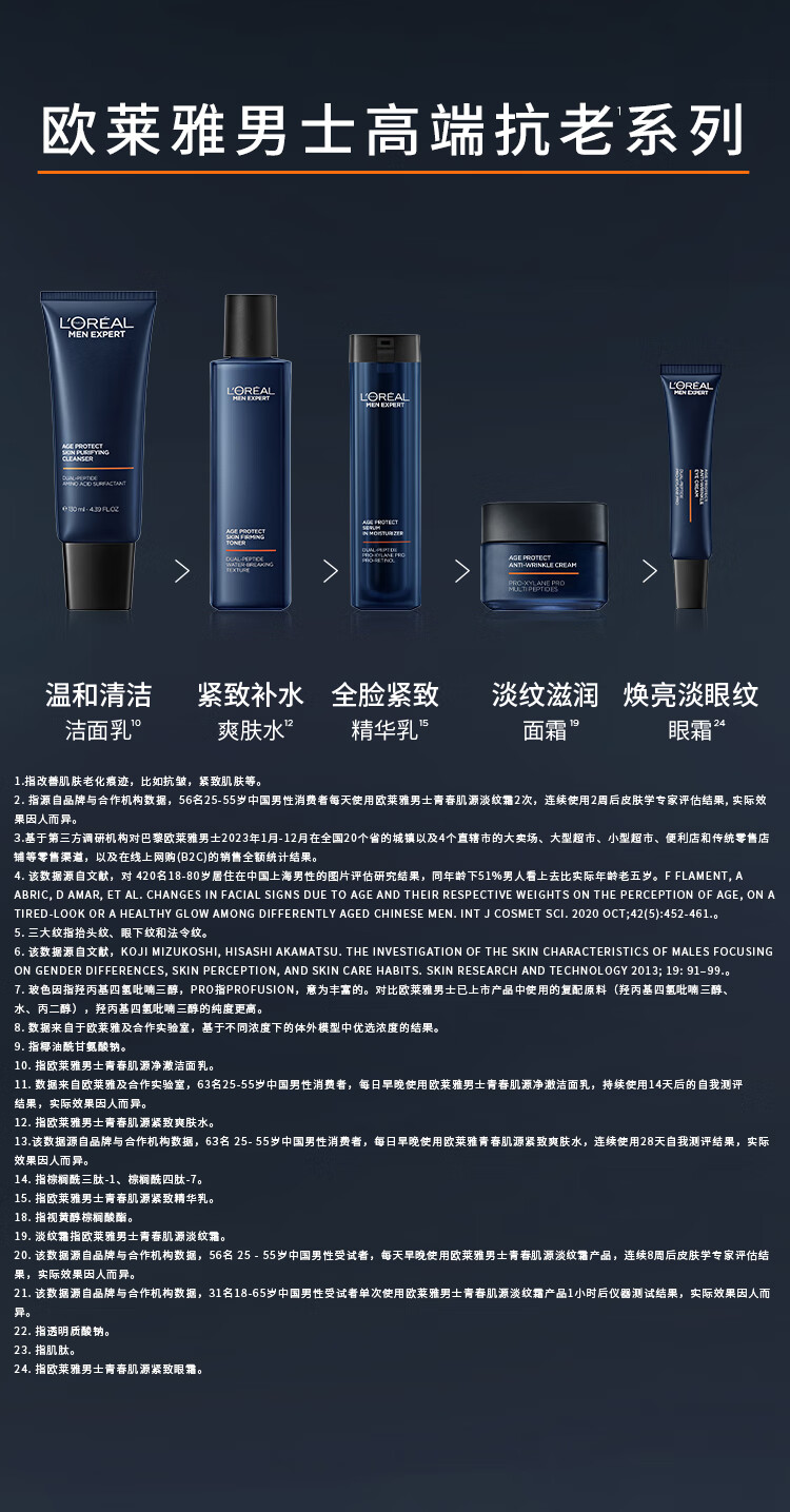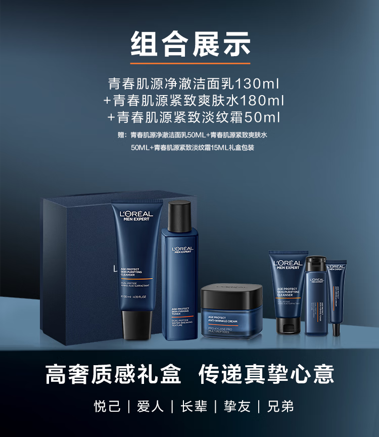 欧莱雅男士青春肌源洗面奶水霜三件套装抗皱紧致护肤品高档礼物礼盒男友