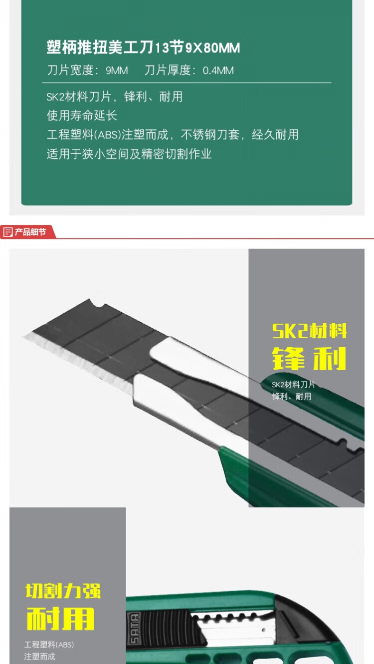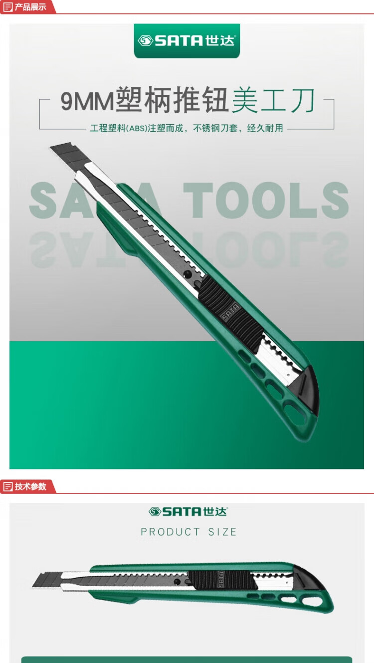 世达世达(SATA)塑柄推钮美工刀裁纸刀13节 9x80MM 93426