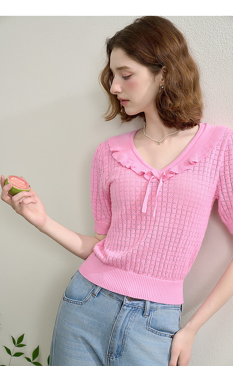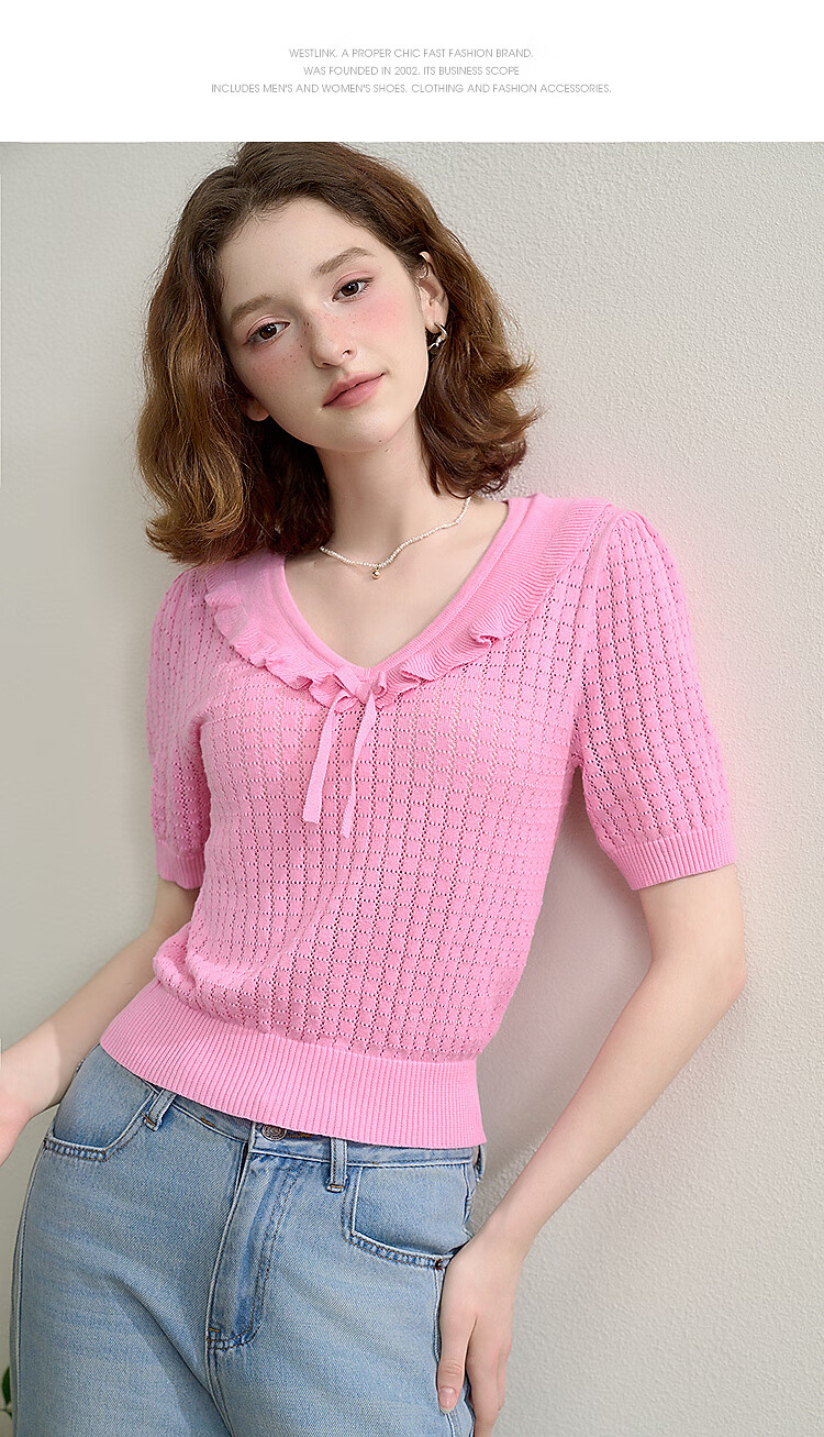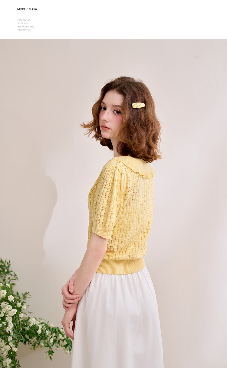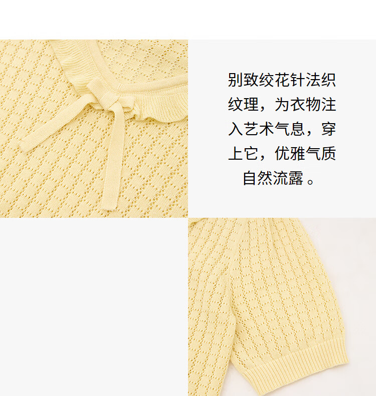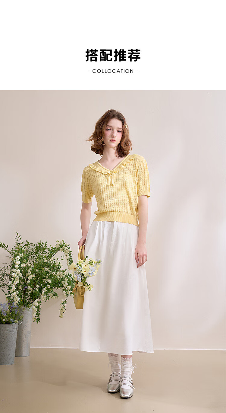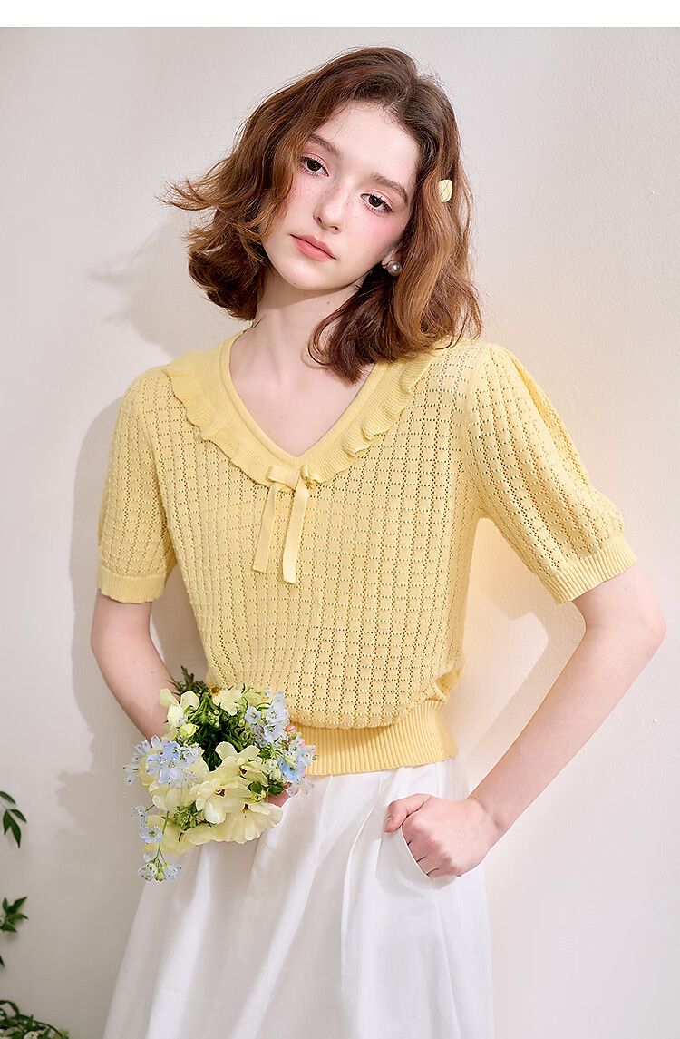 西遇甜美拼接荷叶边v领毛衣女2025春季短款针织衫 黄色 S (155)