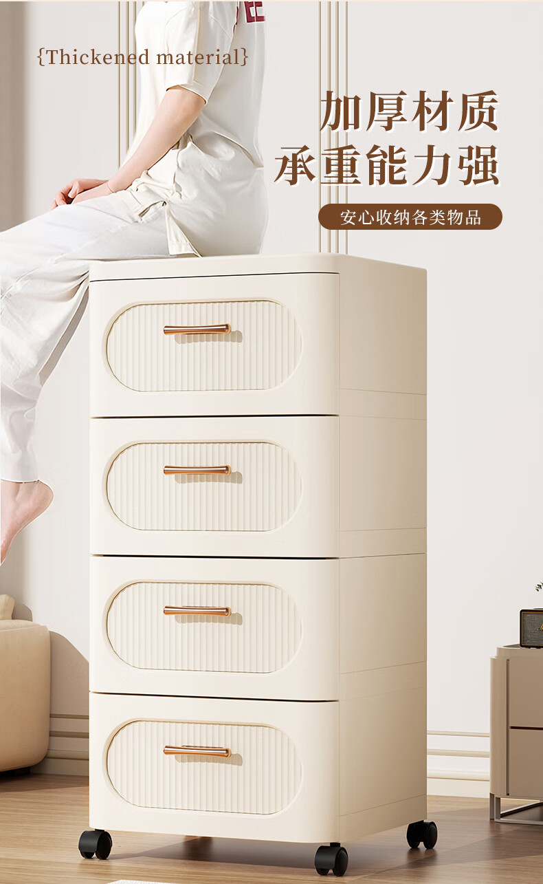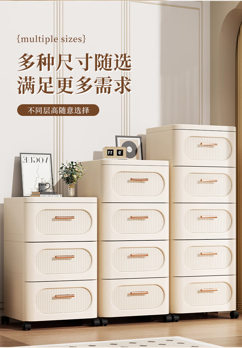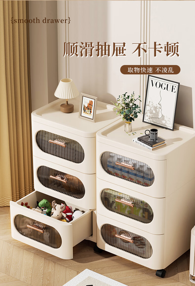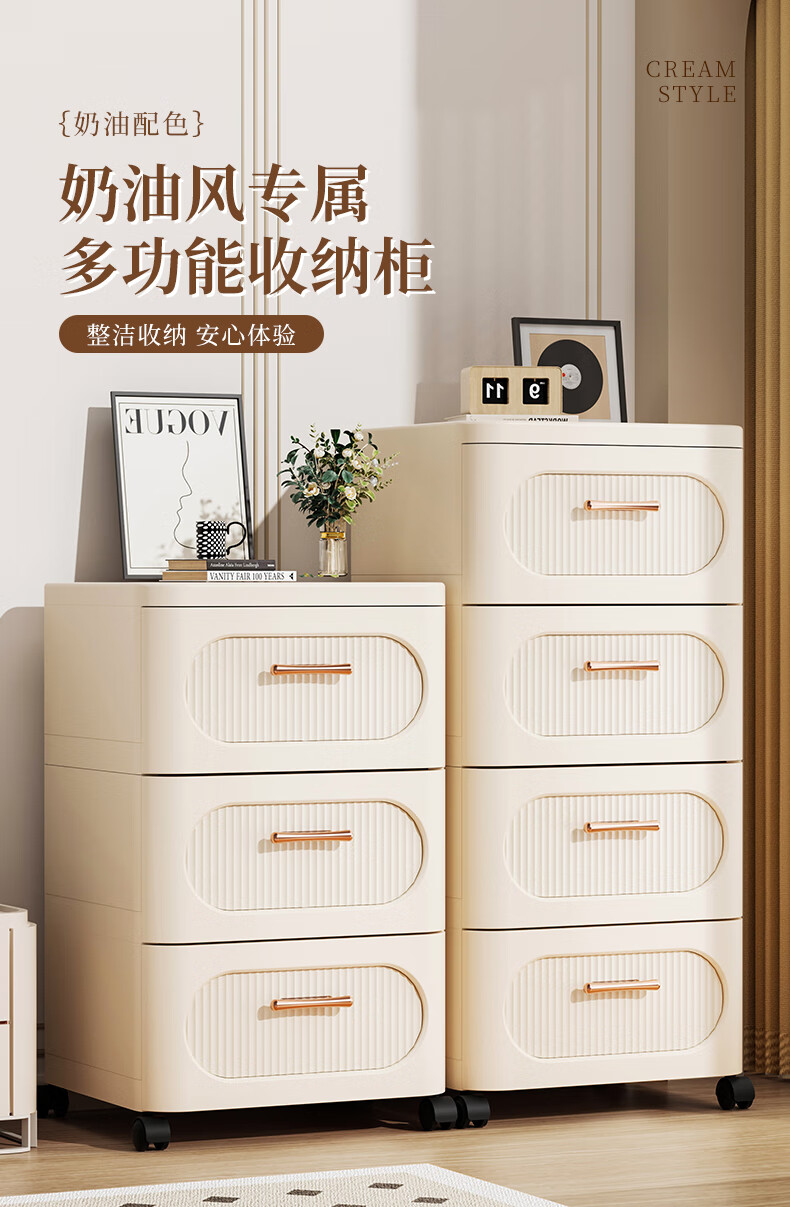 纳份爱加厚抽屉式收纳柜家用卧室床头柜客厅五斗柜夹缝储物柜置物柜 奶油风-3层 35CM面宽 送静音可锁轮